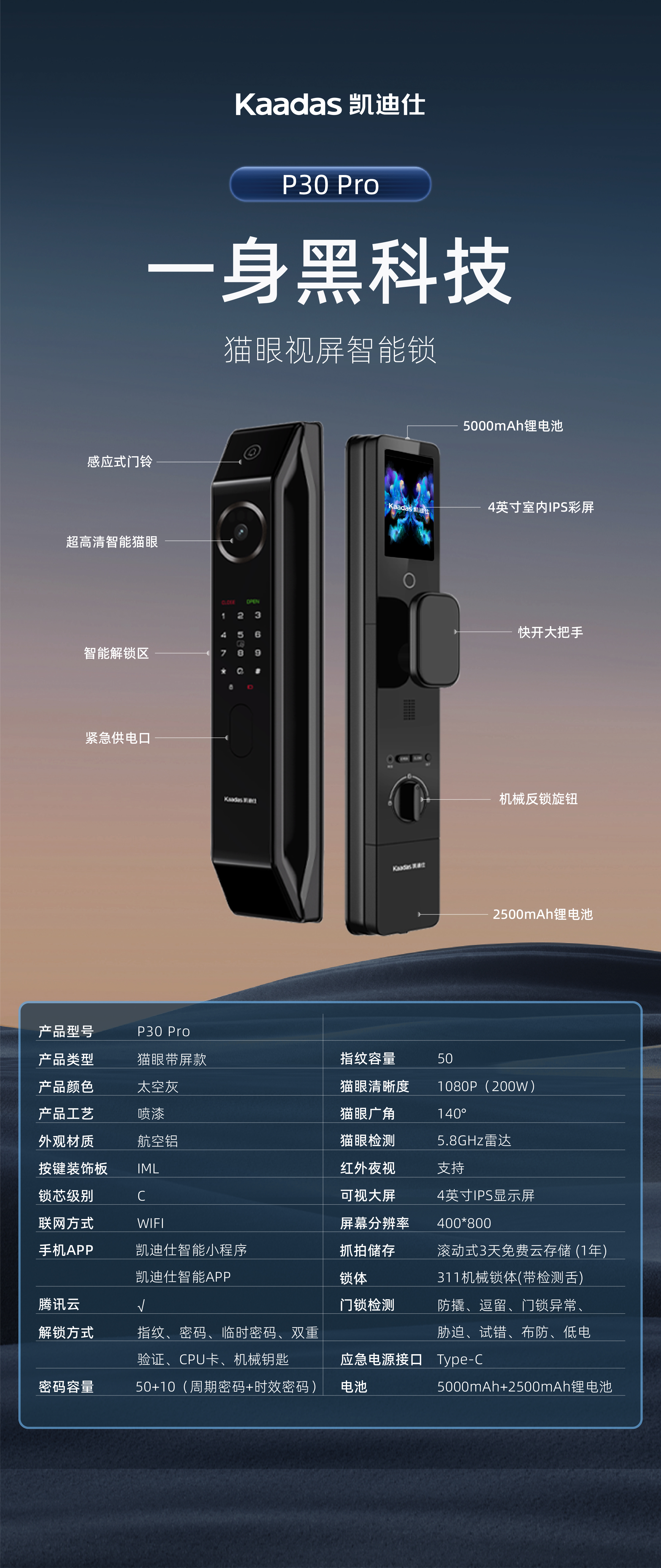 【四川】凯迪仕(Kaadas)P30 Pro 五红外夜视猫眼侦测全自动防盗门电子锁指纹锁密码门锁 太空灰 P30 Pro【智能猫眼+大屏】