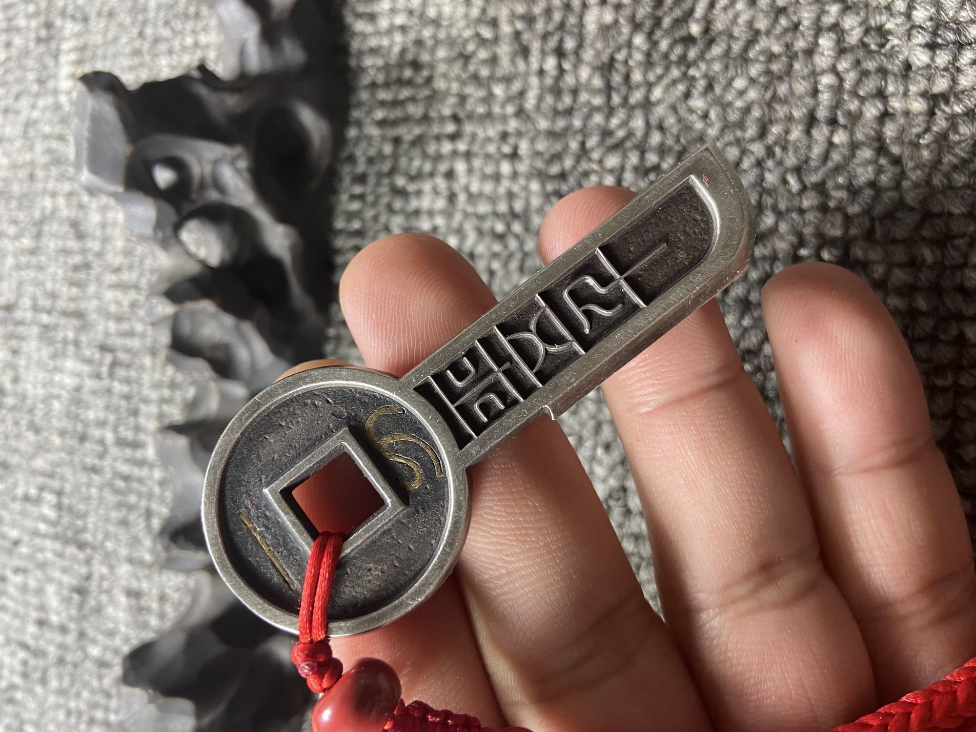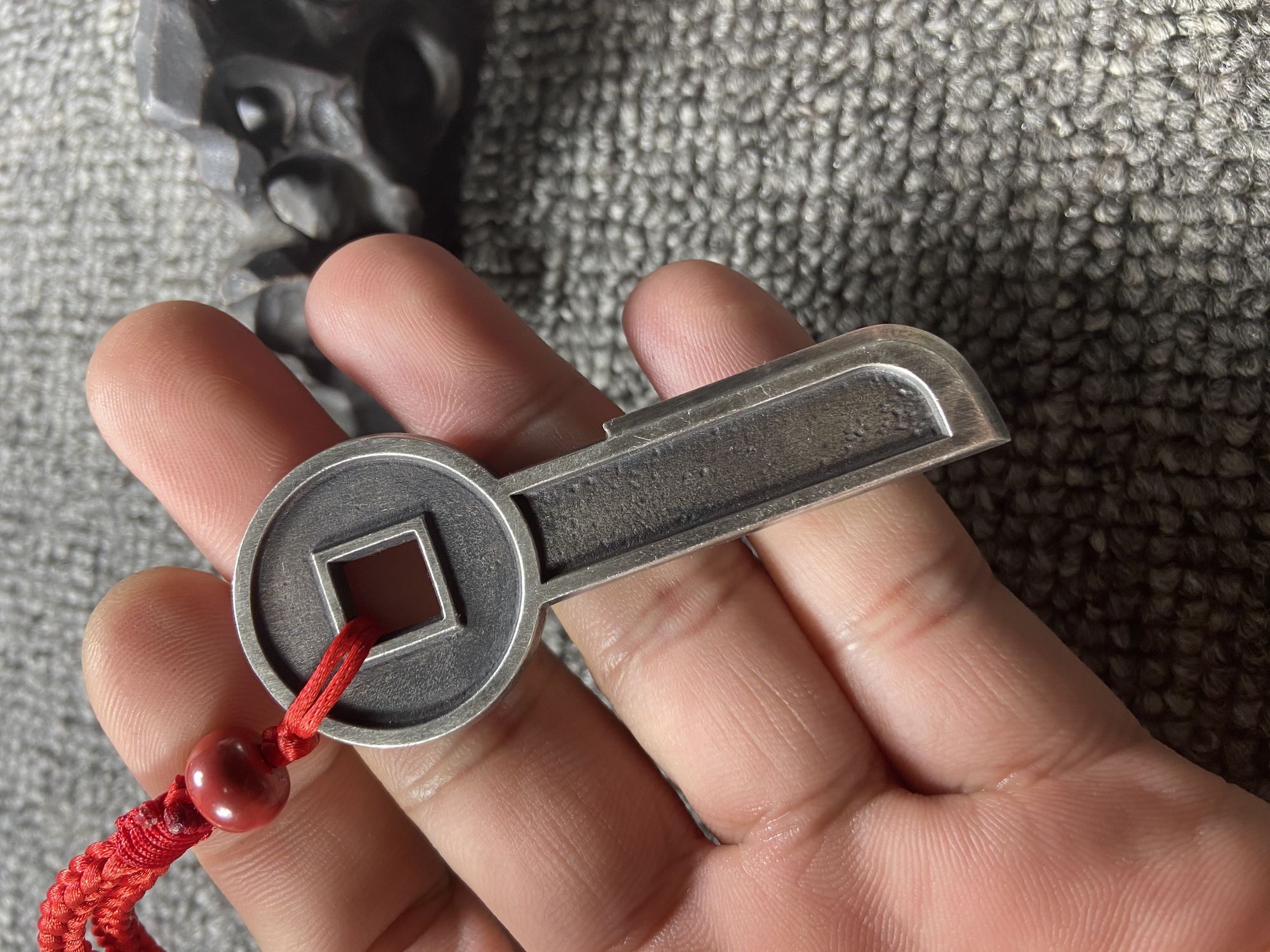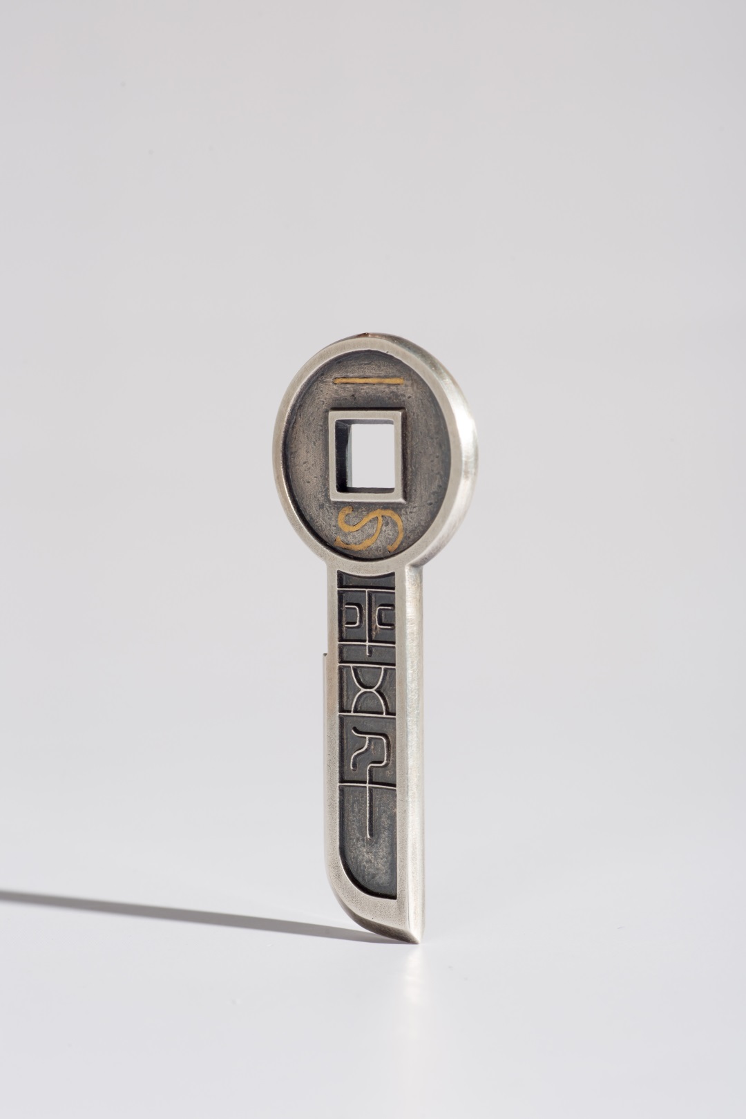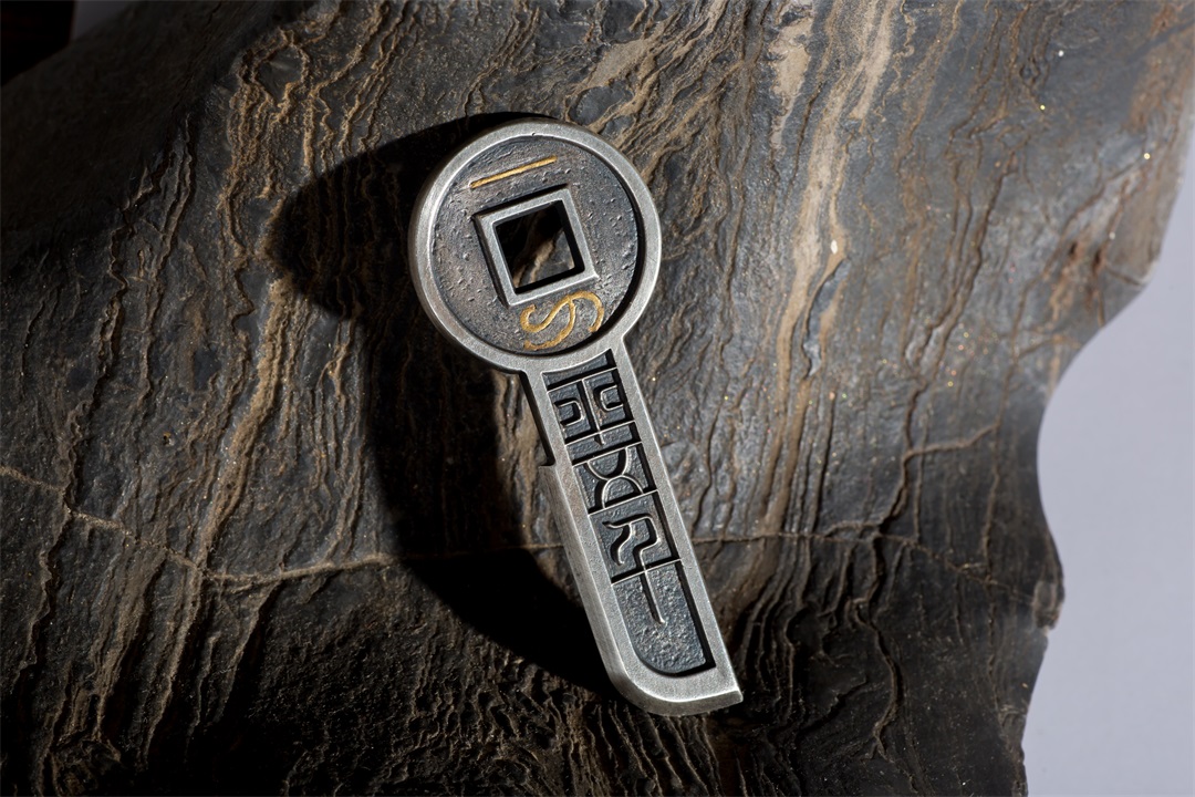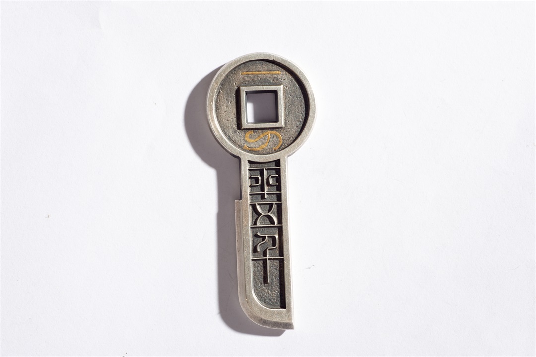 930矿银制作,高约72.5毫米,方孔钱币直径约29毫米,底部宽约14毫米,厚约3.5毫米,孔径约7毫米,重约31.5克,镶嵌纯金金丝重约0.3克。(以上数据手工测得,手工作品有少许误差,请知晓),