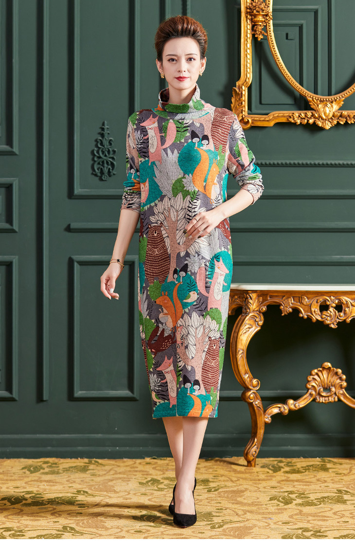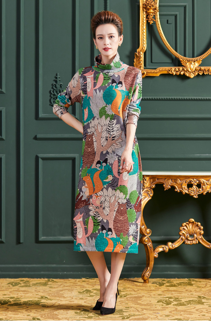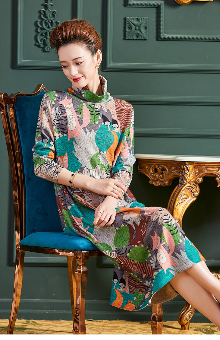 宽松针织,套头中长款纯羊毛印花连衣裙WY-L7101