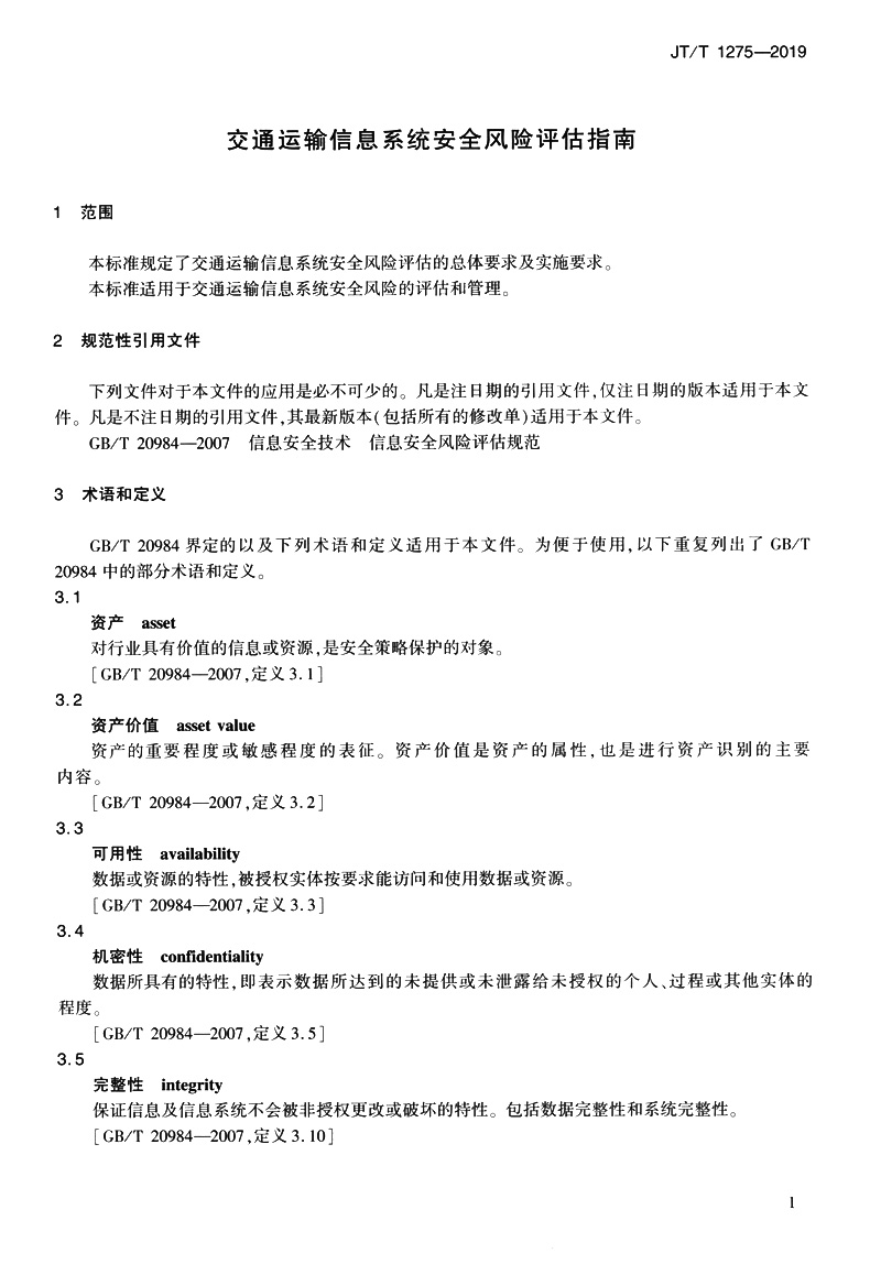 交通运输行业信息系统安全风险评估指南(JT/T 1275—2019)