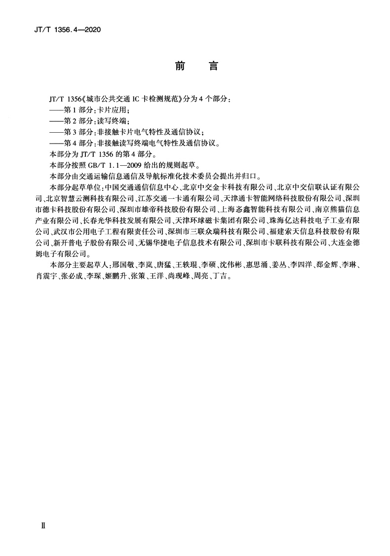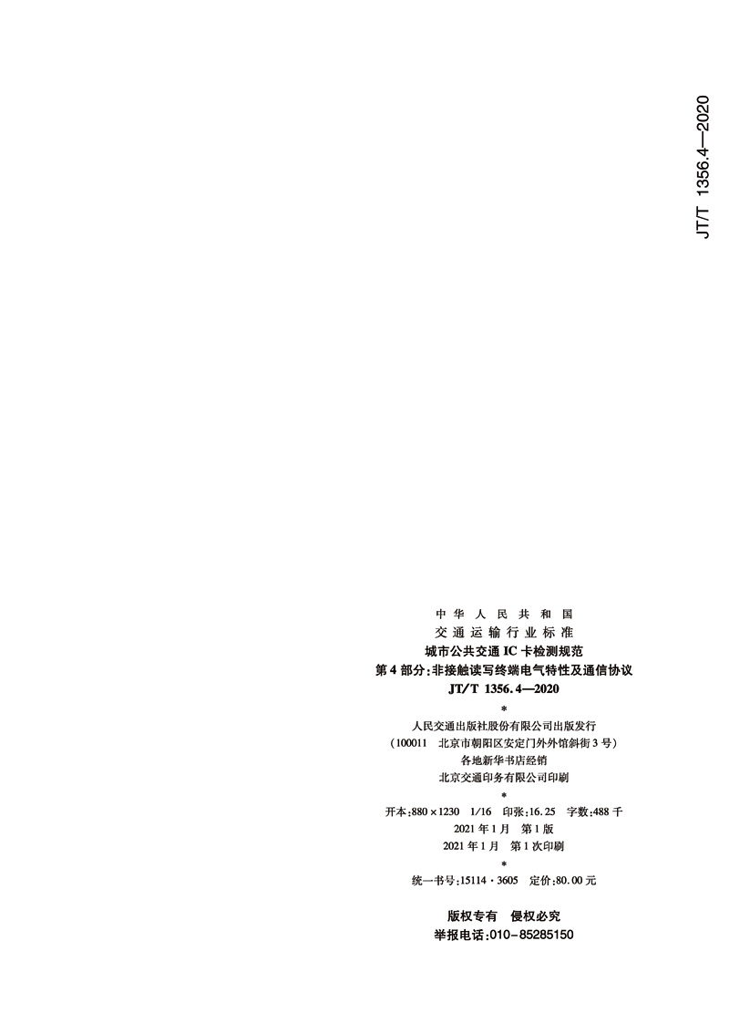 书名:城市公共交通IC卡检测规范 第4部分:非接触读写终端电气特性及通讯协议(JT/T 1356.4—2020)