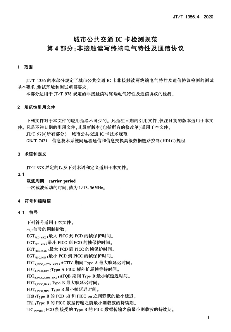 城市公共交通IC卡检测规范 第4部分:非接触读写终端电气特性及通讯协议(JT/T 1356.4—2020)