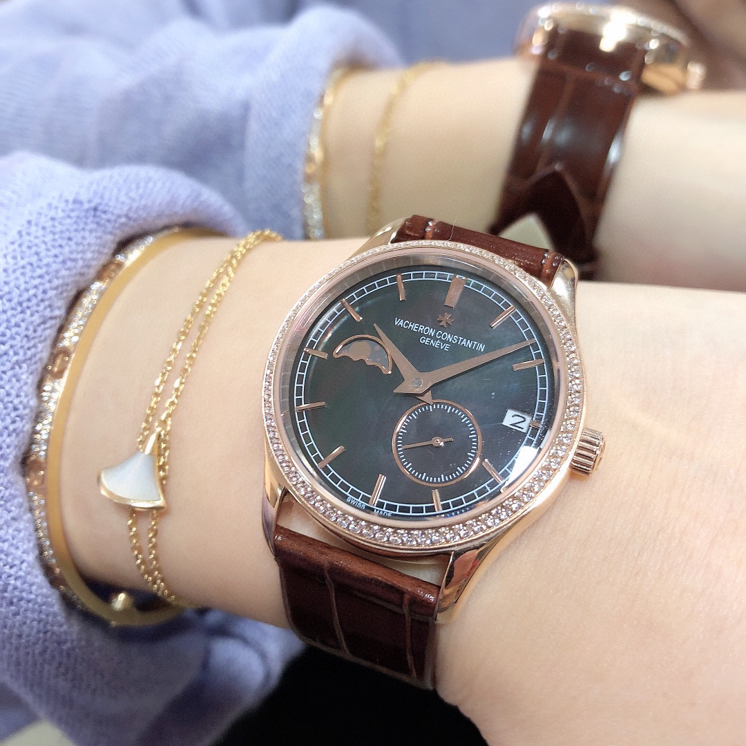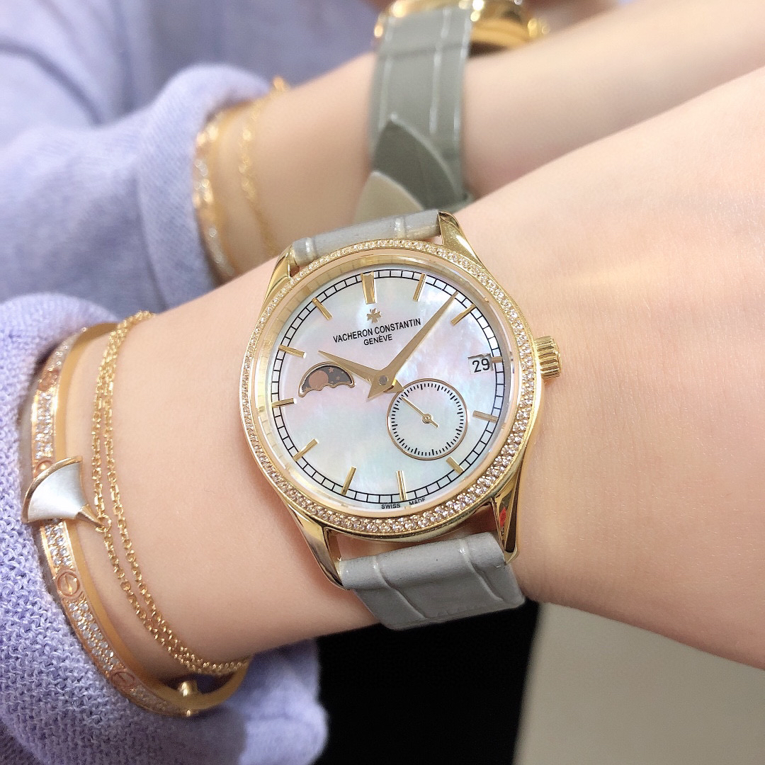 一款女王腕表、微距下说不出的优美、用江诗丹顿致您的誓爱!专门研发定制出来的一款高端大气时尚新品(指针的细腻,配合贝母表盘,更显美感.月相以及镶嵌进贝母的金边,完美契合.贝母表盘定制在不同的光线下会有不同的效果,江诗丹顿.魂牵梦绕)