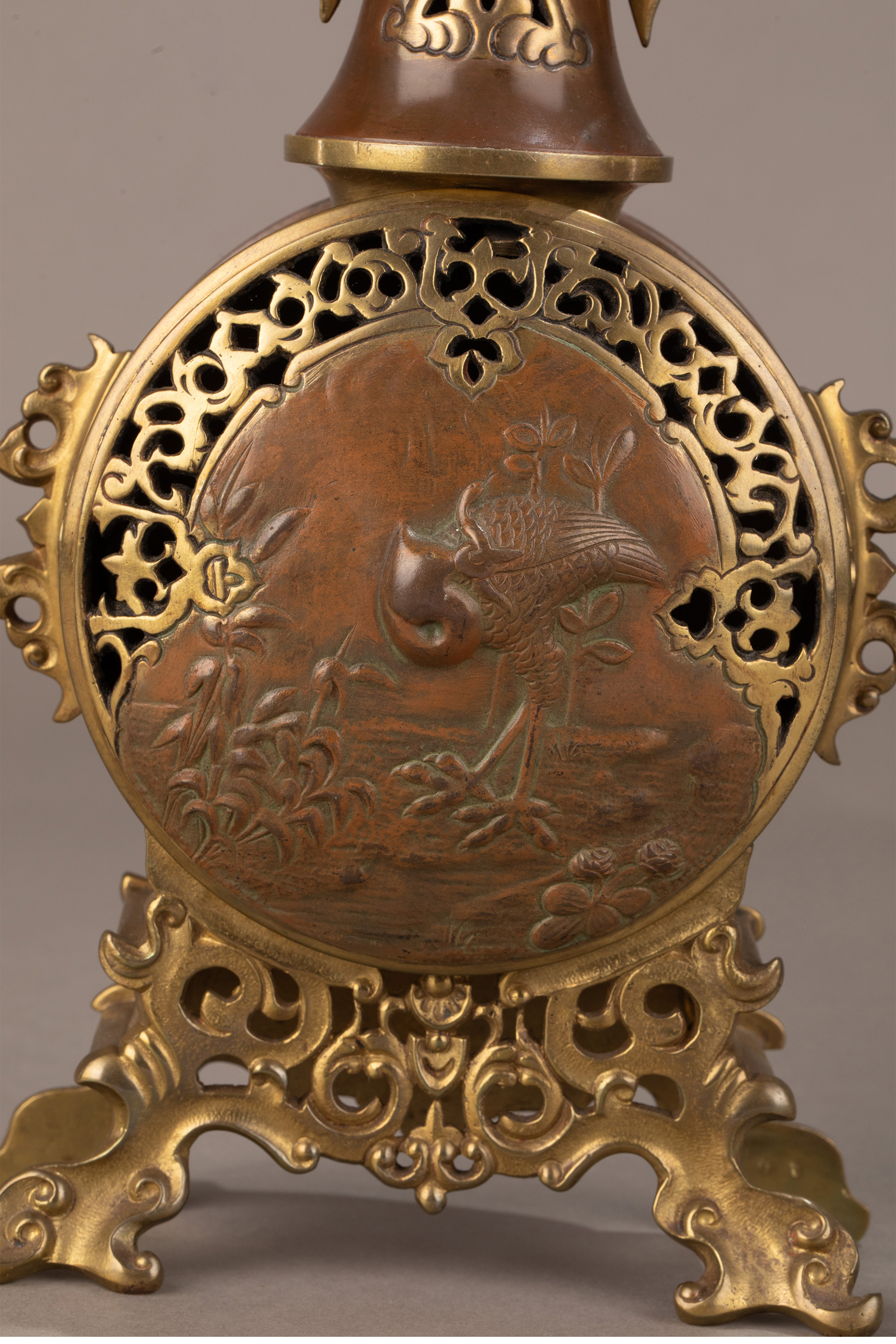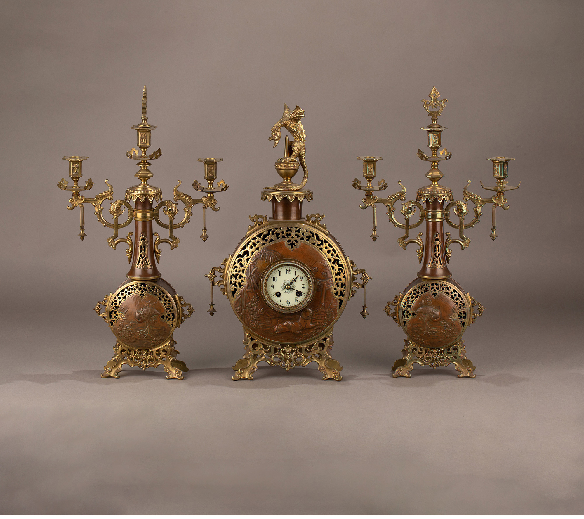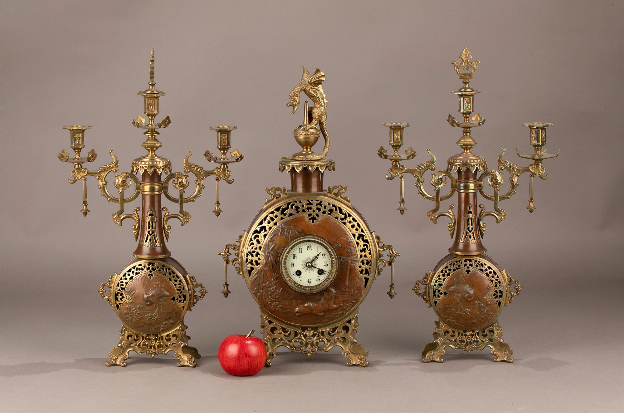 19世纪晚期法国钟表匠出品东方风格花鸟主题铜鎏金装饰座钟烛台三件套
