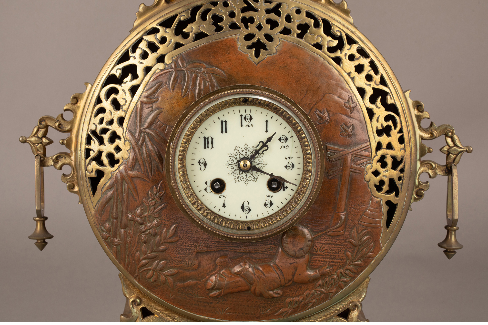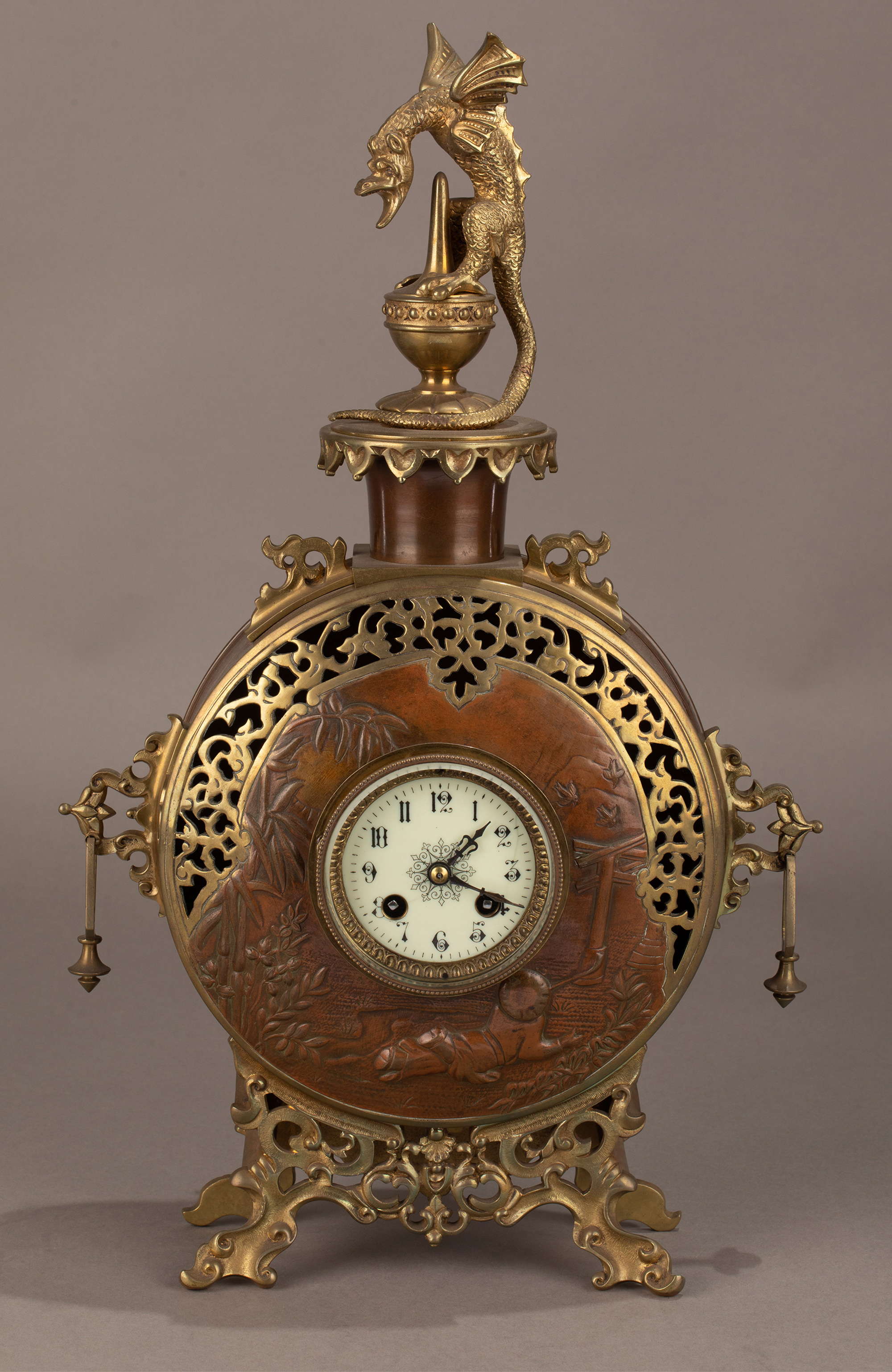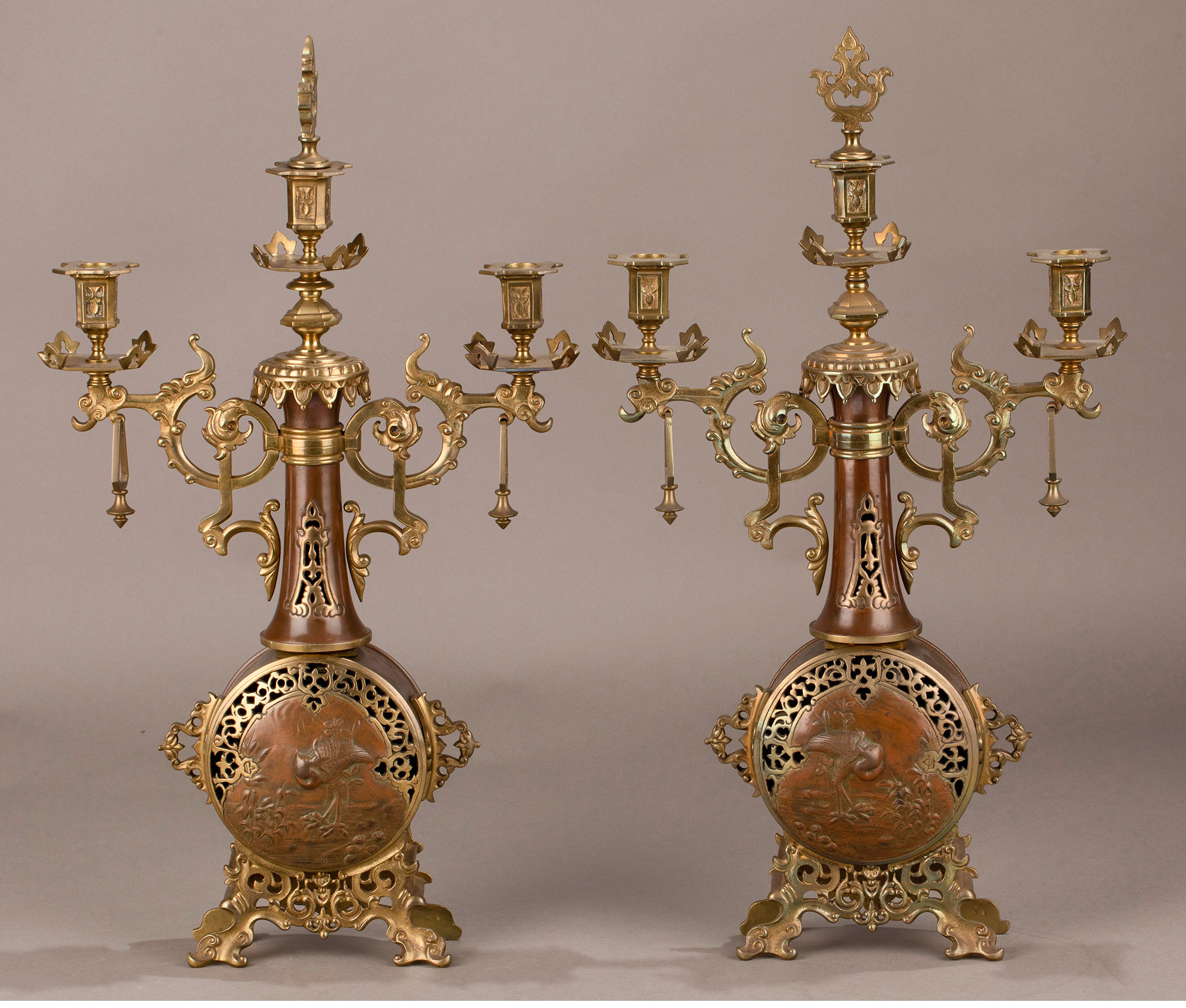 19世纪晚期法国钟表匠出品东方风格花鸟主题铜鎏金装饰座钟烛台三件套