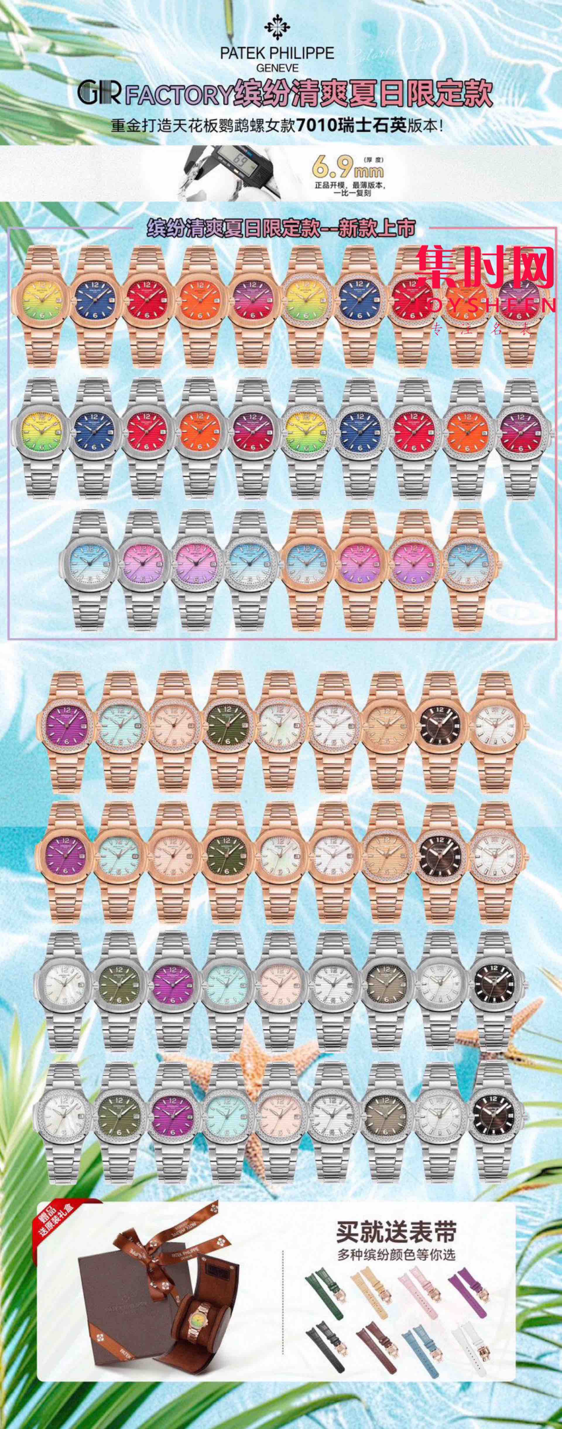 PP百达翡丽 重金打造 GR鹦鹉螺7010系列 女士石英腕表 0误差0故障,自带或送礼再无后顾之忧。原版尺寸:32mm表盘直径,6.9mm厚度。搭载瑞士进口石英机芯。此款鹦鹉螺女款不仅拥有男表的优雅运动风格,还增加了几分柔美、使得女装腕表更加个性时尚,也是当下热门的PP女士腕表之一!表壳316L精钢镶钻46颗明亮式奥宝水钻,6.9mm厚度真正做到薄如蝉翼,整表真空颅内白金及玫瑰金双色任选,带来非凡触感与视觉享受,呈现璀璨光泽!