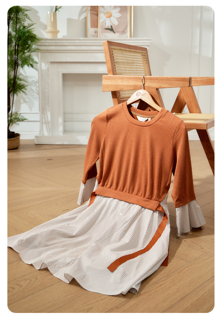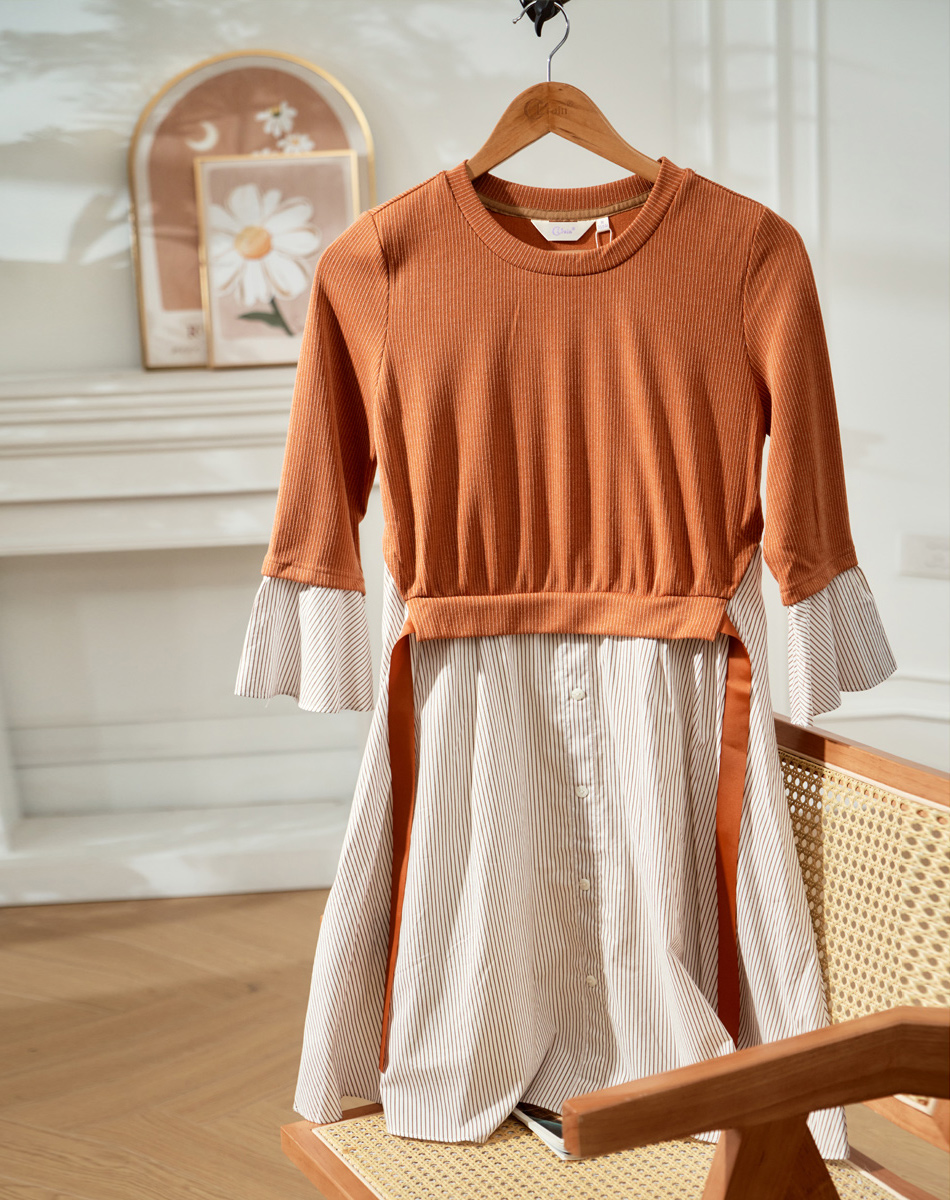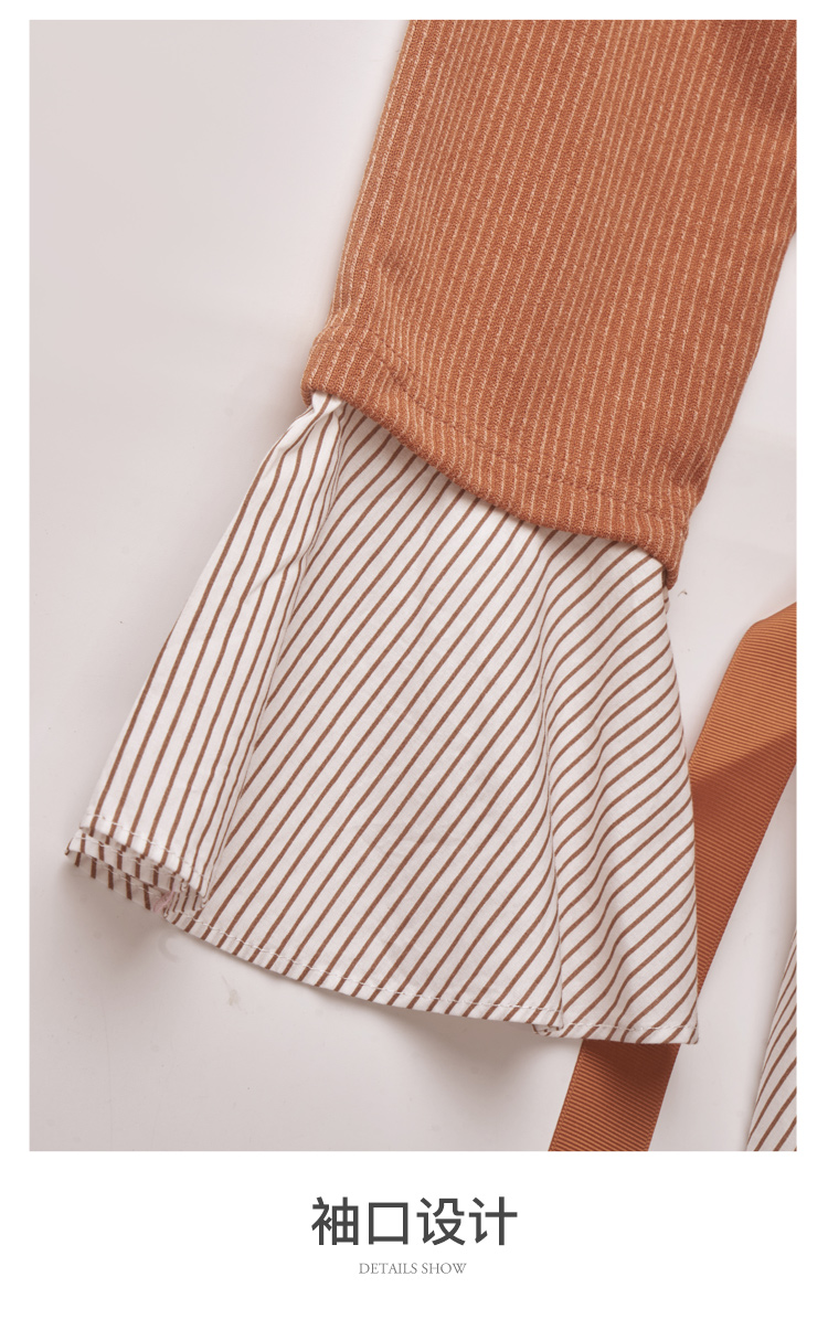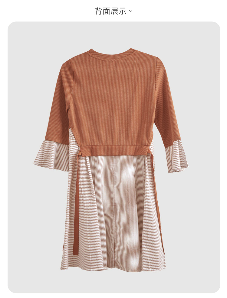 欧芮儿春假两件连衣裙女中长款收腰弹力针织上衣连衣裙针织条纹喇叭袖裙子