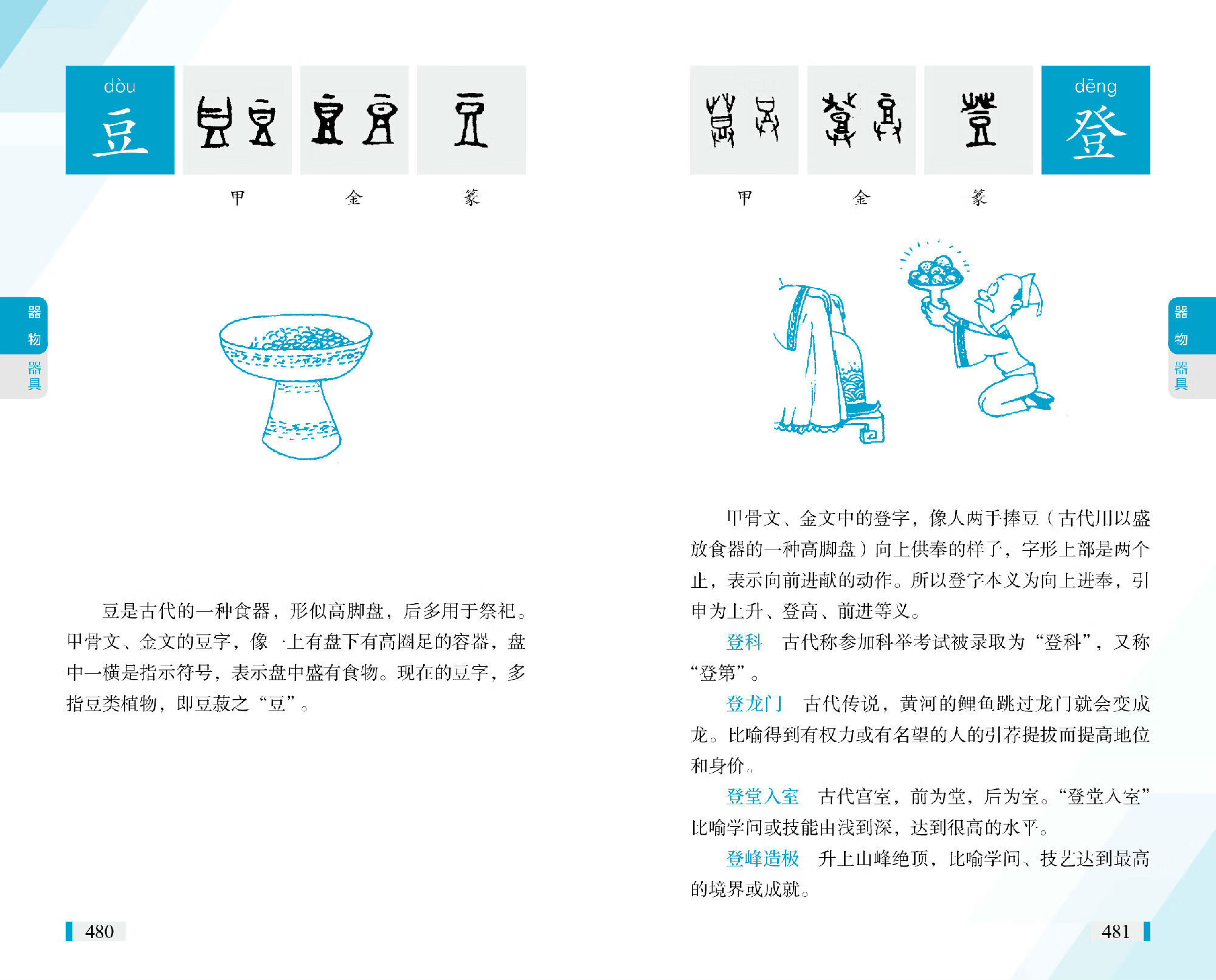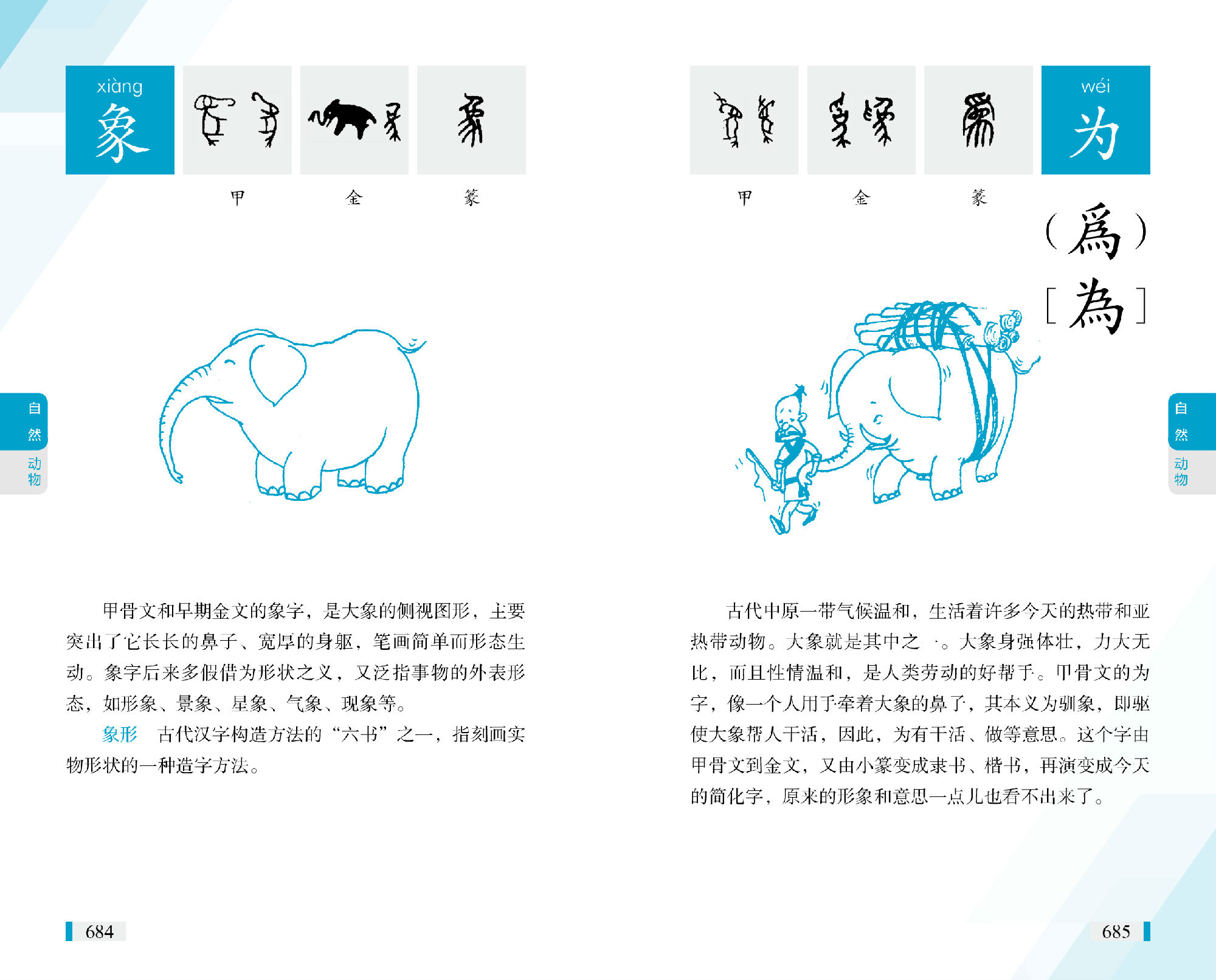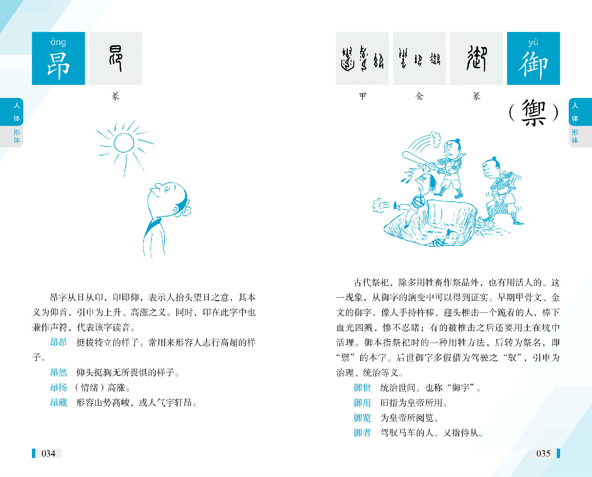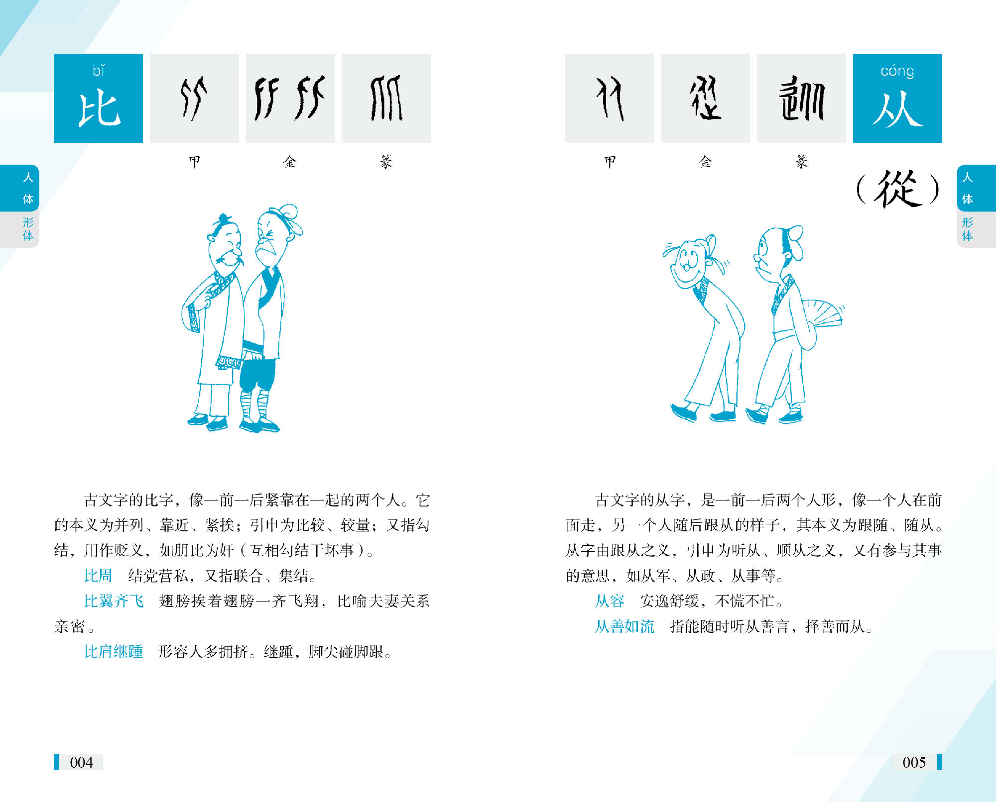 本书所收的字绝大部分都是常用字。我们把这些汉字分别归属于人体(形体、器官),器物(器具、建筑),自然(动物、植物、天文、地理),其他四大类。全书按义类排列,每一类中又将意义相关的字排列在一起。通过这样的分类和排列,能使读者更清晰地了解早期汉字的造字规律和特点,即所谓的“近取诸身(人体),远取诸物(器具、建筑)”,“仰则观象于天(天文),俯则观法于地(地理),观鸟兽之文(动物)与地之宜(植物)”。