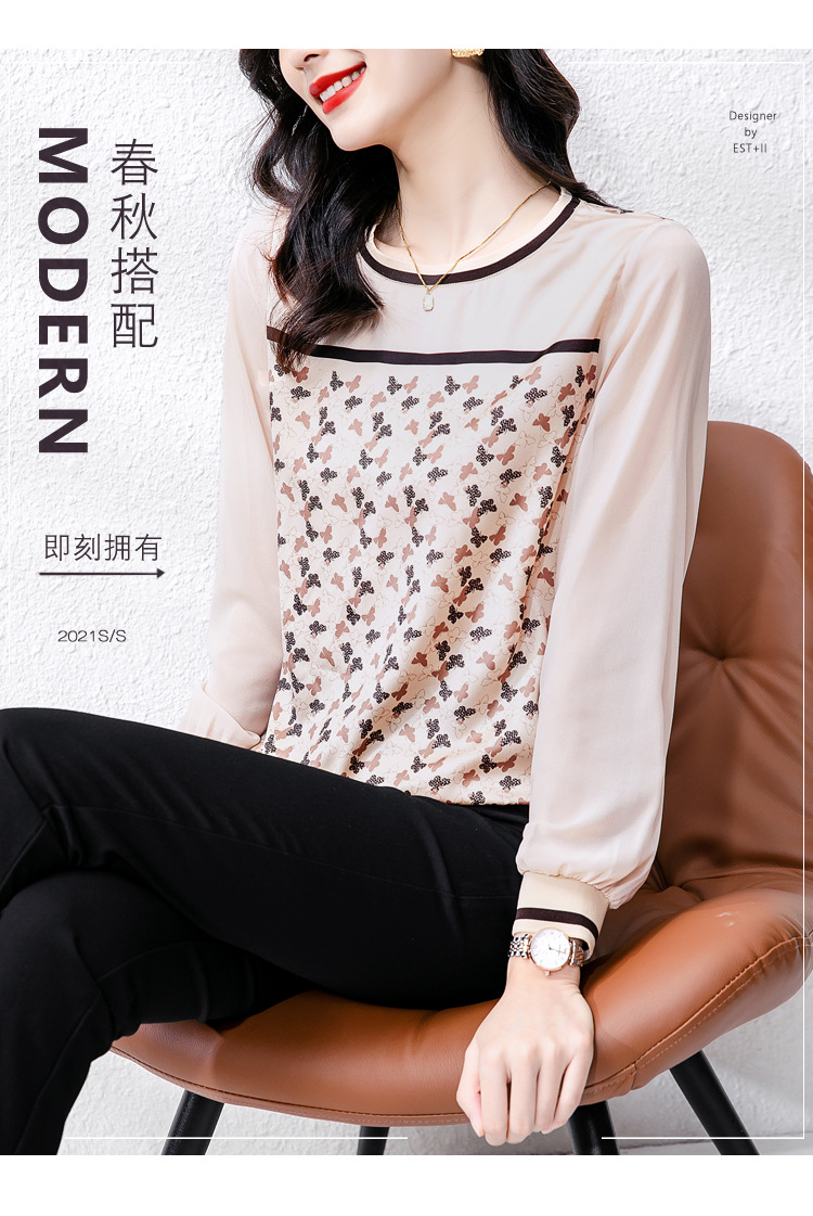 秋季新款,百搭垂感仿真丝秋季印花长袖宽松拼接气质T恤上衣KQL-762G029