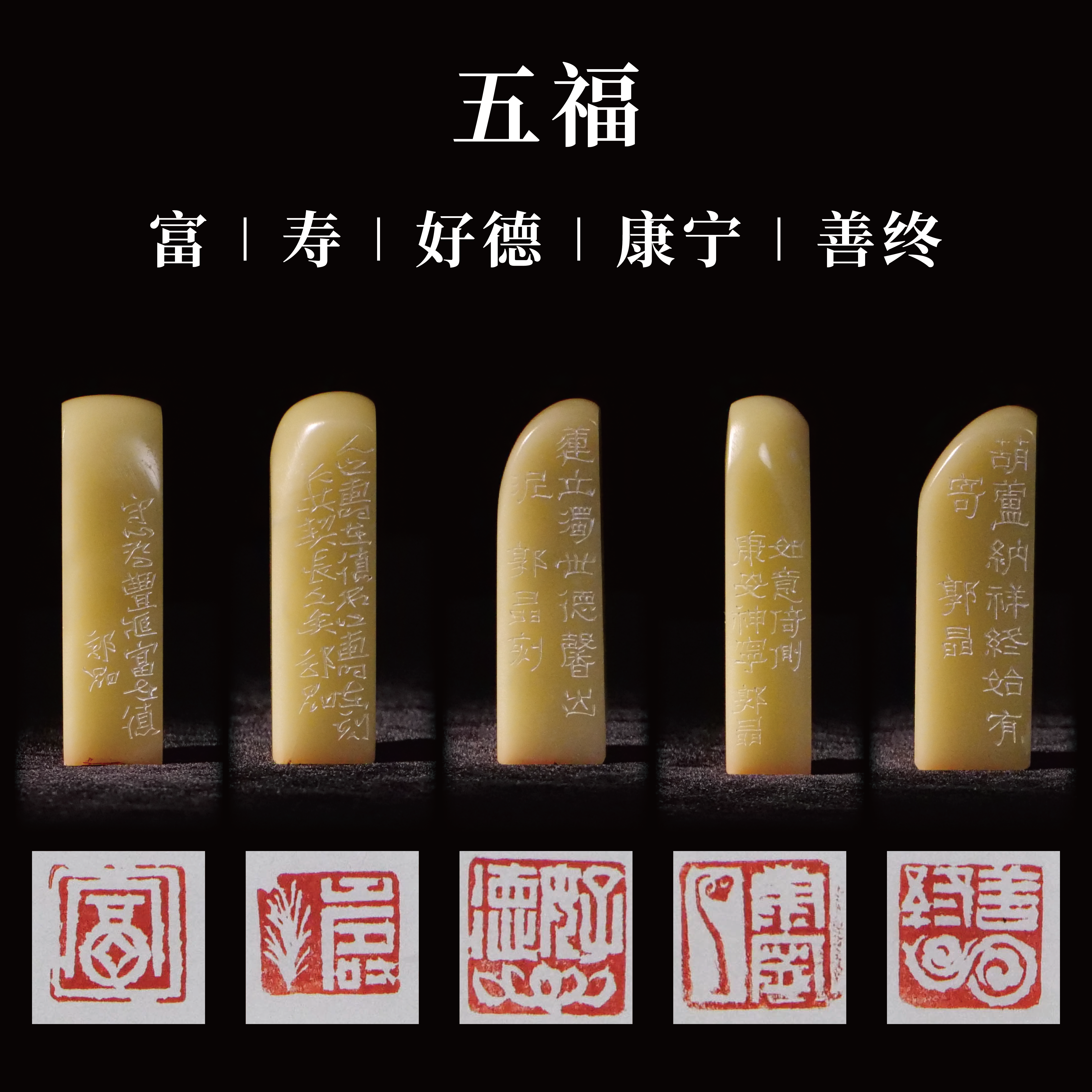 郭晶丨五福-寿 富 康宁 好德 善终 手工篆刻印章作品[套系]