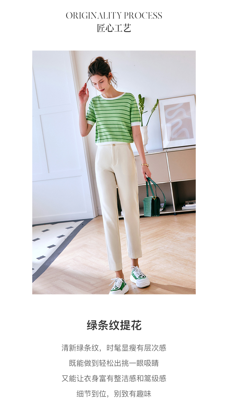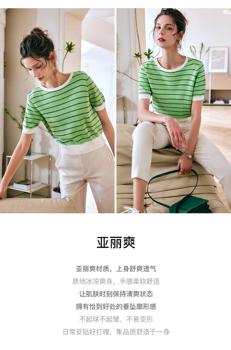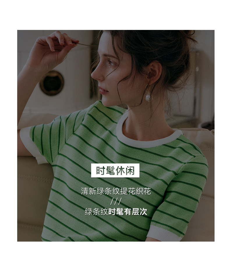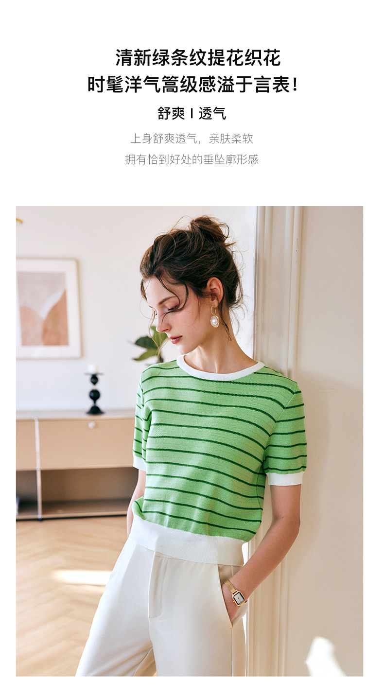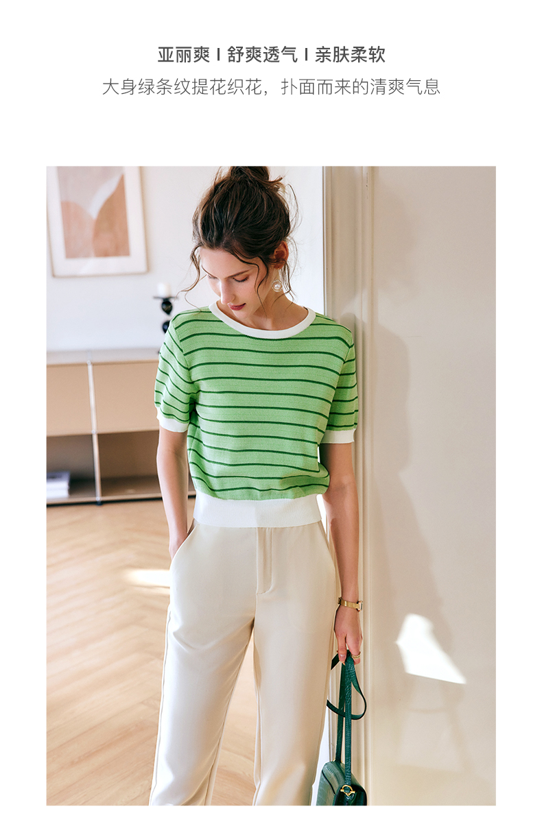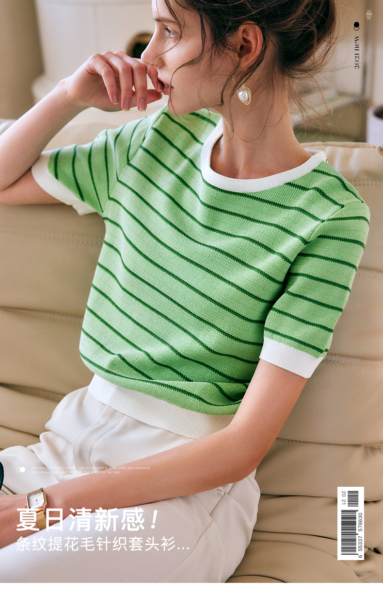 OLrain法式高级穿搭条纹针织衫女夏季2022年新款圆领修身薄款上衣