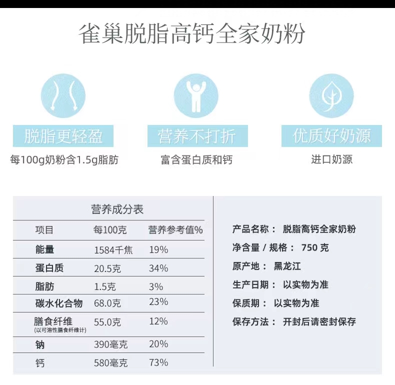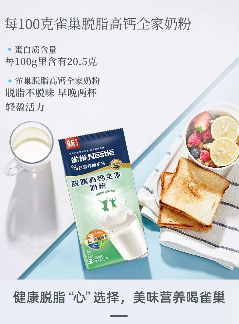 雀巢每日营养加脱脂高钙全家奶粉750g袋装