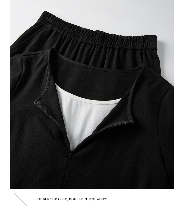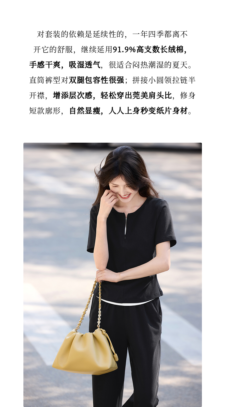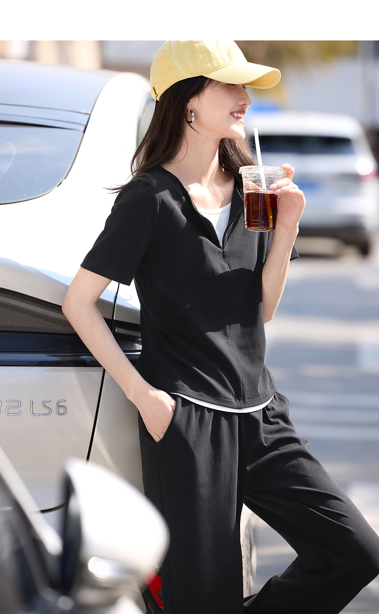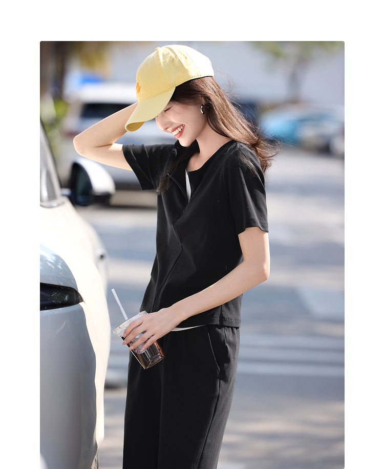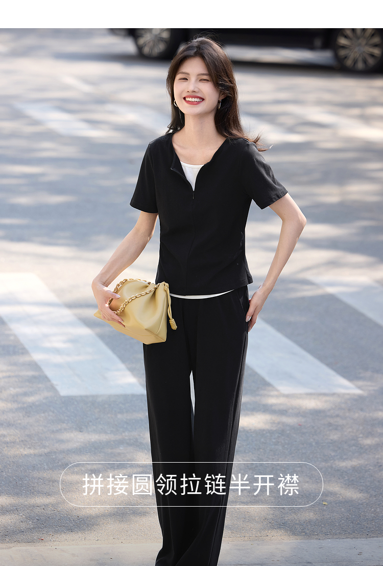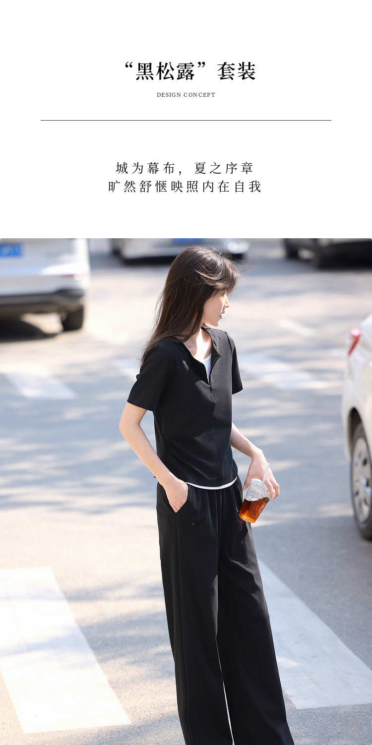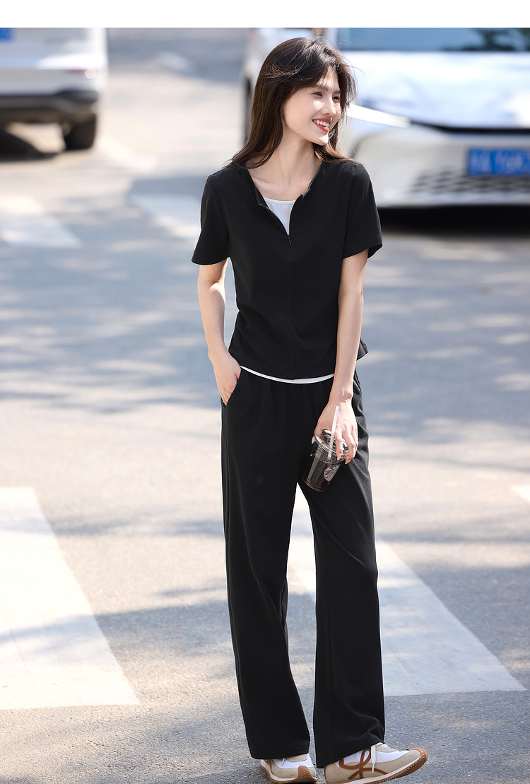 【专属特价】熙世界黑色休闲套装女2025夏新款设计感短袖T恤运动直筒裤两件套