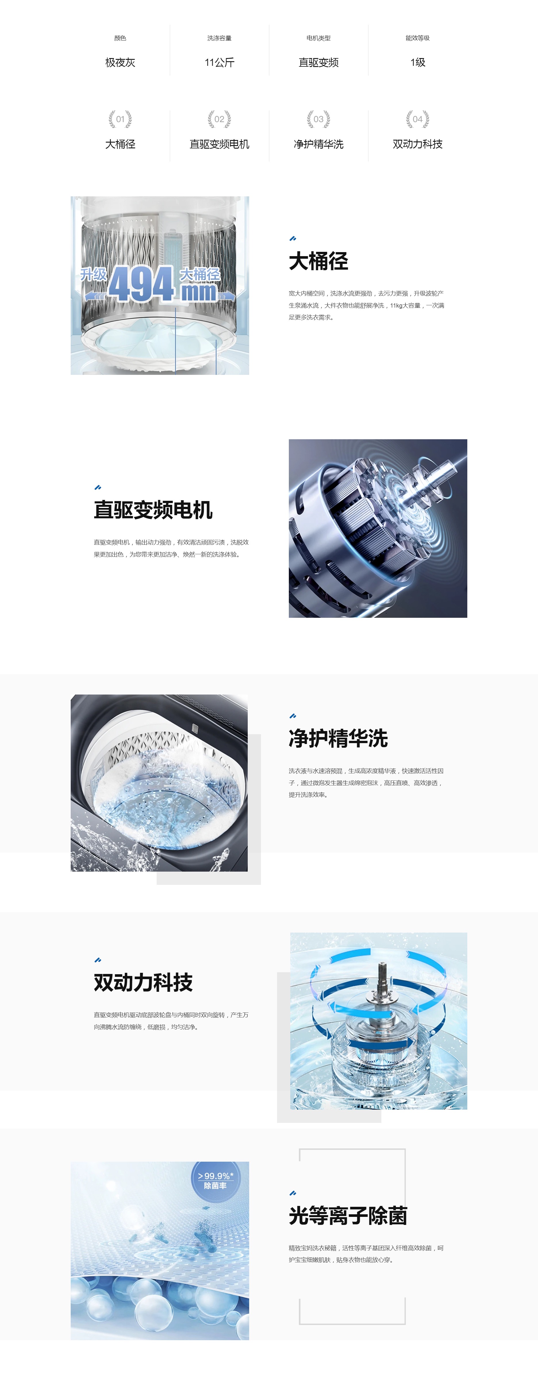 海尔 洗衣机 XQS110-MBDEV77A8 11KG 波轮 变频 一级能效 健康下排水 水电分离 童锁功能 极夜灰