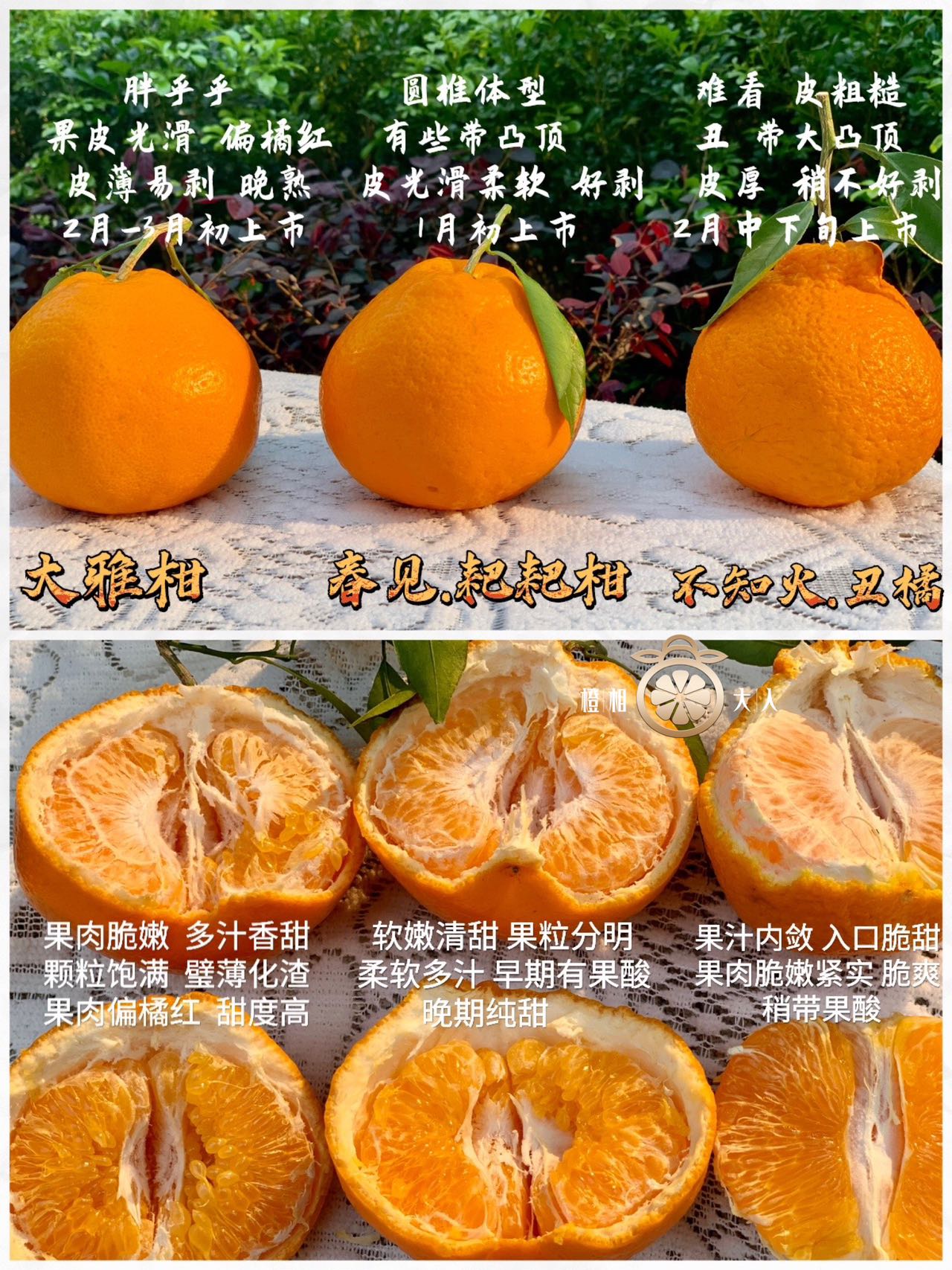 大雅柑成熟更晚,果肉薄且颜色呈橘红色,果皮细腻光滑,果型胖乎乎下大上下呈圆锥形。春见耙耙柑早期果皮颜色偏黄后期橘黄色,果型有些呈圆锥形,个别有顶。不知火丑橘,果面粗糙,每一个果子像”戴了帽子“一样。