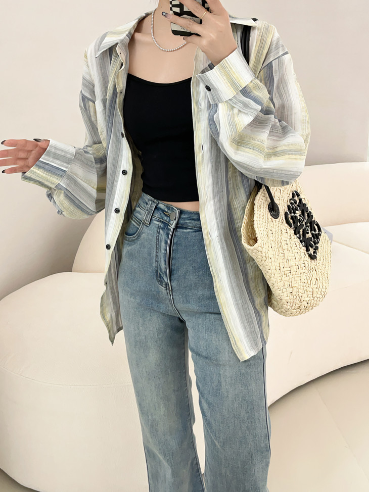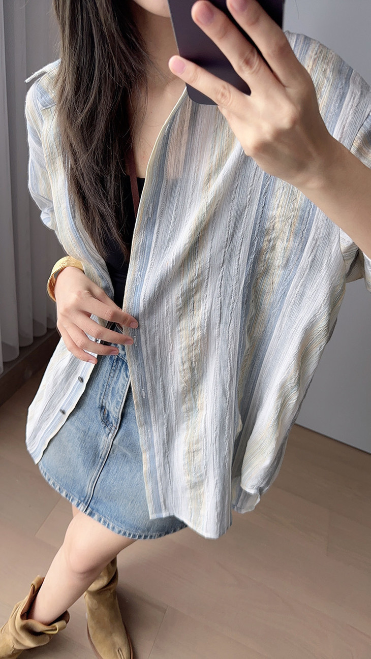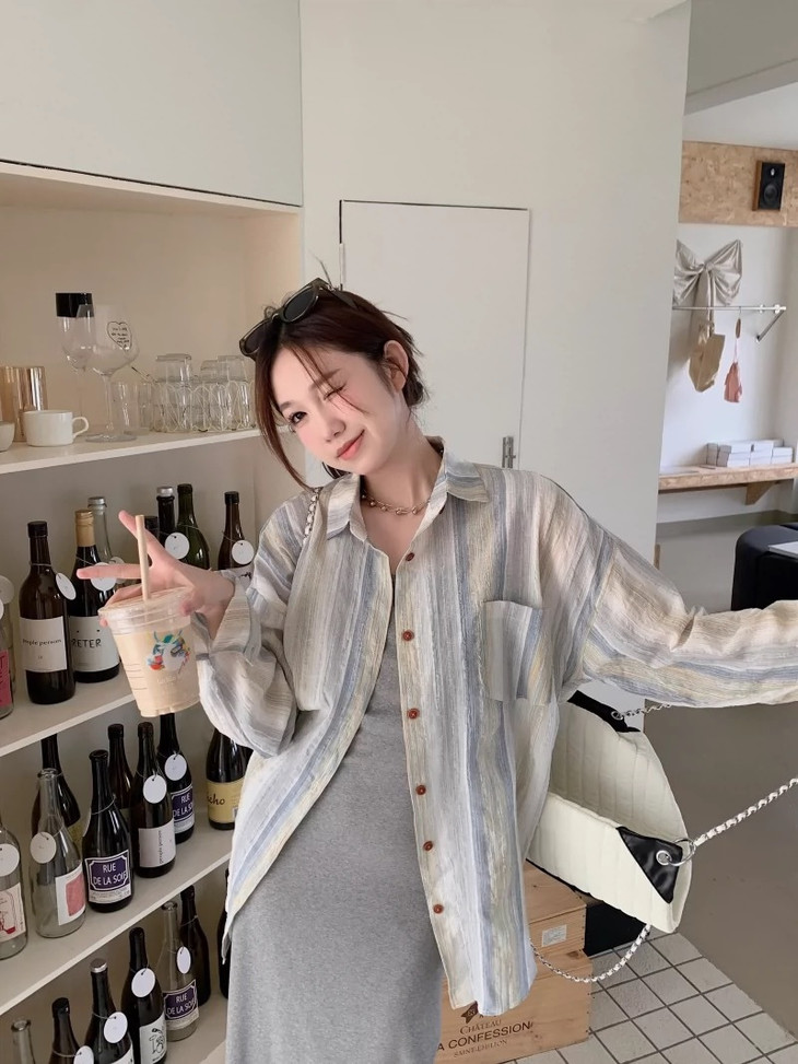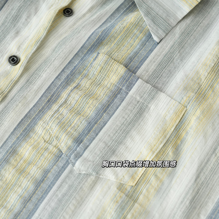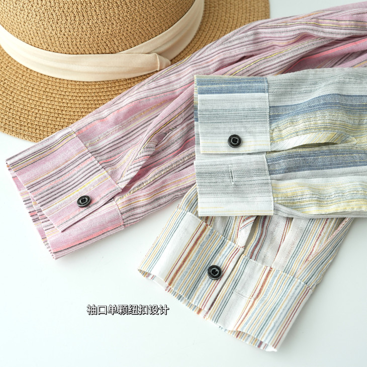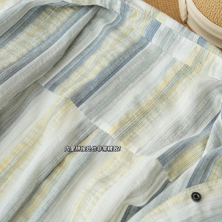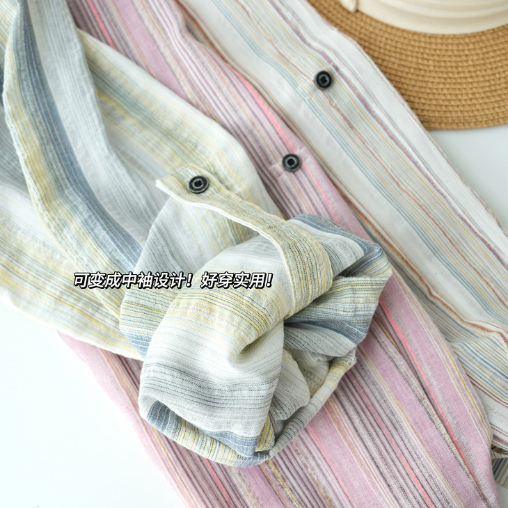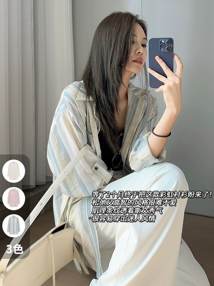 独家yuan版定制‼️夏日松弛感穿搭‼️【美yang同款彩虹线棉感条纹防晒衬衫】晕染配色超美‼️版型宽松 随意搭配背心裙or牛仔裤 慵懒随意又清爽 夏天这样穿真的好好看‼️ 面料自带肌理感 轻薄透气不易皱 可直接当防晒穿可日常通勤穿 不要太实用❗️