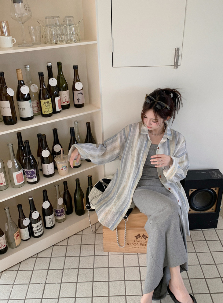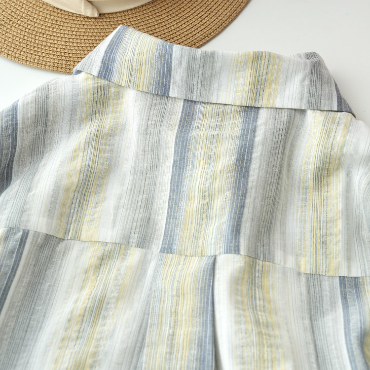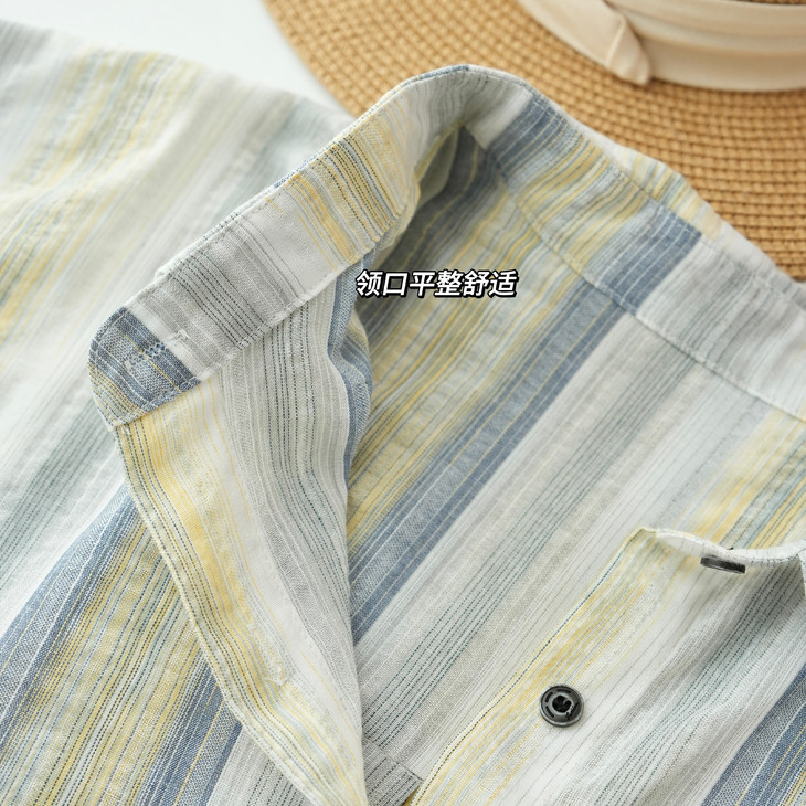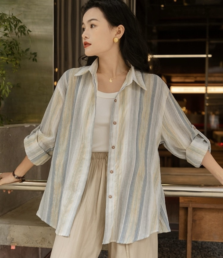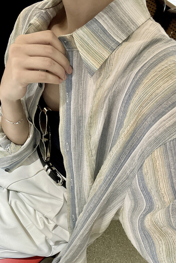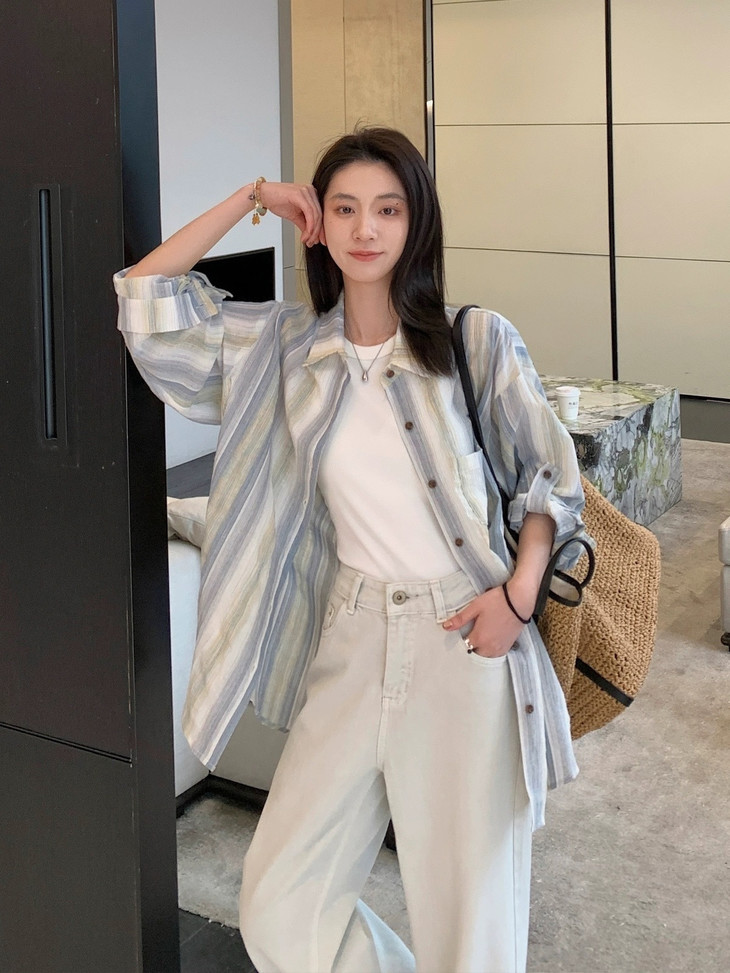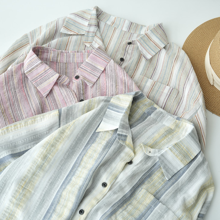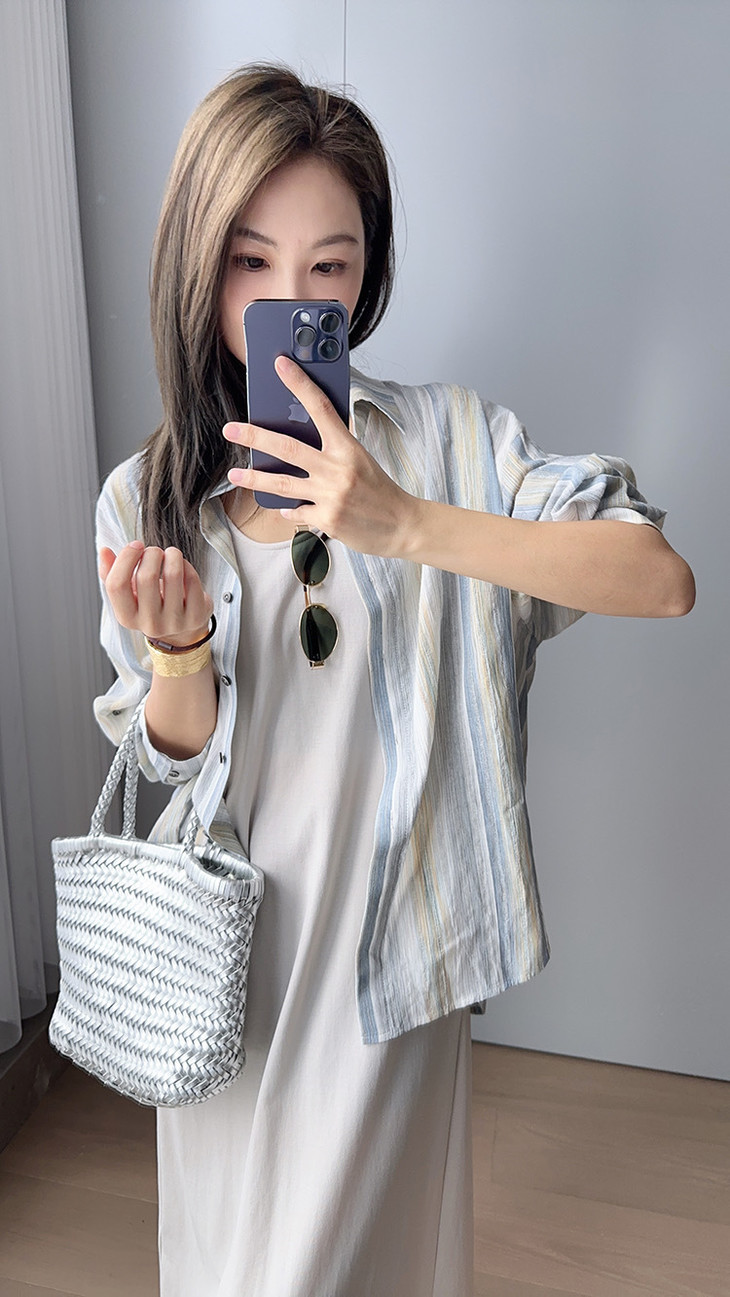 独家yuan版定制‼️夏日松弛感穿搭‼️【美yang同款彩虹线棉感条纹防晒衬衫】晕染配色超美‼️版型宽松 随意搭配背心裙or牛仔裤 慵懒随意又清爽 夏天这样穿真的好好看‼️ 面料自带肌理感 轻薄透气不易皱 可直接当防晒穿可日常通勤穿 不要太实用❗️