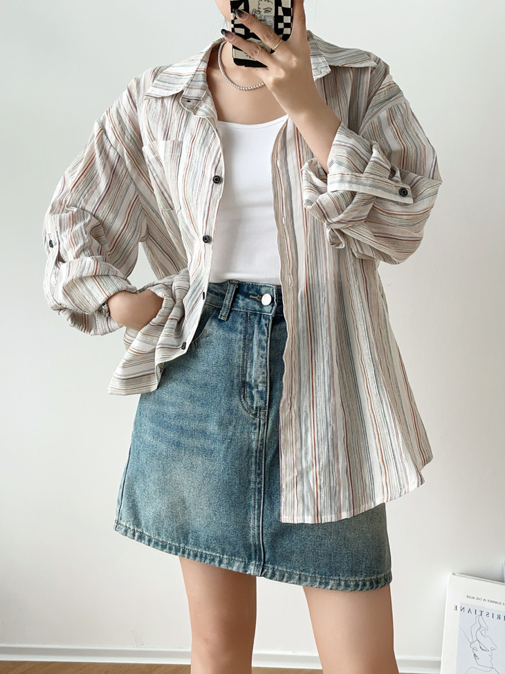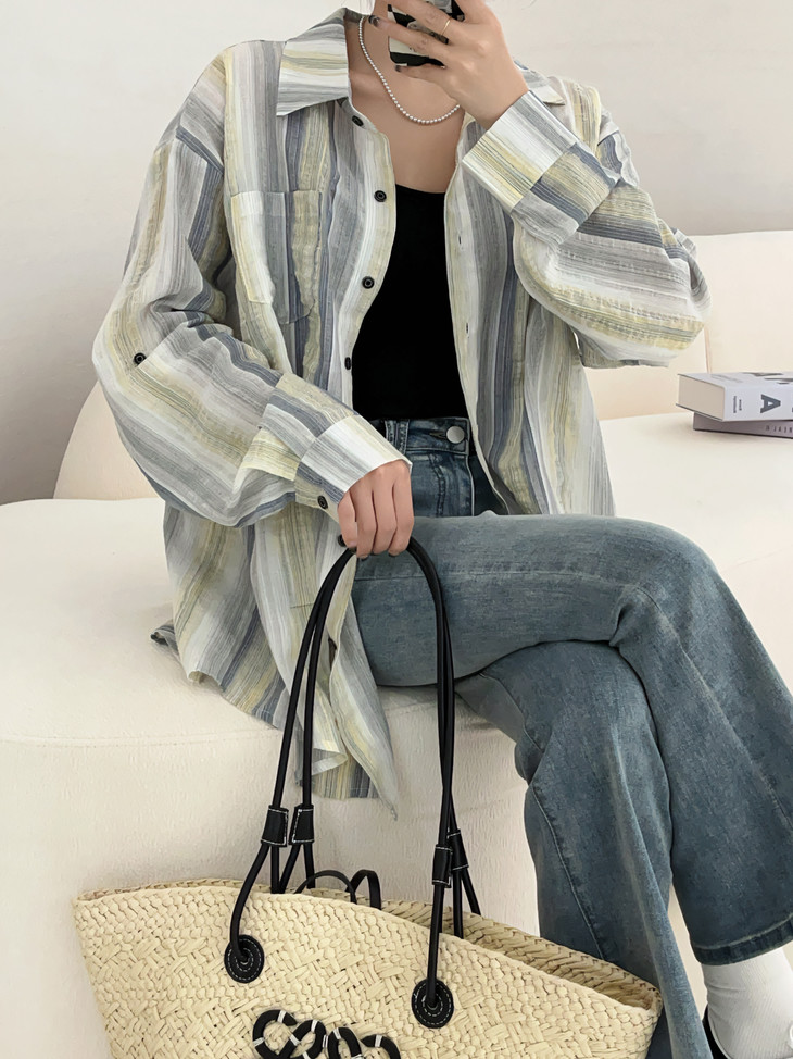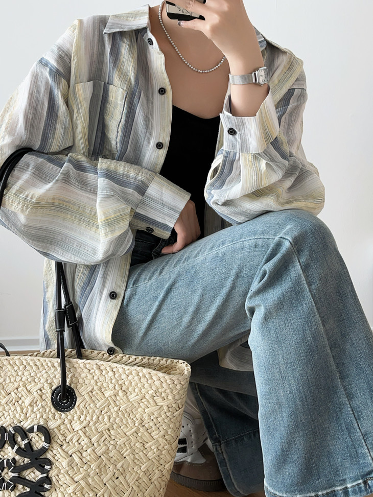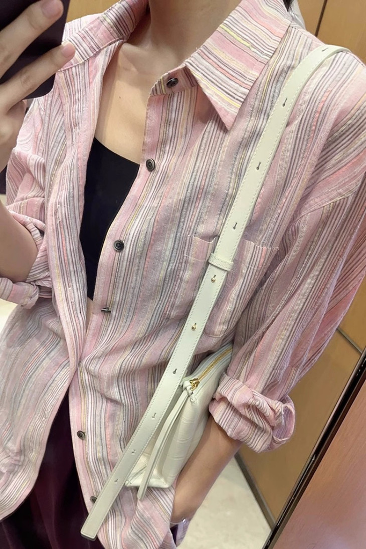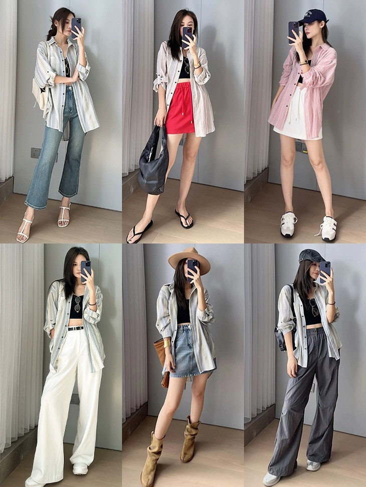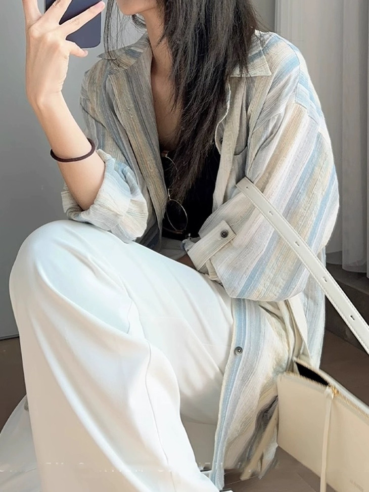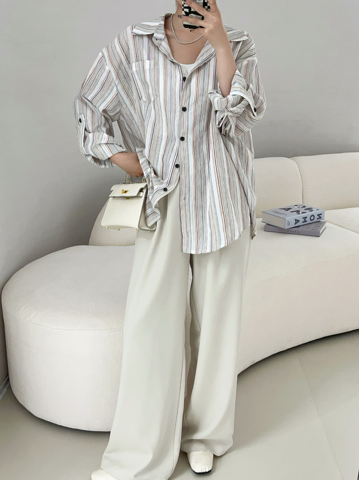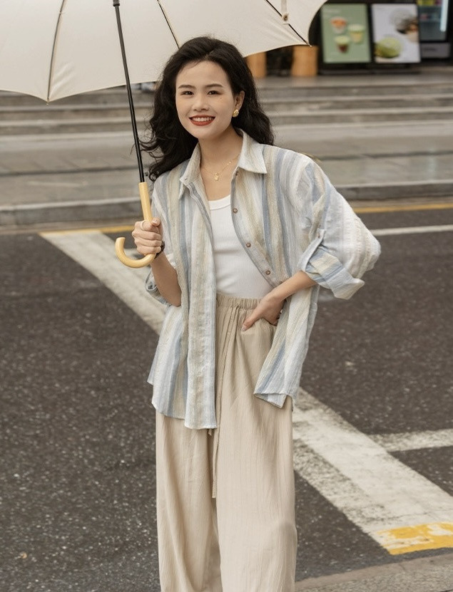 -团长碎碎念- 这件条纹衬衫充满又帅又美的矛盾美学 彰显又松弛又高智的风格,很难让人不爱! 宽松休闲版型重点夸夸! 摒弃土里土气的修身制服衬衫OVERSIZED廓形 巧妙化解正式、拘谨、班味的印象! 经典翻领,简洁大方,优化脸型与颈部线条 棉与涤面料制作 吸湿透汽体感舒爽 防晒外搭 大夏天也不会闷热难耐 很有日系的氛围感 自由且放松 减龄可爱的少女感 衬花袖口 收束起来更立体有型 干干净净的舒适感 清新亮眼~ 春夏日出街直接套这一件就OK啦