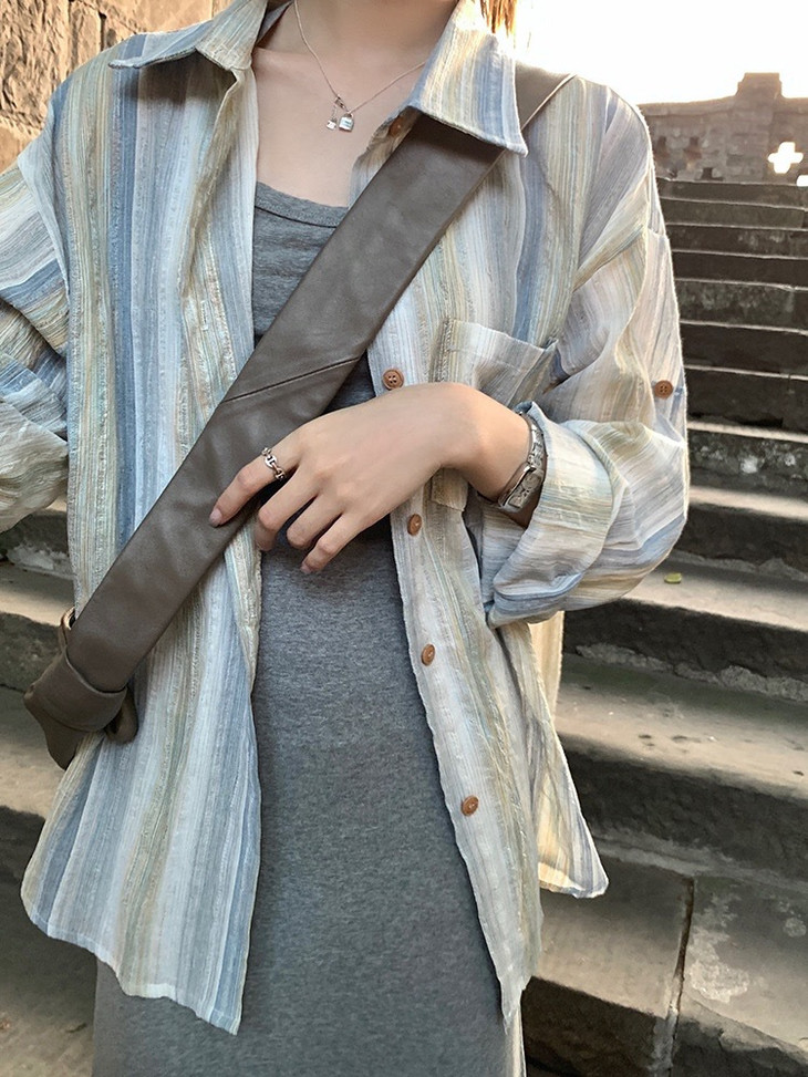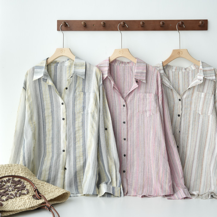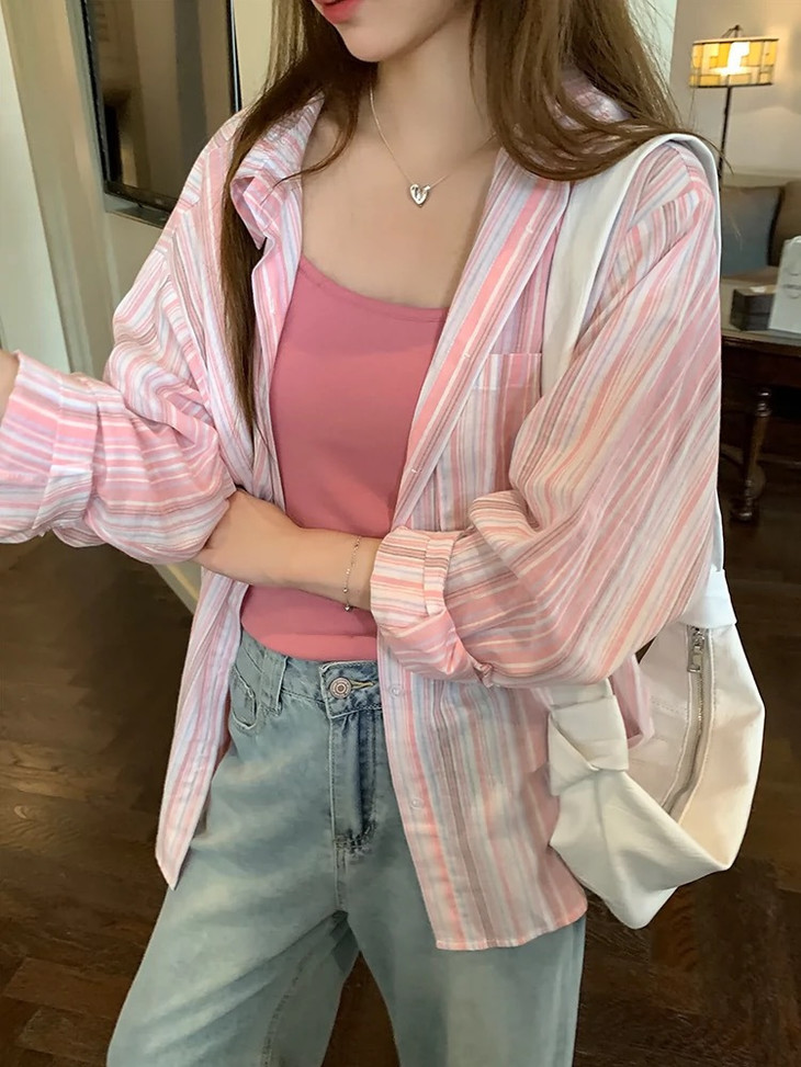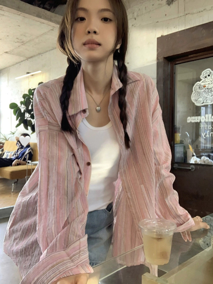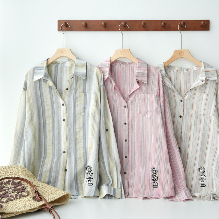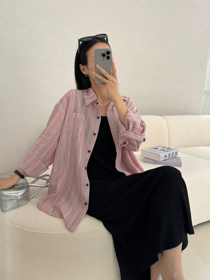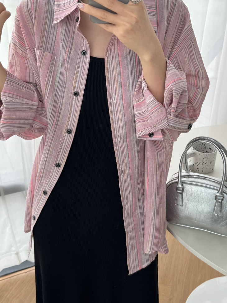 💕【美yang同款慵懒彩虹线棉感条纹衬衫】✅1.晕染配色超美‼版型宽松🌸 随意搭配背心裙or牛仔裤 ⭕