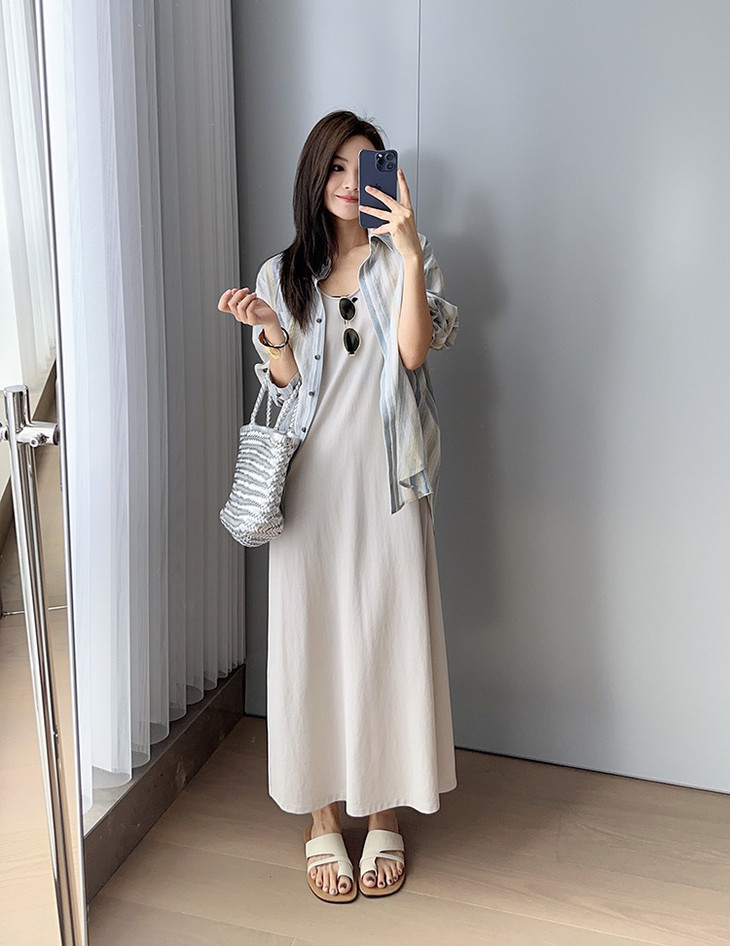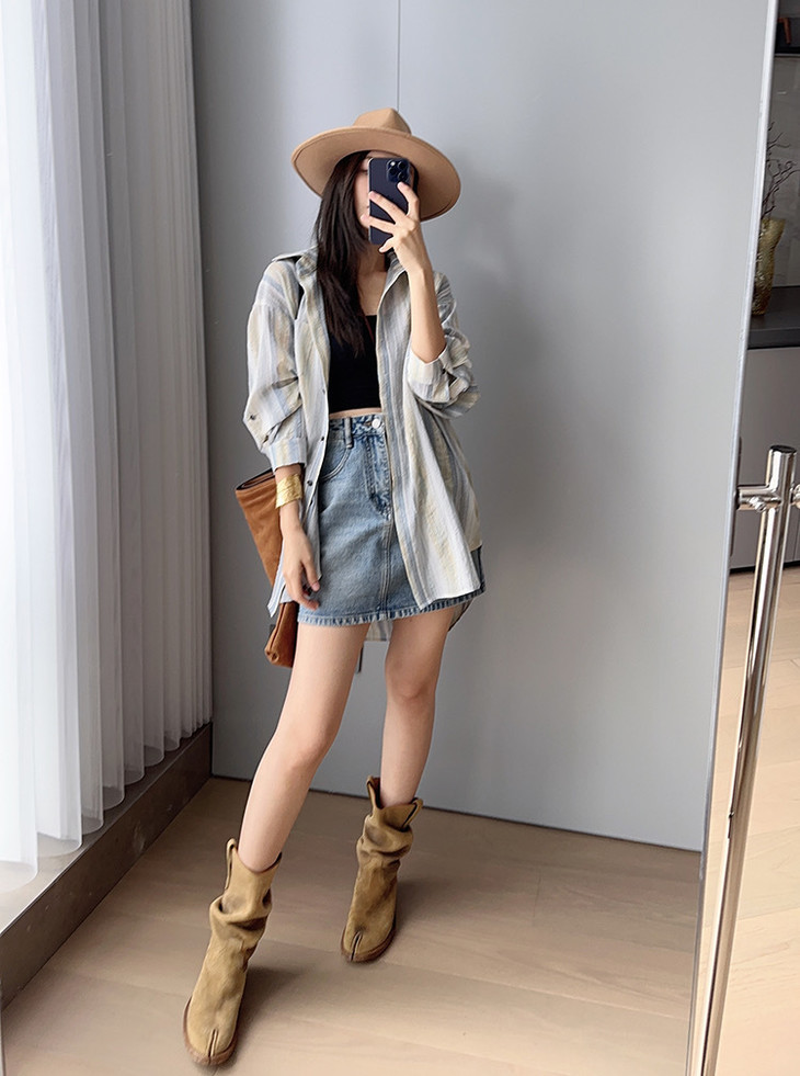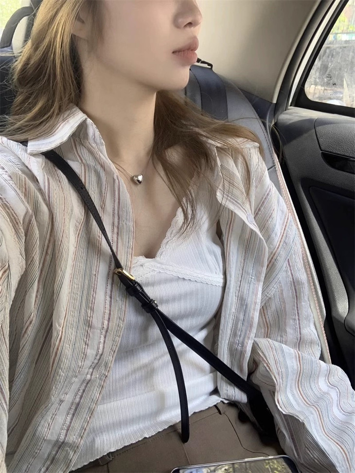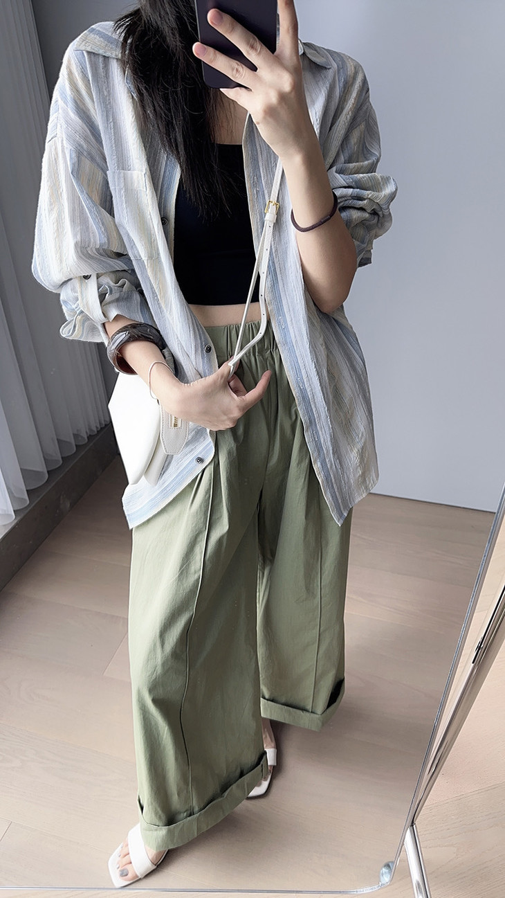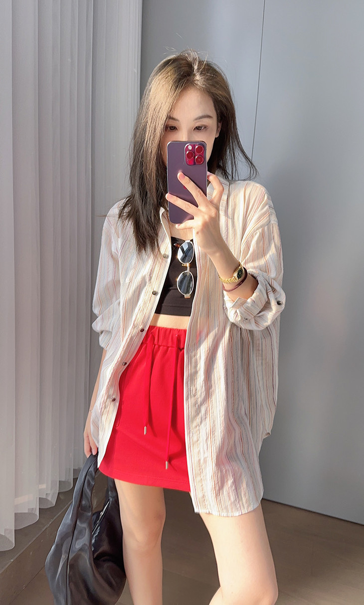 混色竖条纹真的好看又显瘦 怎么穿都是亮点 内里随意搭配一个小吊带 整个人清爽到不行 而且超级适合去拍照 很出片!!! 自家小姐姐上身实拍📷