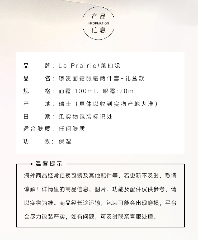 La Prairie莱珀妮琼贵面霜眼霜两件套 琼贵面霜100ml滋润 琼贵眼霜20ml 保湿补水紧致淡纹