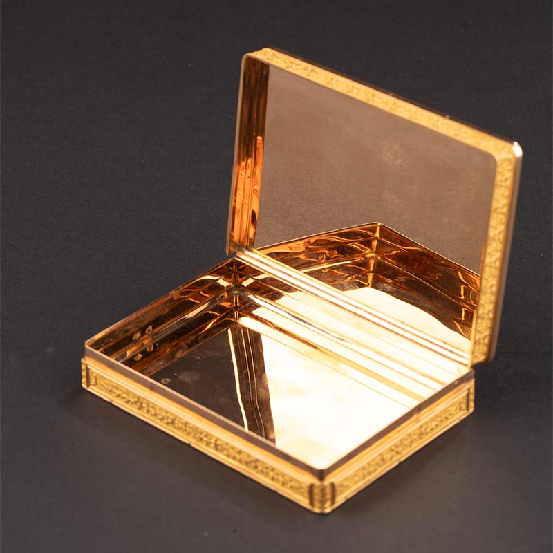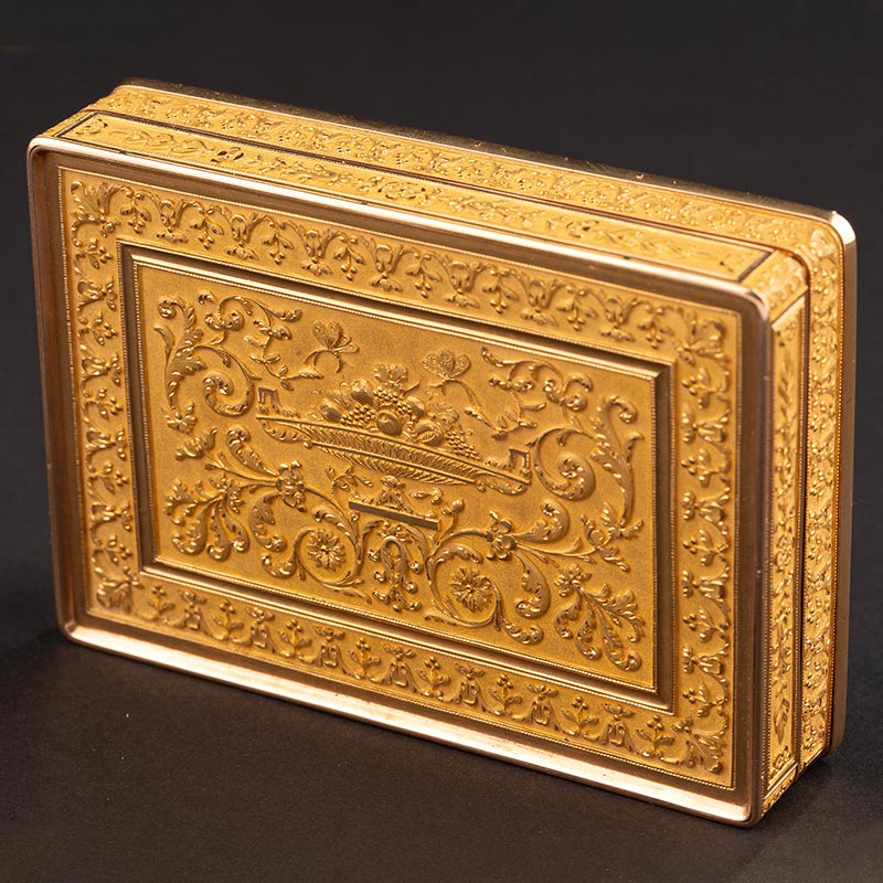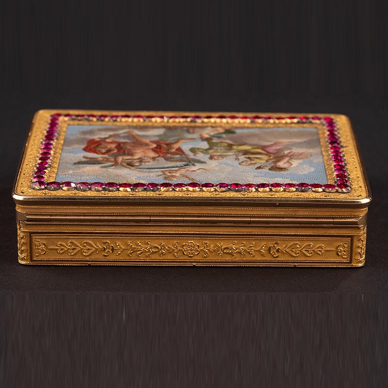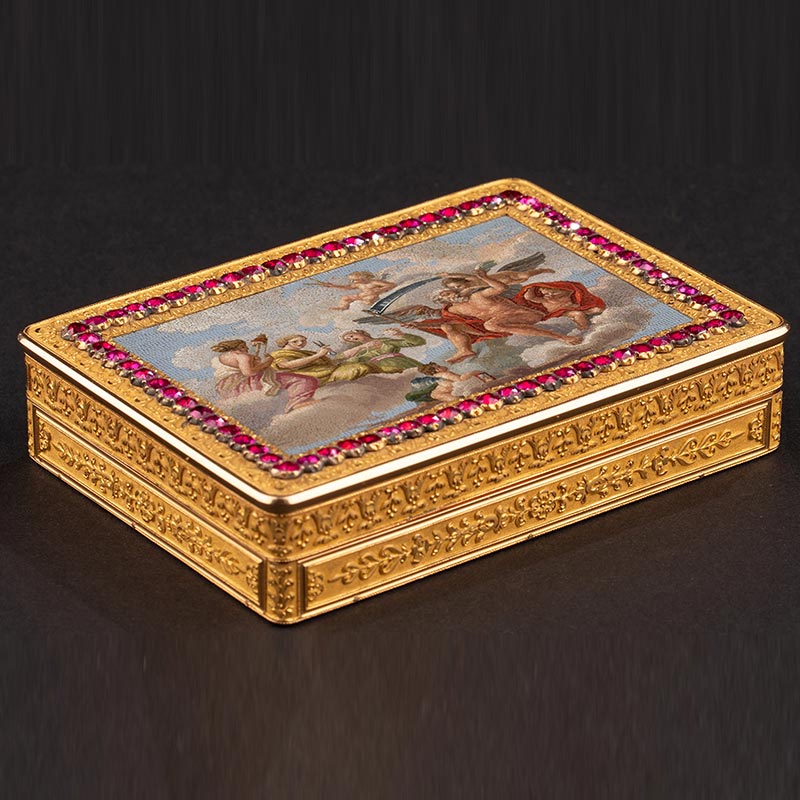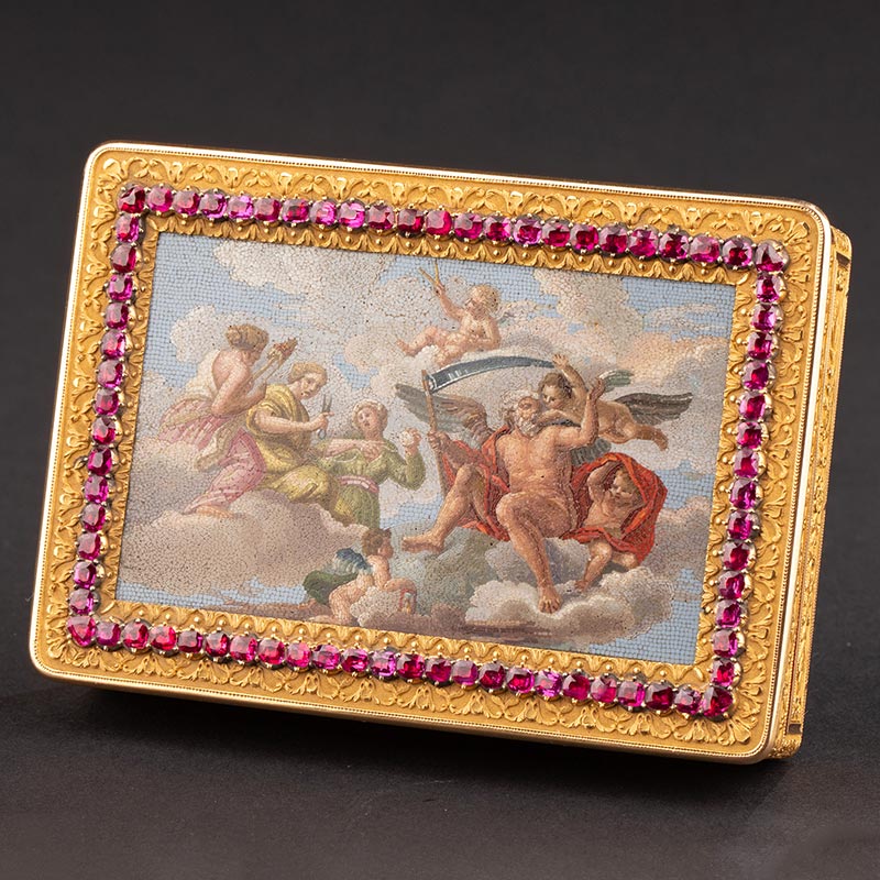 19世纪法国工坊出品花叶纹精雕镶嵌红宝石及命运三女神与时间之父主题极细马赛克18K黄金盒
