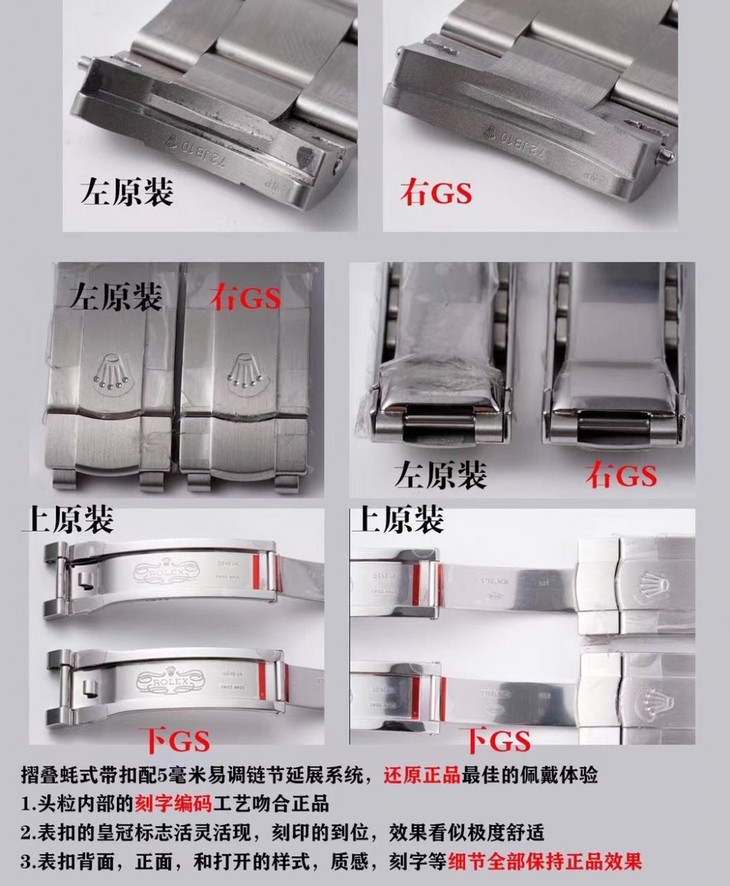 4.【表带】进口904L蚝式精钢,每条表带与表耳完美契合,摺叠蚝式带扣配5毫米易调链节延展系统,还原正品最佳的佩戴体验