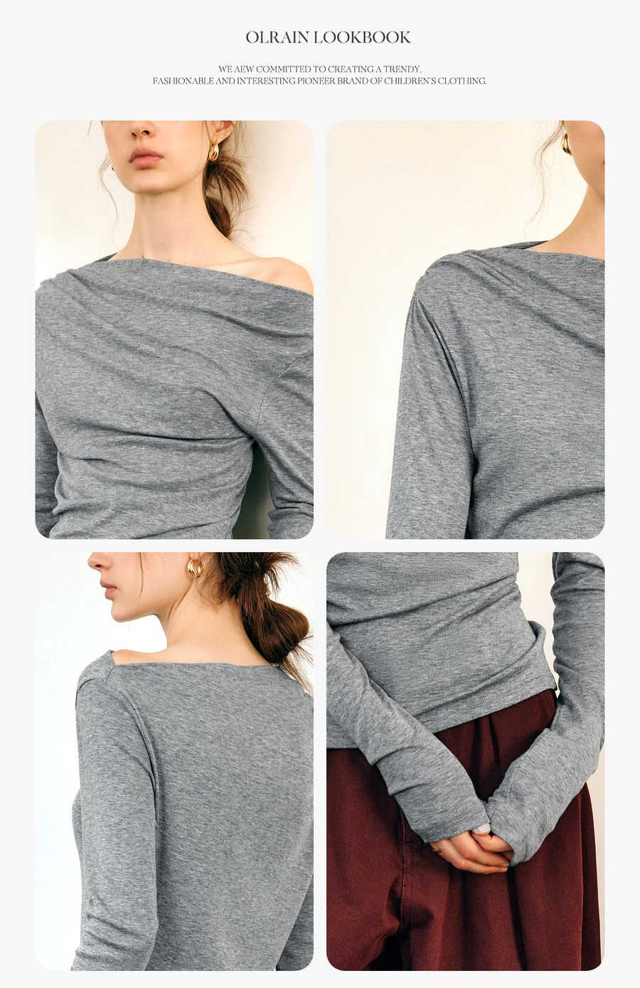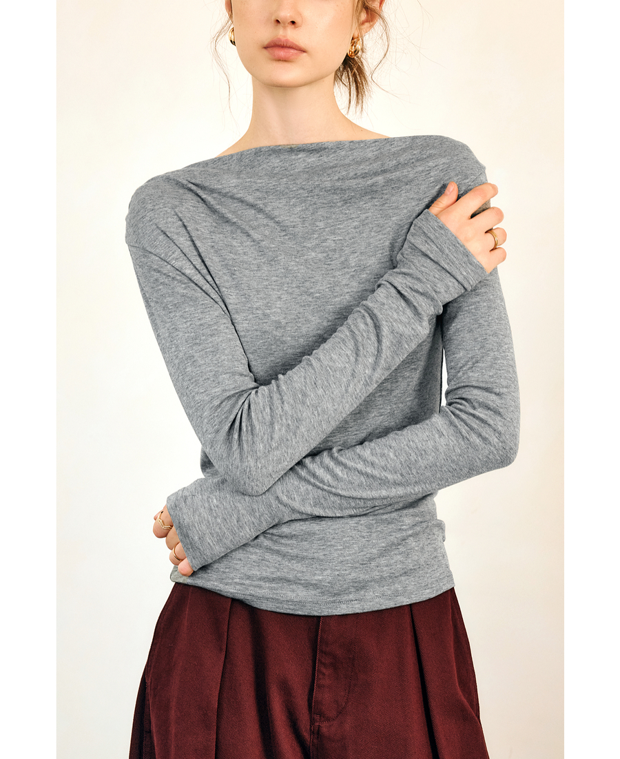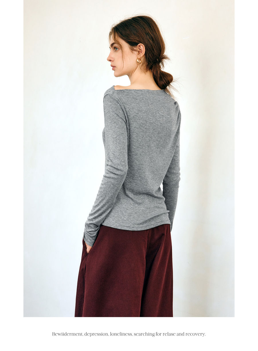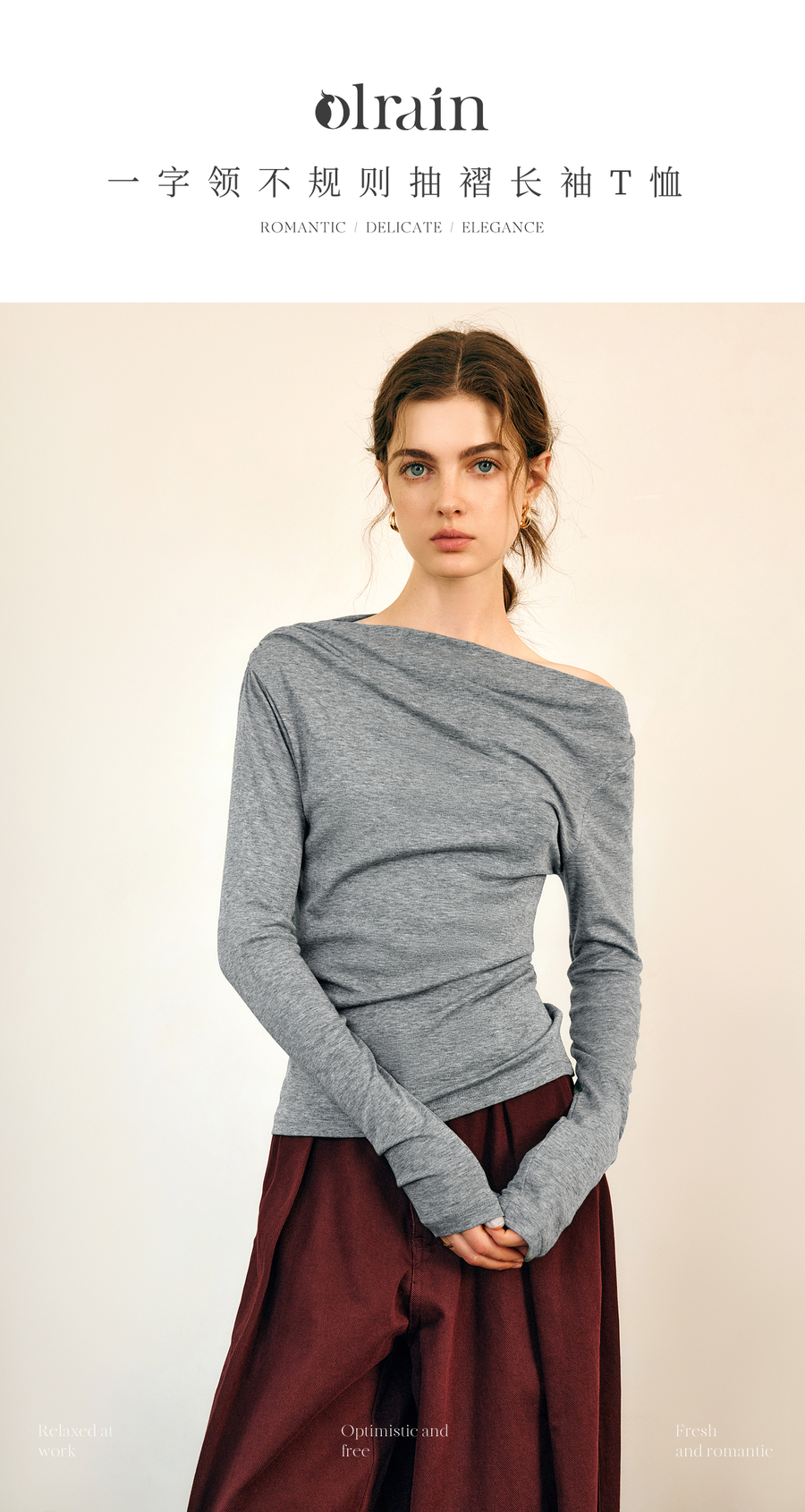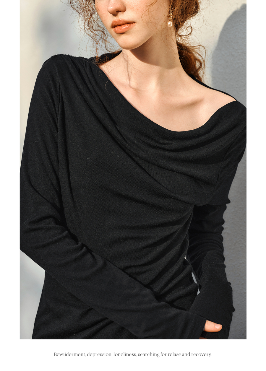 OLrain欧芮儿法式长袖T恤女春季2025年新款一字领不规则抽褶上衣