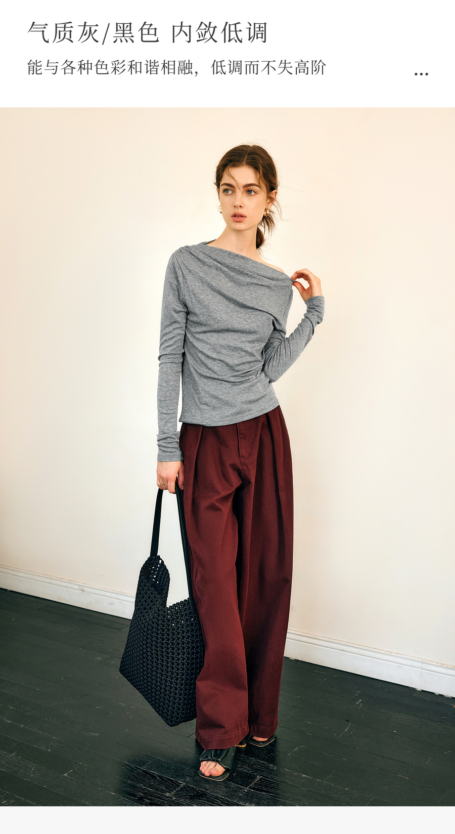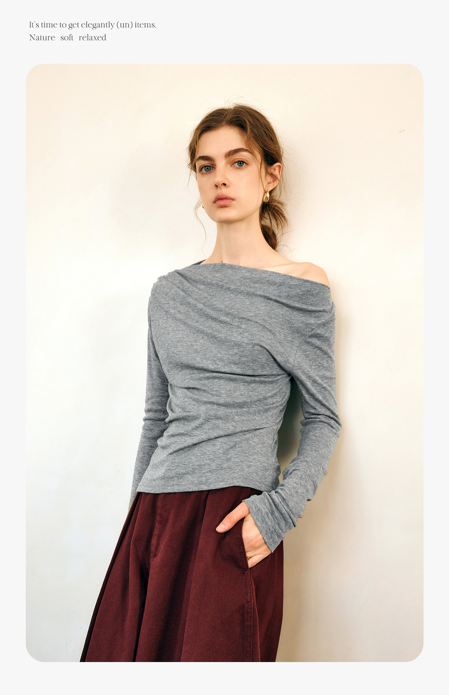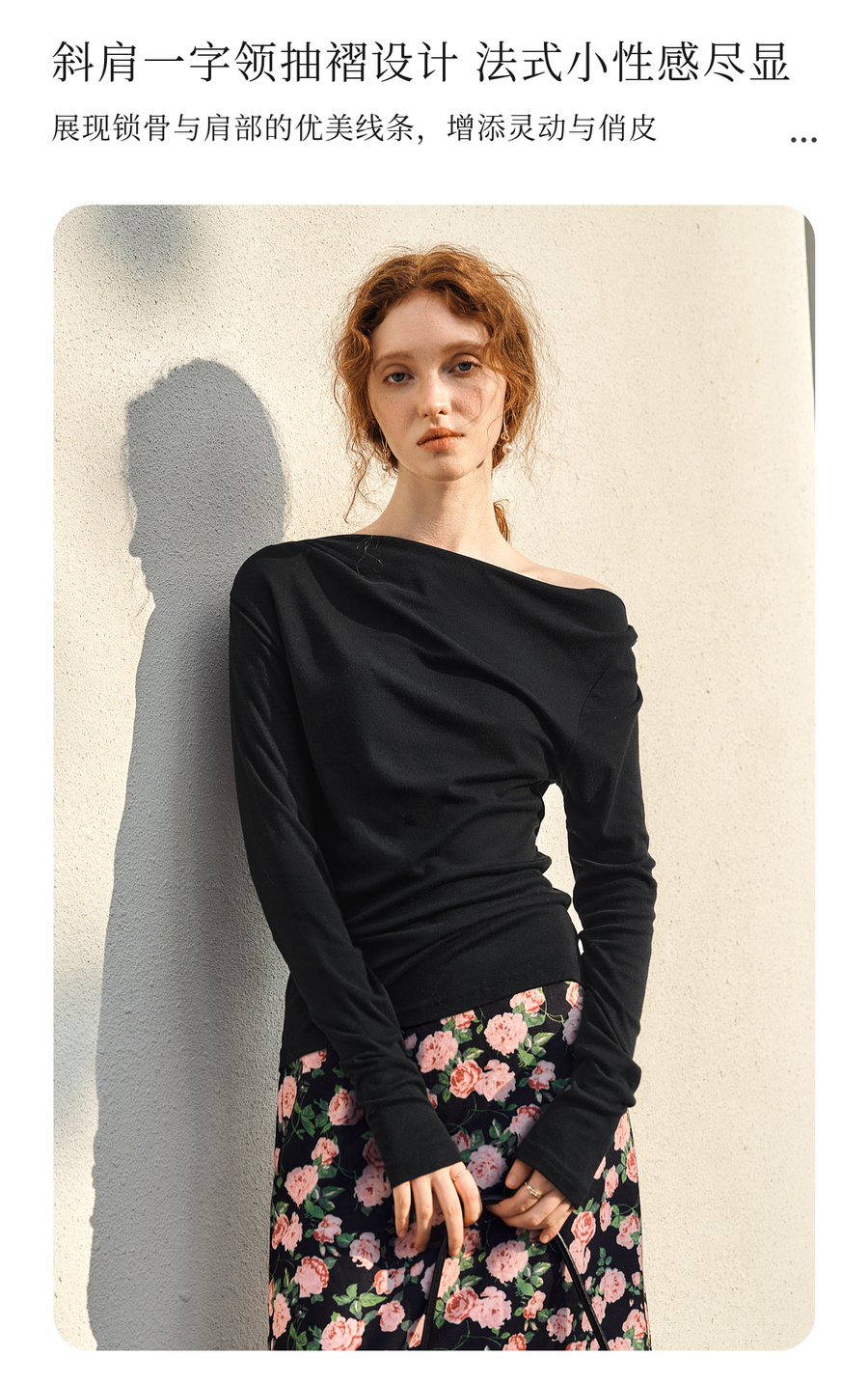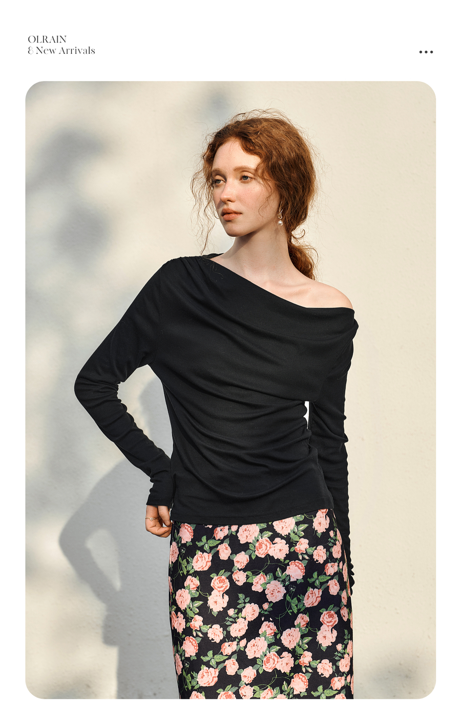 OLrain欧芮儿法式长袖T恤女春季2025年新款一字领不规则抽褶上衣
