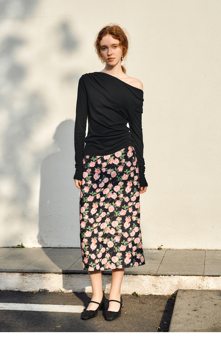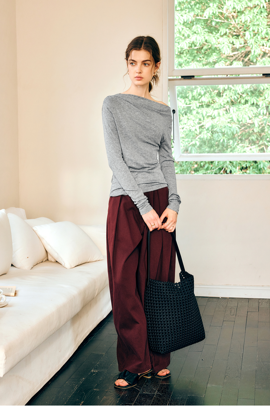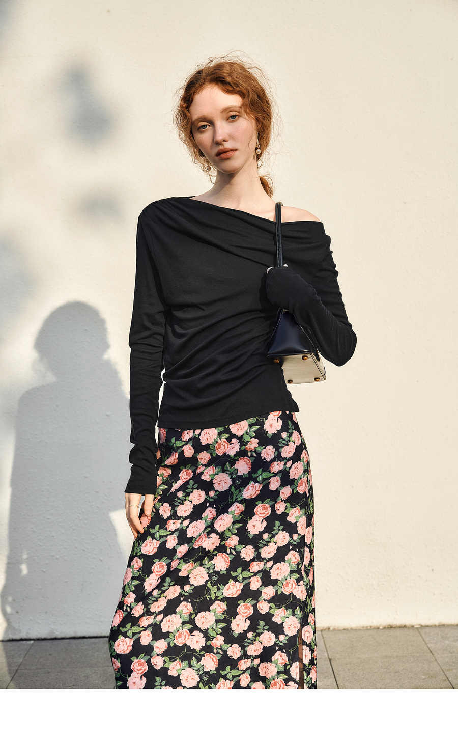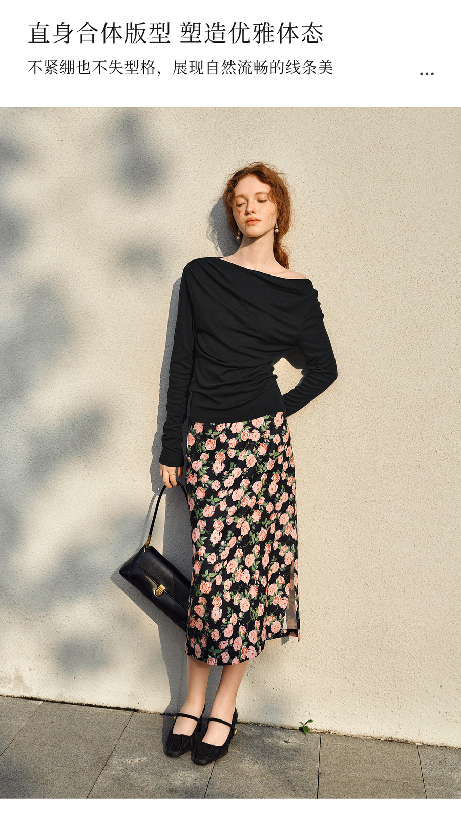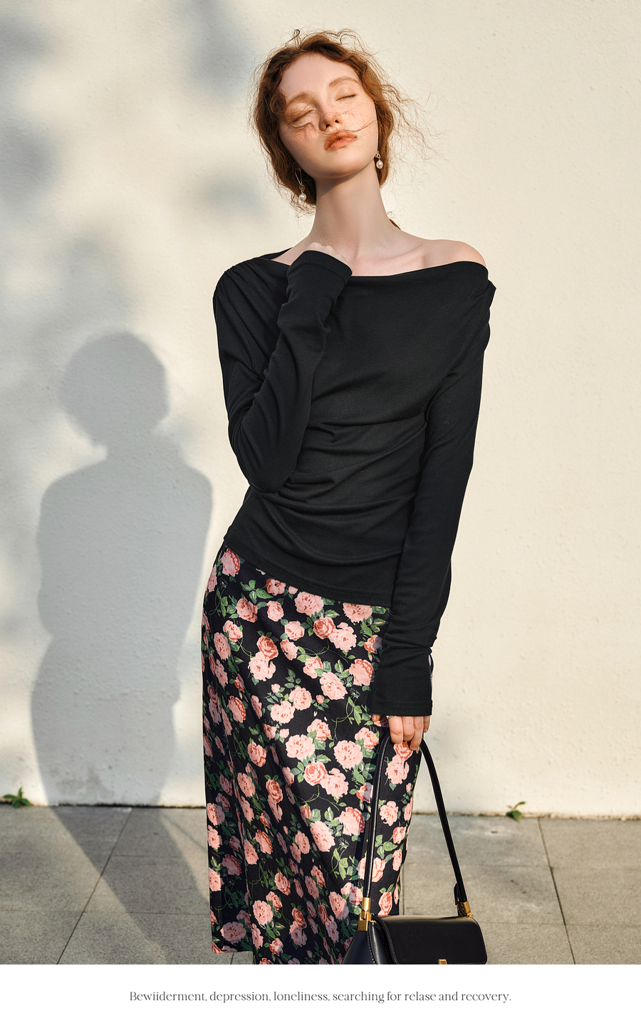 OLrain欧芮儿法式长袖T恤女春季2025年新款一字领不规则抽褶上衣