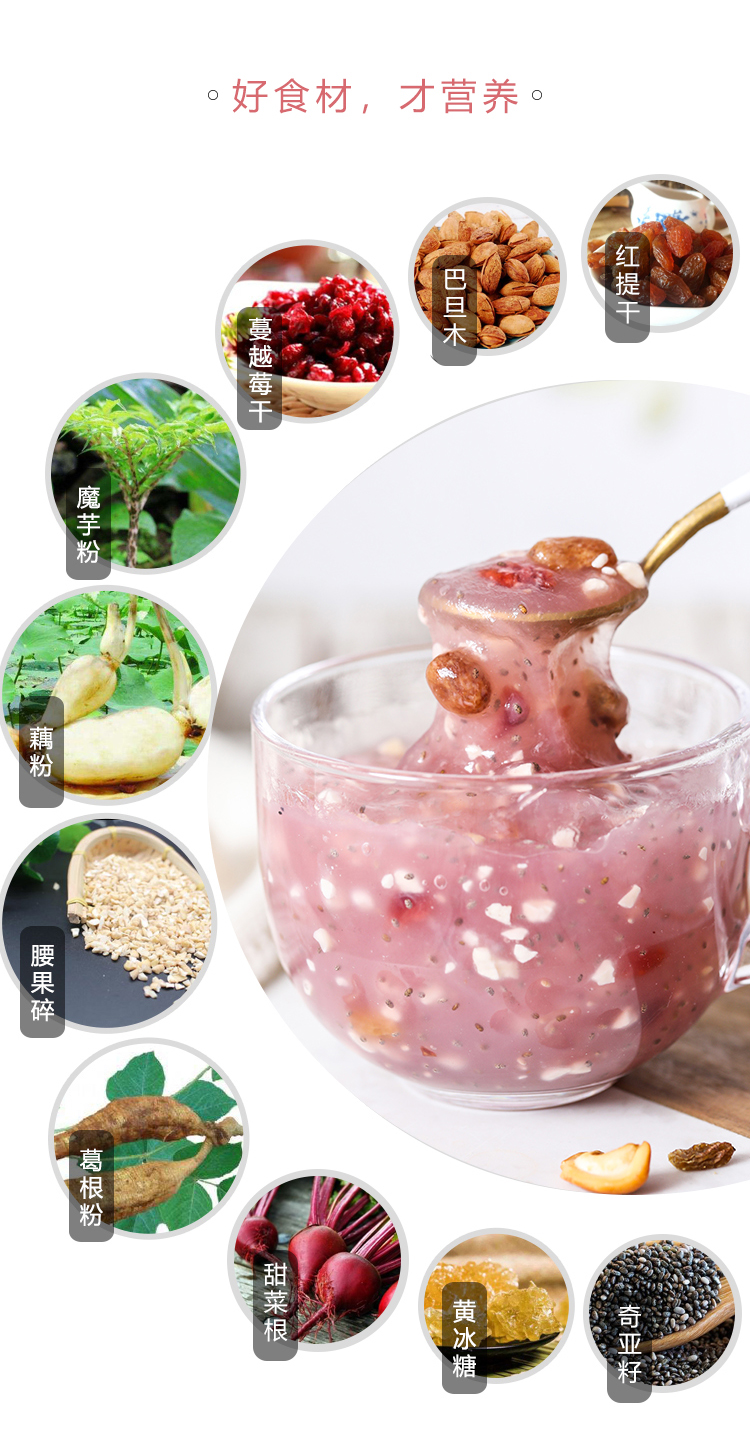 藕粉,葛根粉,魔芋粉,腰果碎,进口蔓越莓干,巴旦木,红提干,甜菜根,黄冰糖,奇亚籽