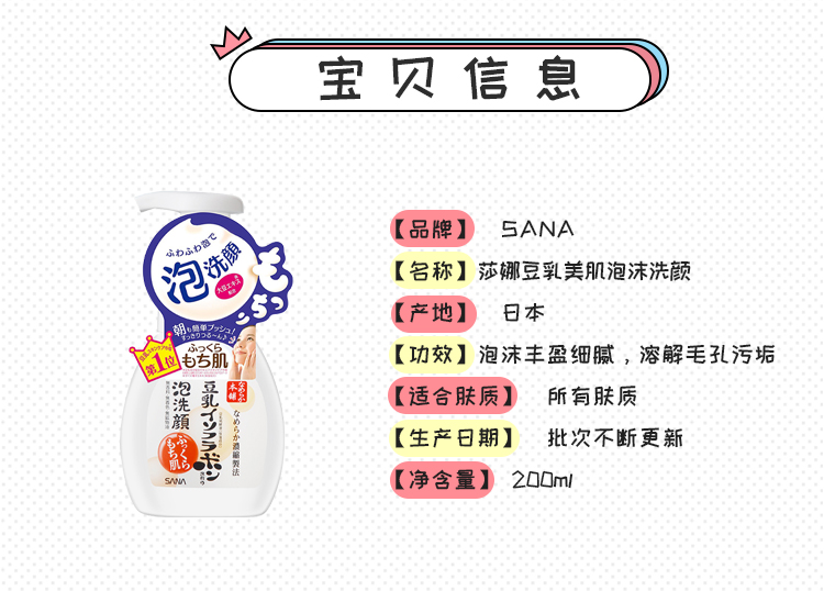 日本进口莎娜豆乳美肤泡沫洗颜洁面乳洗面奶男女温和 200ml