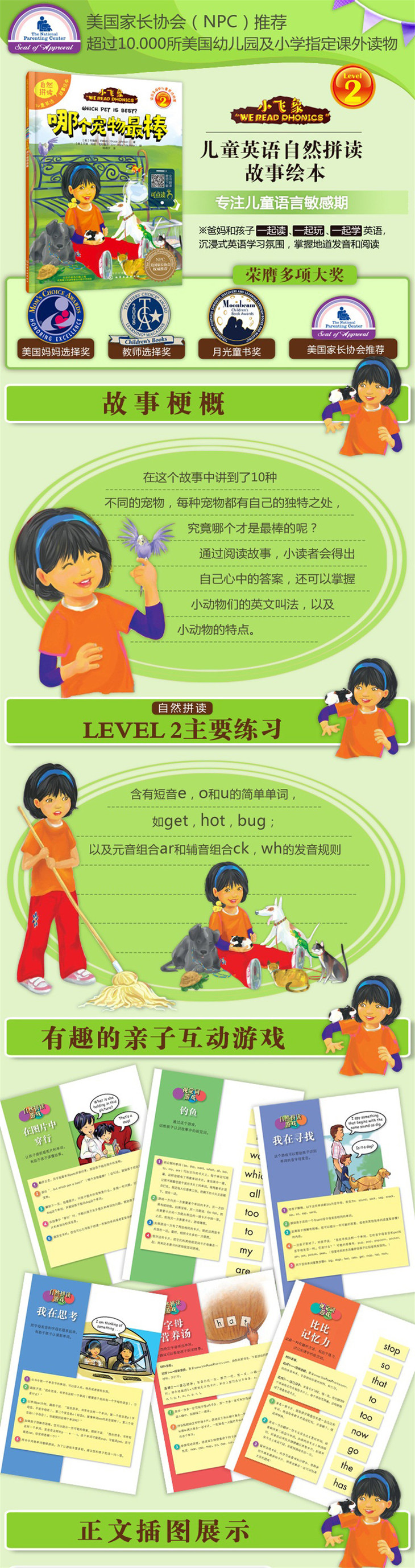 4.一本书三种用法。既可以作为孩子学习自然拼读的学习资料,也可以作为亲子阅读的故事读本,亦可以成为亲子互动游戏的好素材。