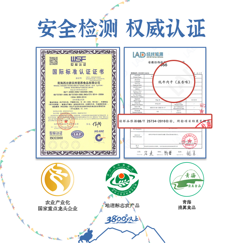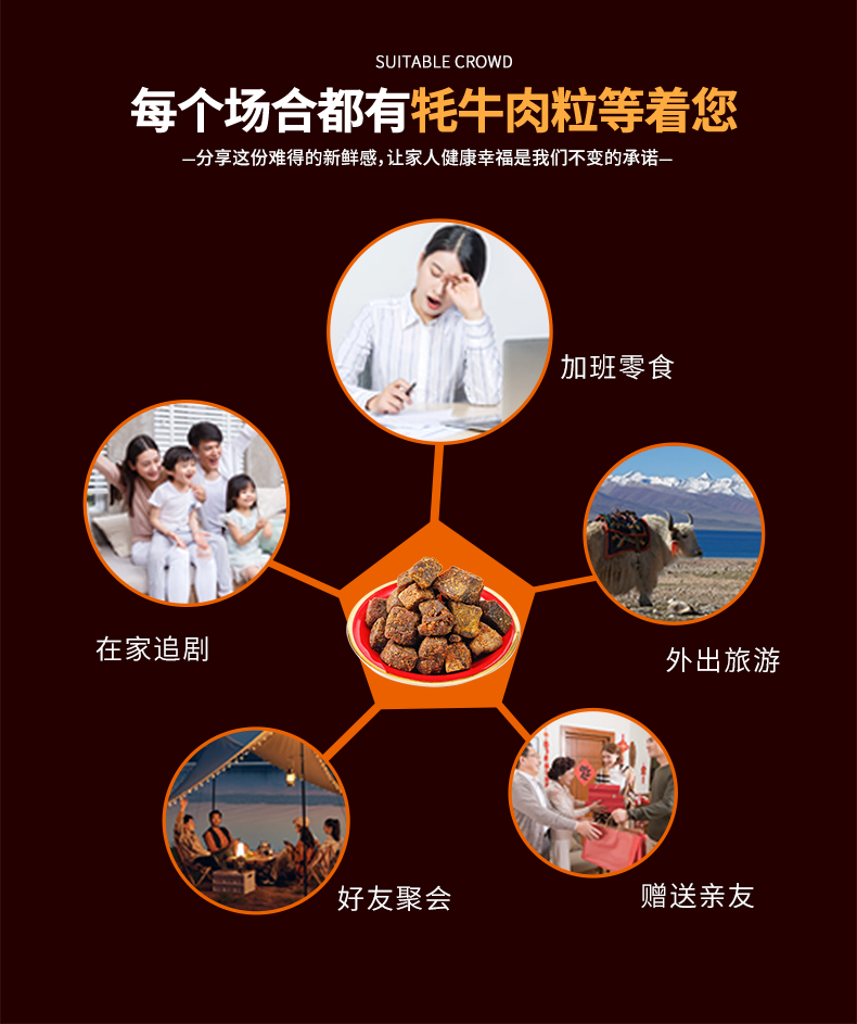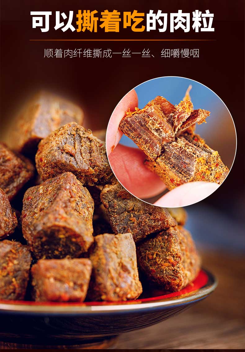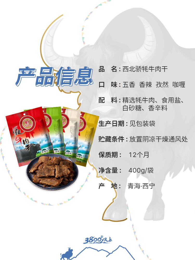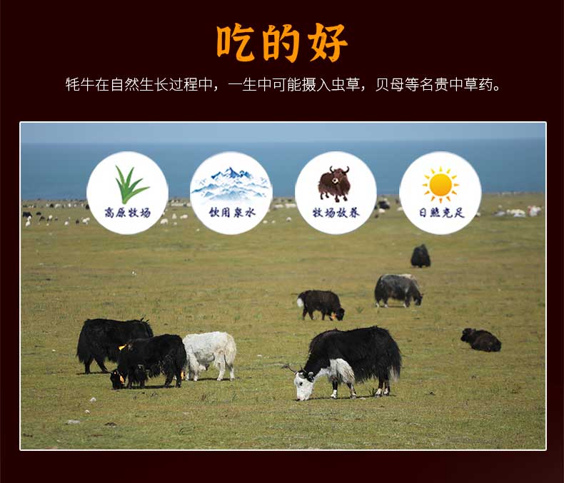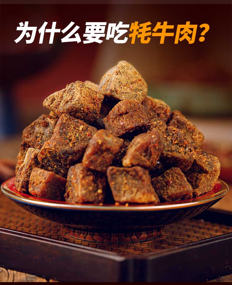 【产品特点】本产品以青藏高原半野生自然放养的雪域牦牛肉为原料加工而成, 坚持自然放牧,青藏高原自有牧场放养牦牛。