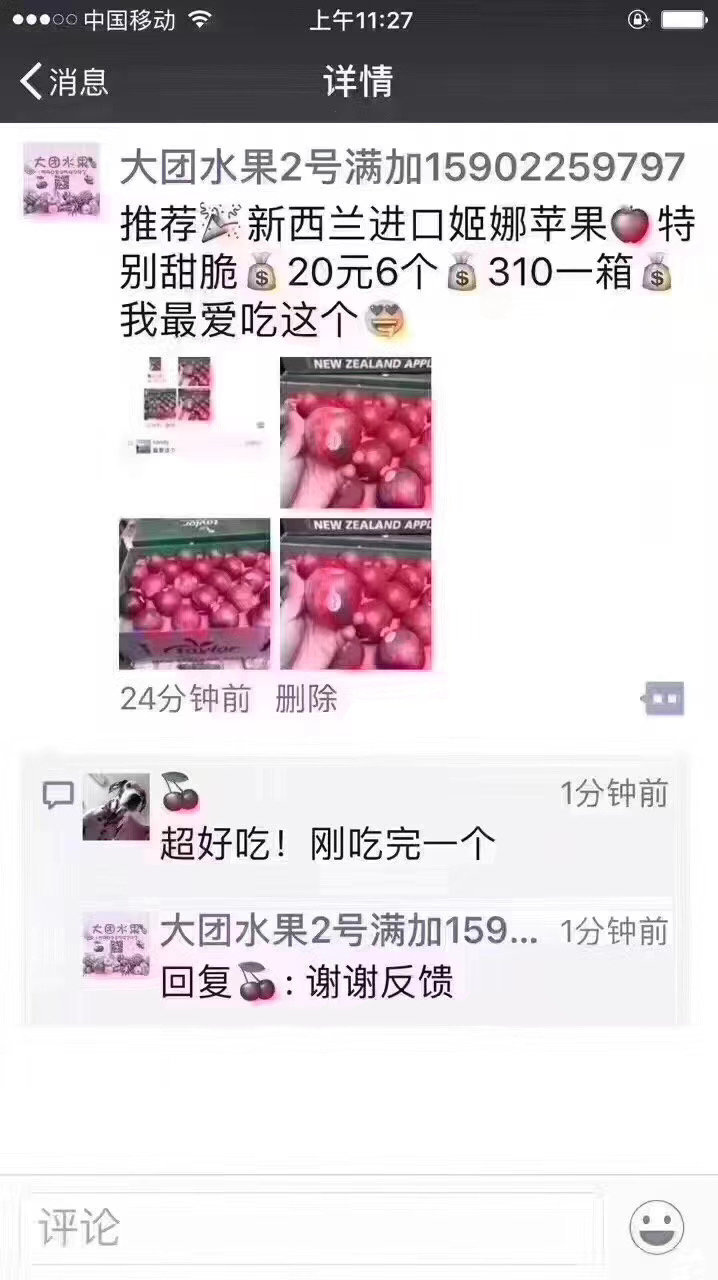 新西兰进口脆甜加力果,也叫姬娜苹果,甜蜜多汁。水果自然产物,以实物为准,介意可到店看货购买(加店铺微信15302118808看更多产品视频,到店自提和达达配送都是10:00开始) 整箱配送需拍专拍,整箱超重运费。谢谢