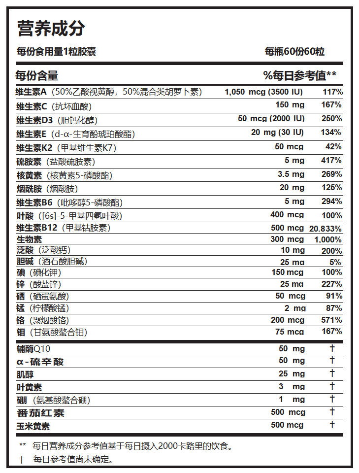 Physician's Daily™ 是一种先进的多种维生素,每日仅需1粒,含D3的全面多种维生素胶囊(不含铁)。