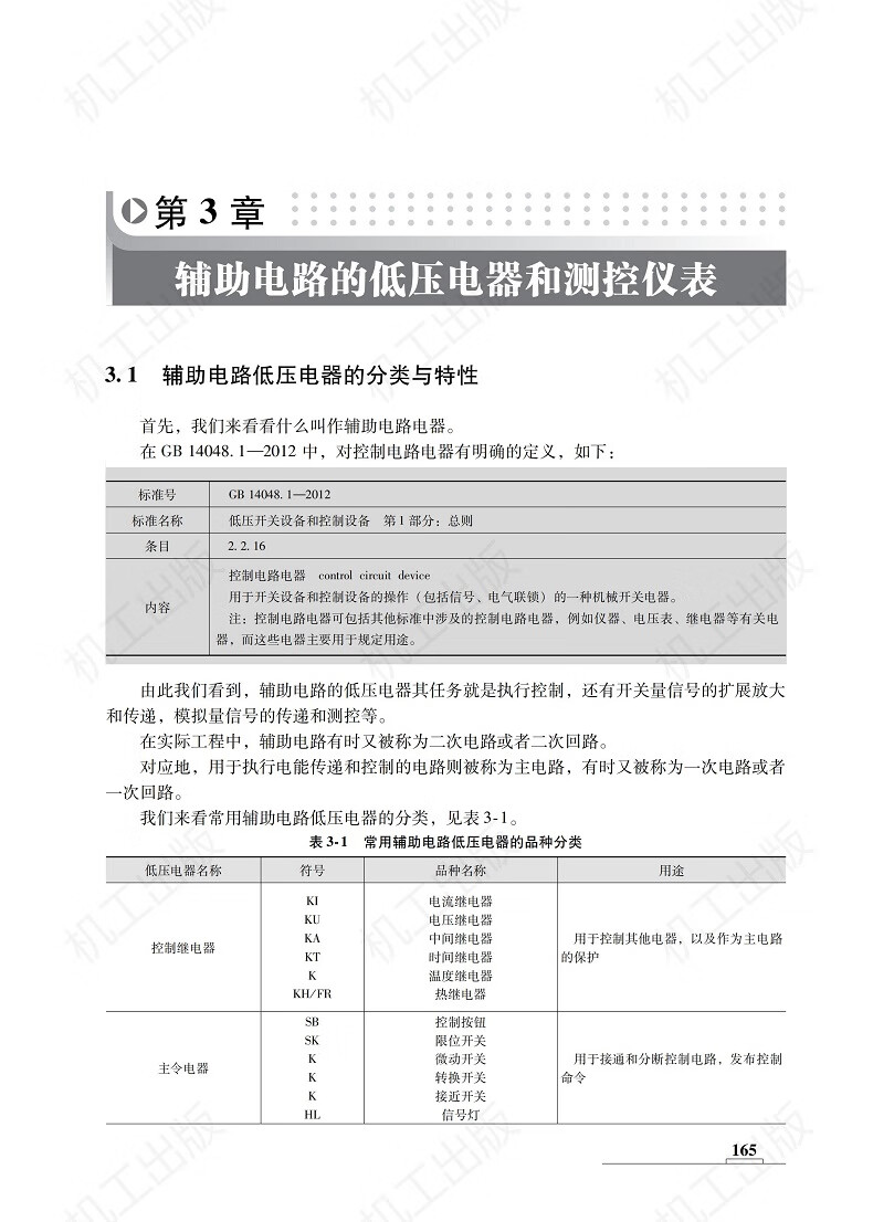 第3章对应用在辅助电路中的低压电器进行系统概述,并对测控仪表及低压电动机测控装置给予较为详尽的说明。