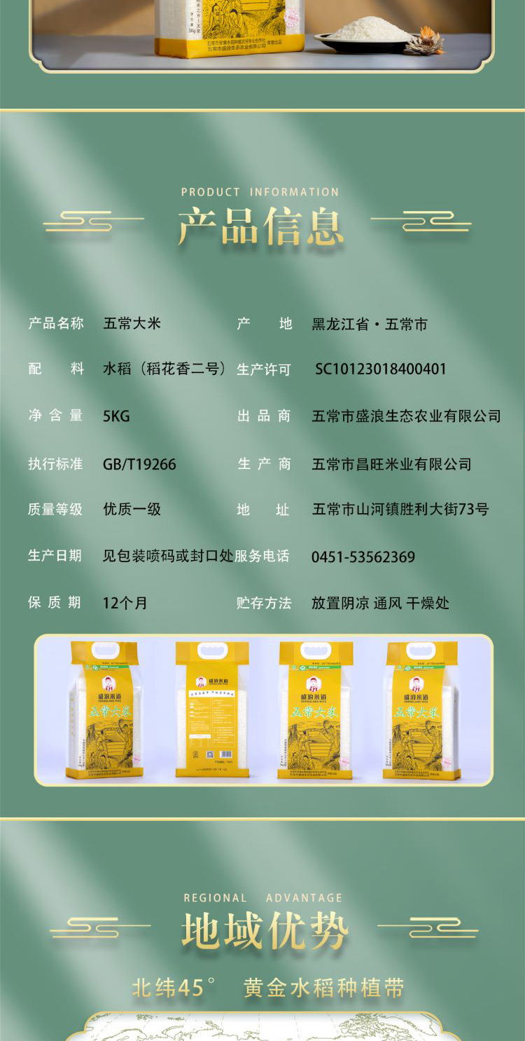 北大荒&盛浪米道绿色五常稻花香大米 5kg/袋