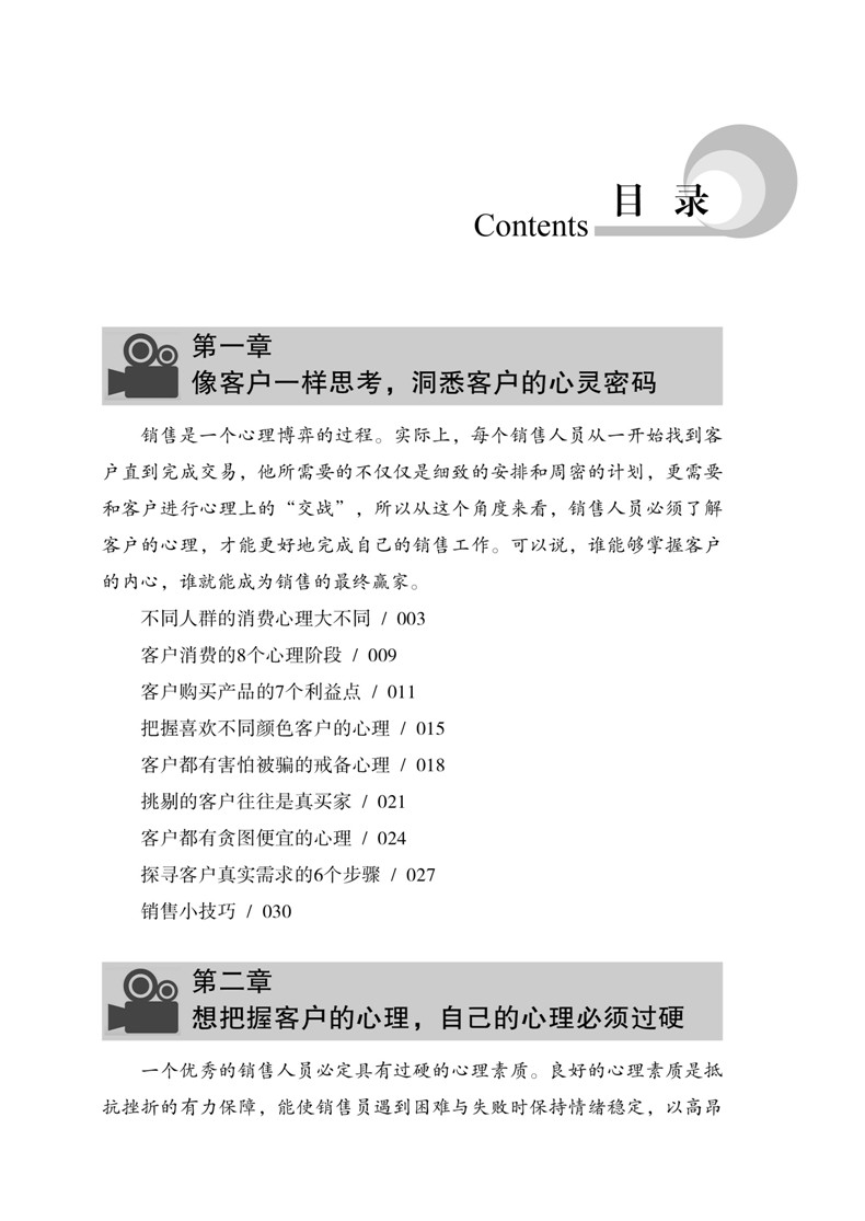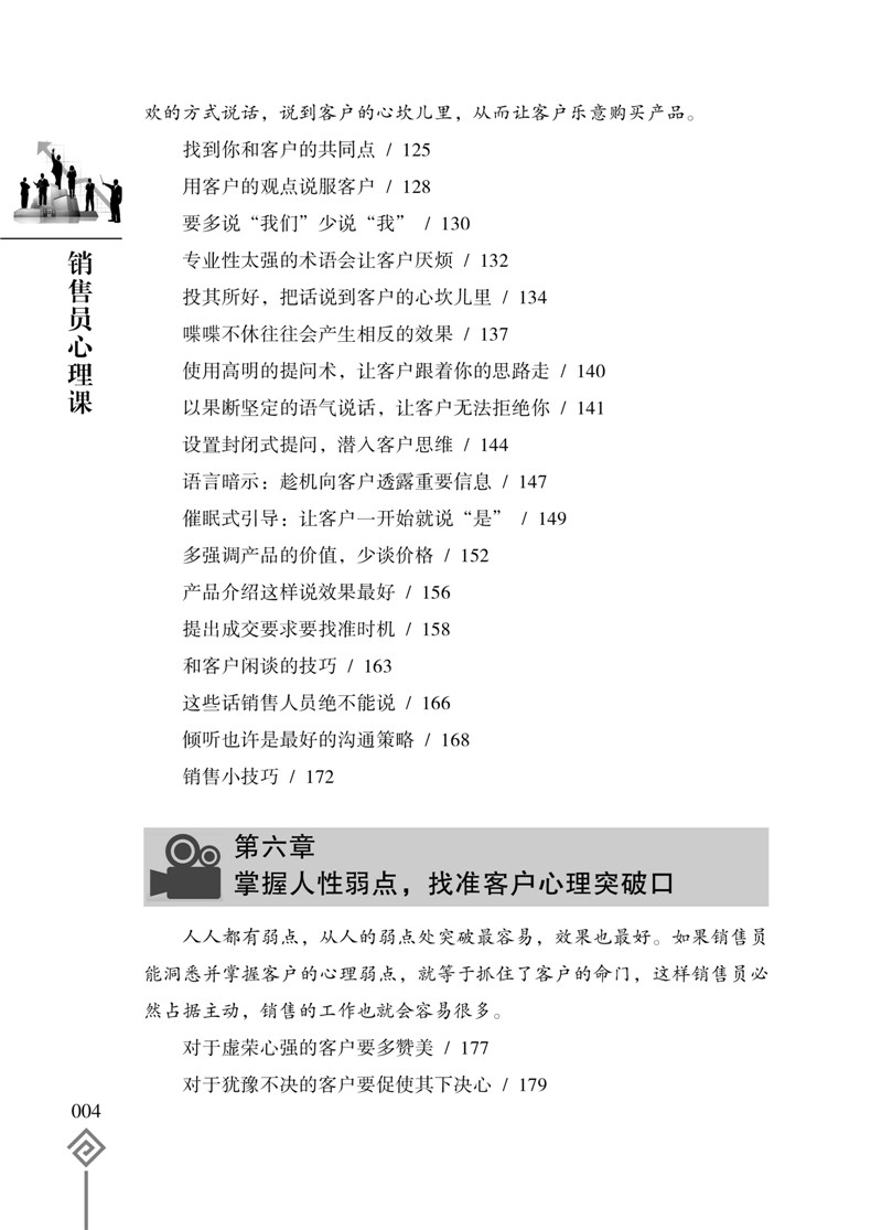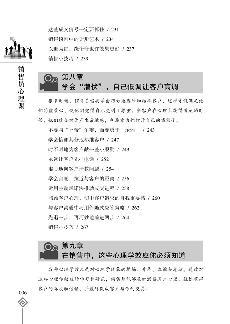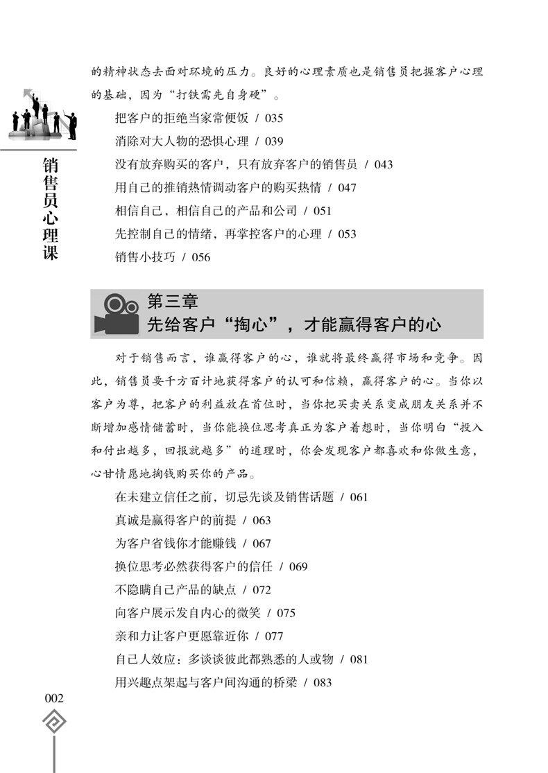 销售并不难,只要你懂得客户的心理;成交很容易,只要你掌握销售心理操控术。销售心理操控的目的就是为了摸透客户的心理,赢得客户的信任,打开客户的心扉,激发客户的购买欲望。可以说,销售就是一场心理博弈战,谁能够掌控客户的内心,谁就能成为销售的终赢家!《销售员心理课》把心理学知识和销售实践紧密地结合在一起,将攻心术运用到销售的实战中,从客户需求、客户相貌、客户沟通、客户心理弱点、商务谈判、客户肢体语言、适当抬高客户等方面,分析总结了操控客户心理的各种方法技巧,为广大销售人员提供一种通过心理策略的运用达到操控客户心理、实现产品销售的技术,开辟了一条成为销售员的捷径