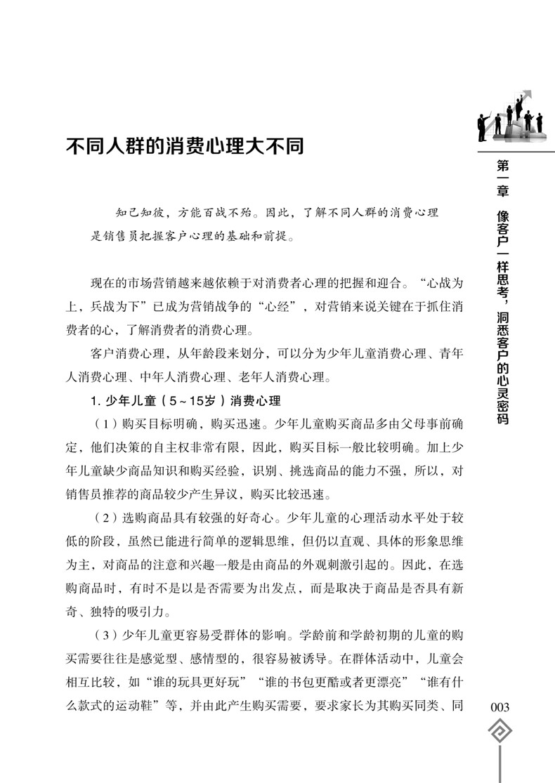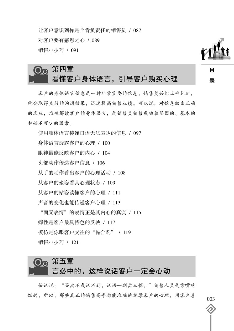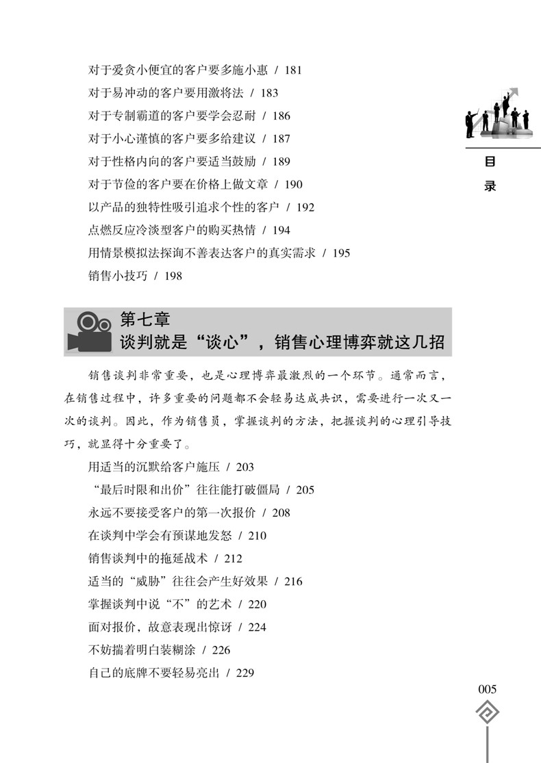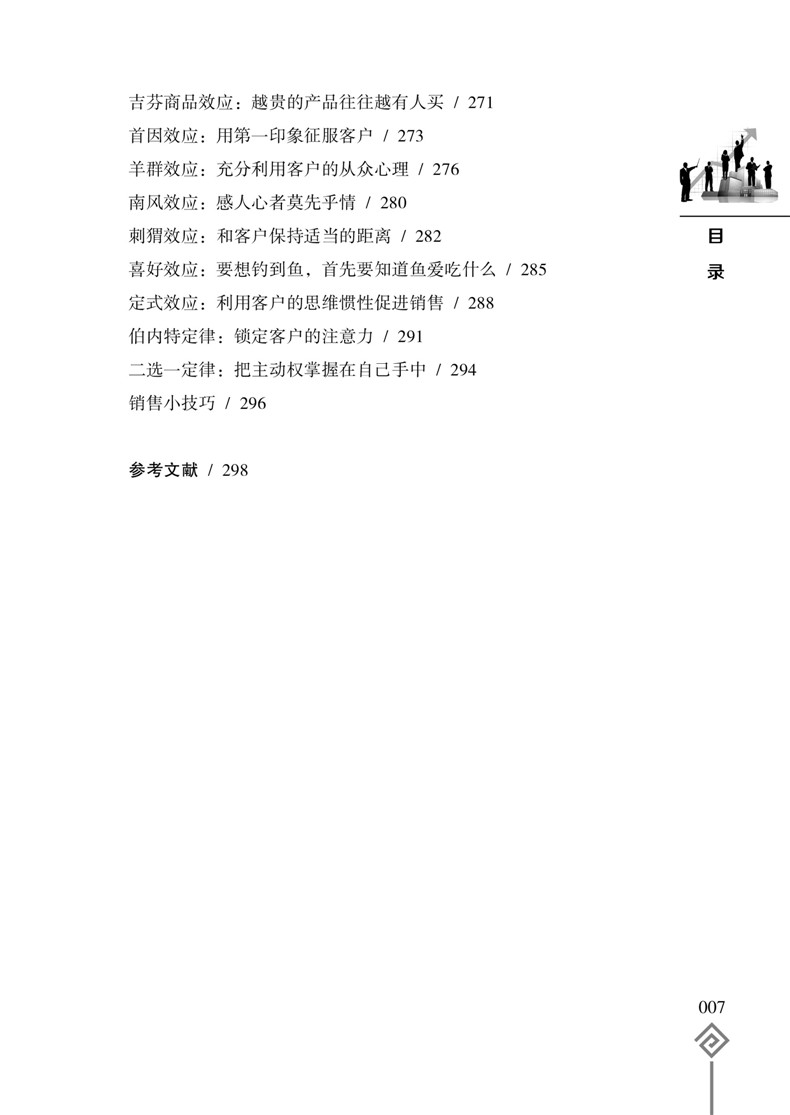 销售并不难,只要你懂得客户的心理;成交很容易,只要你掌握销售心理操控术。销售心理操控的目的就是为了摸透客户的心理,赢得客户的信任,打开客户的心扉,激发客户的购买欲望。可以说,销售就是一场心理博弈战,谁能够掌控客户的内心,谁就能成为销售的终赢家!《销售员心理课》把心理学知识和销售实践紧密地结合在一起,将攻心术运用到销售的实战中,从客户需求、客户相貌、客户沟通、客户心理弱点、商务谈判、客户肢体语言、适当抬高客户等方面,分析总结了操控客户心理的各种方法技巧,为广大销售人员提供一种通过心理策略的运用达到操控客户心理、实现产品销售的技术,开辟了一条成为销售员的捷径
