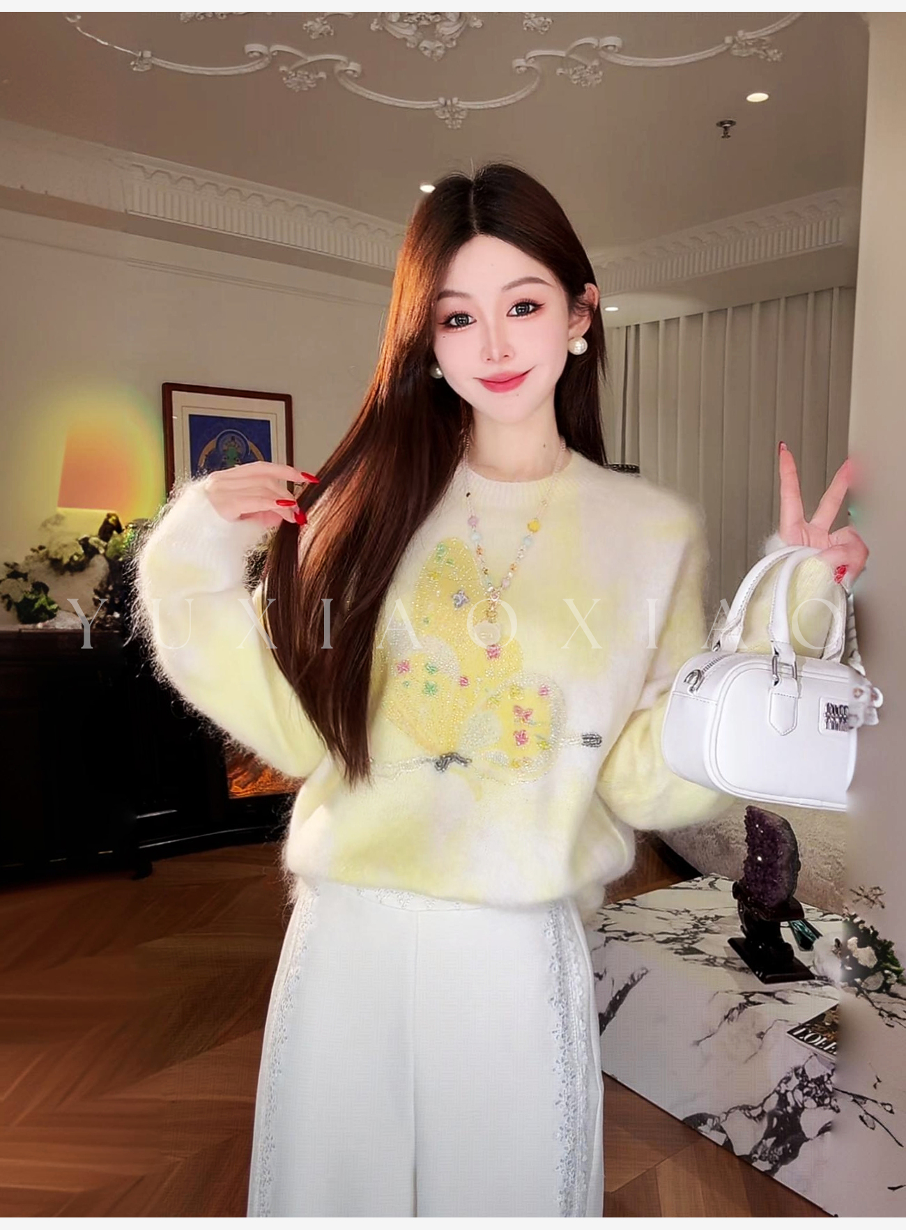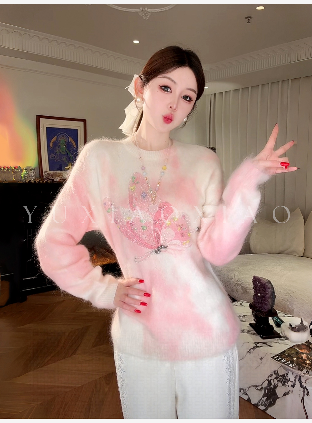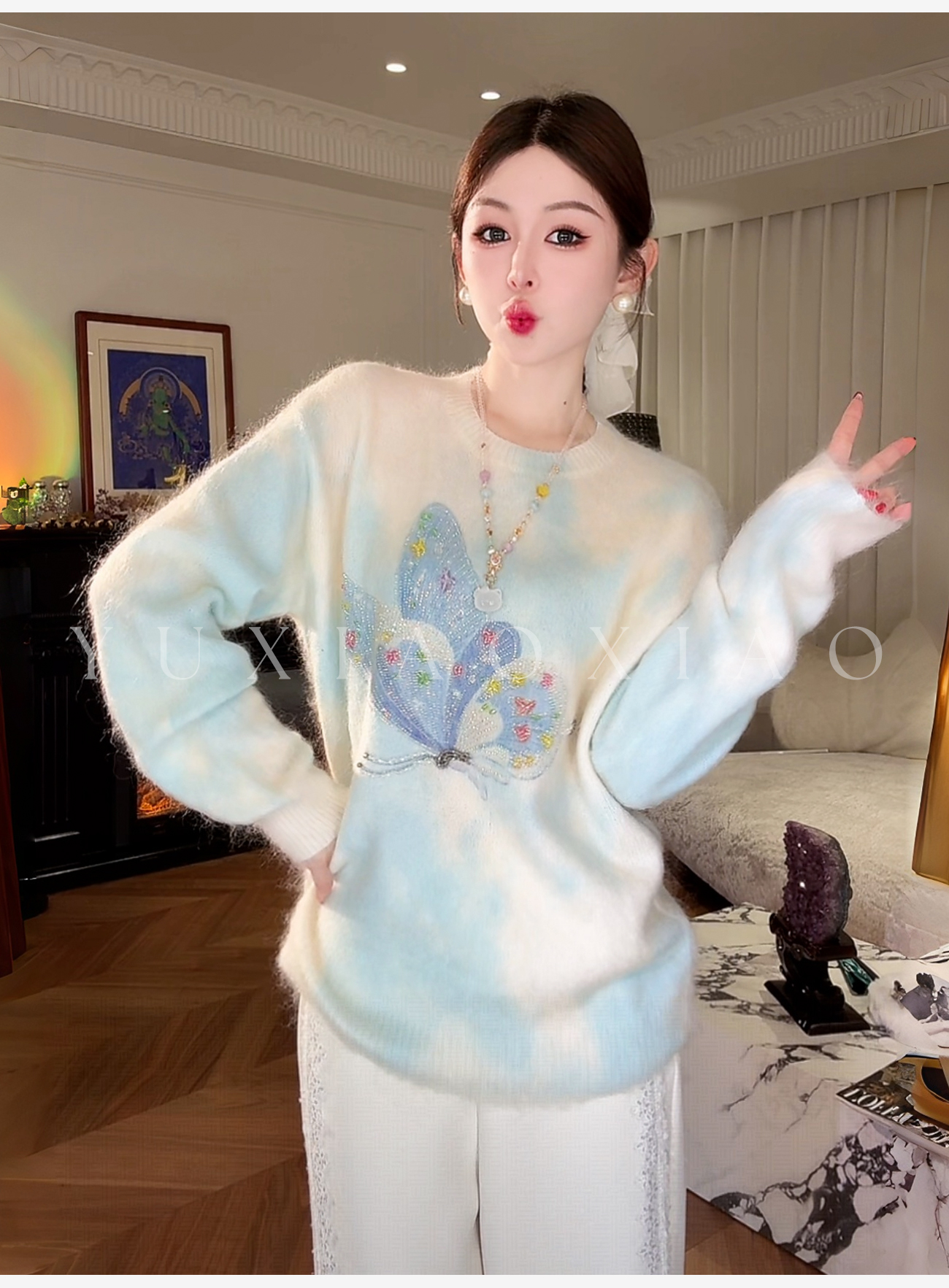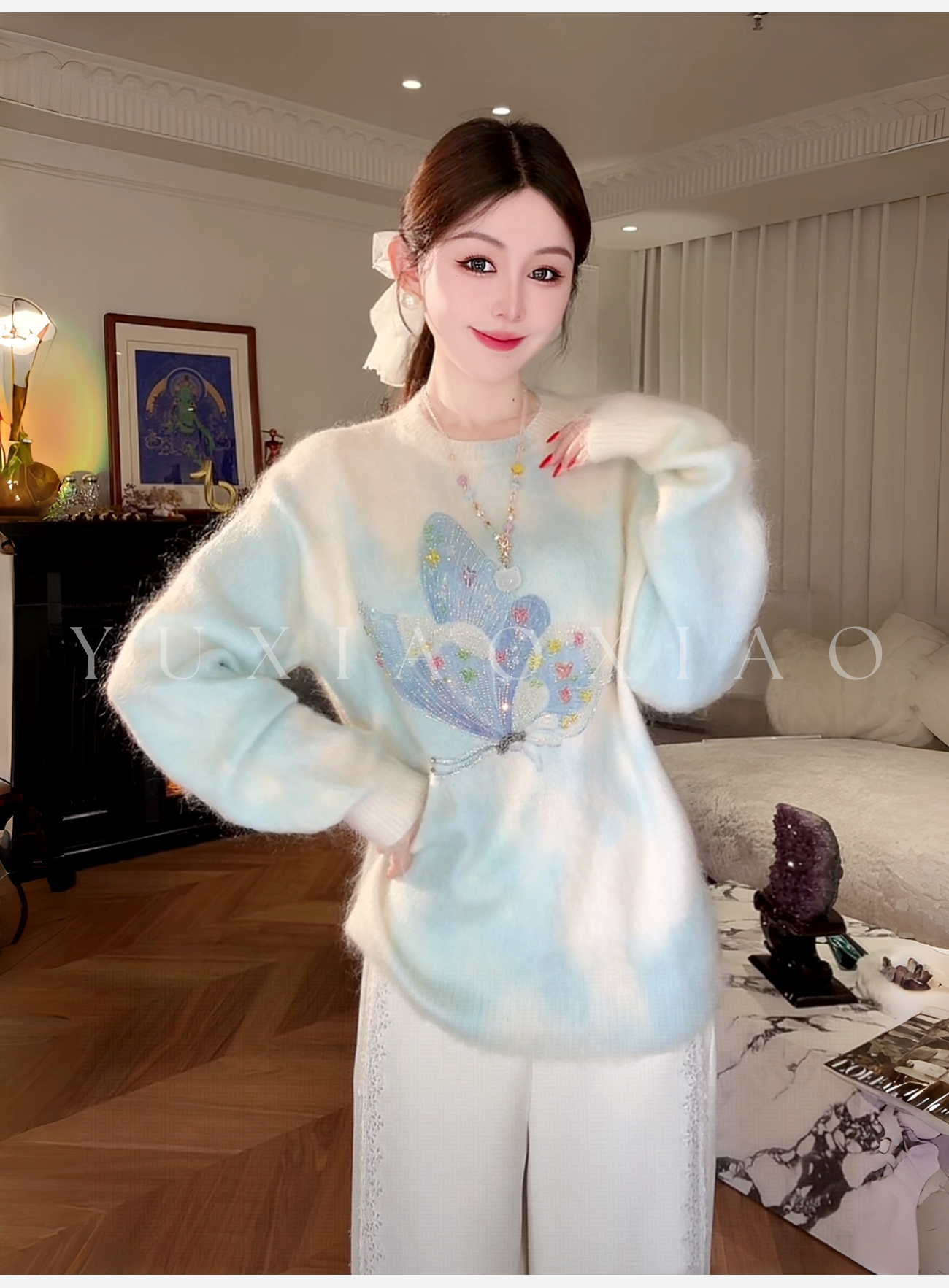 余潇潇【花间蝶语】绵羊毛马海毛混纺晕染蝴蝶烫钻圆领长袖毛衣