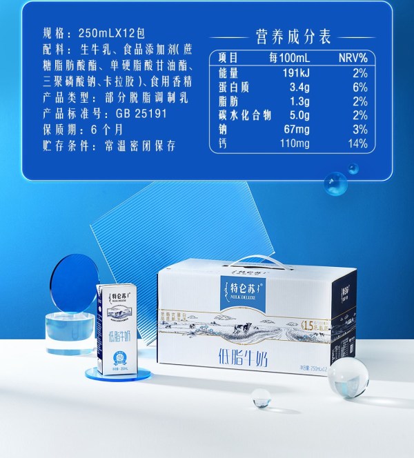 蒙牛特仑苏低脂牛奶苗条装250ml×12/箱