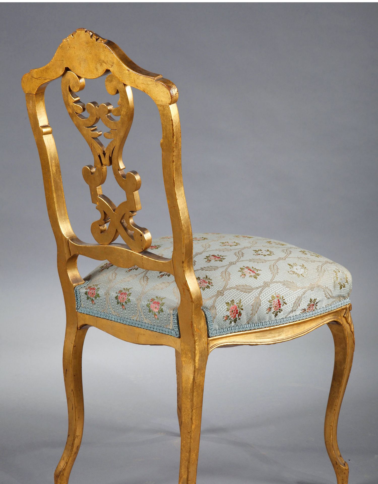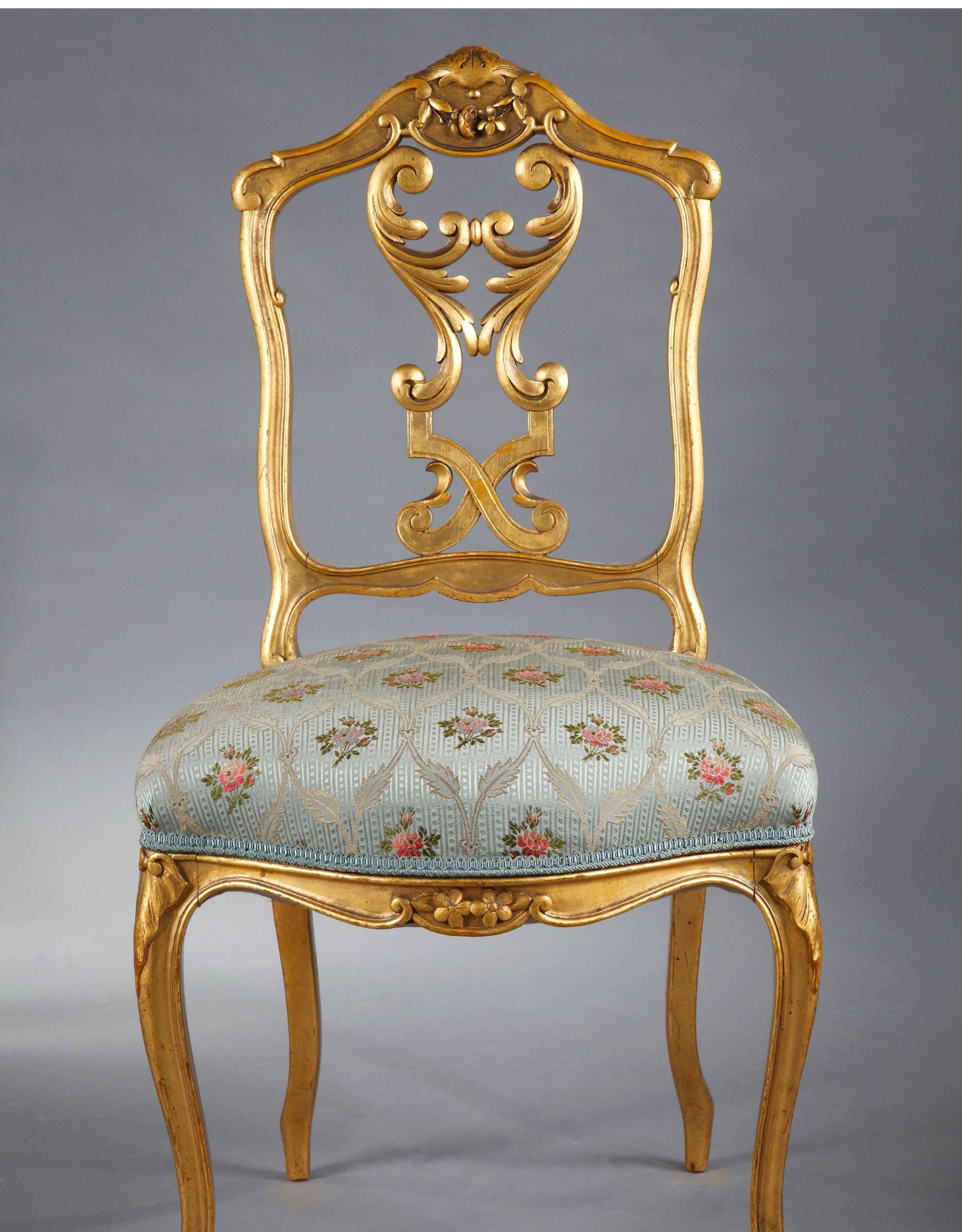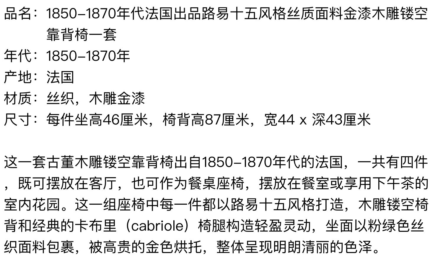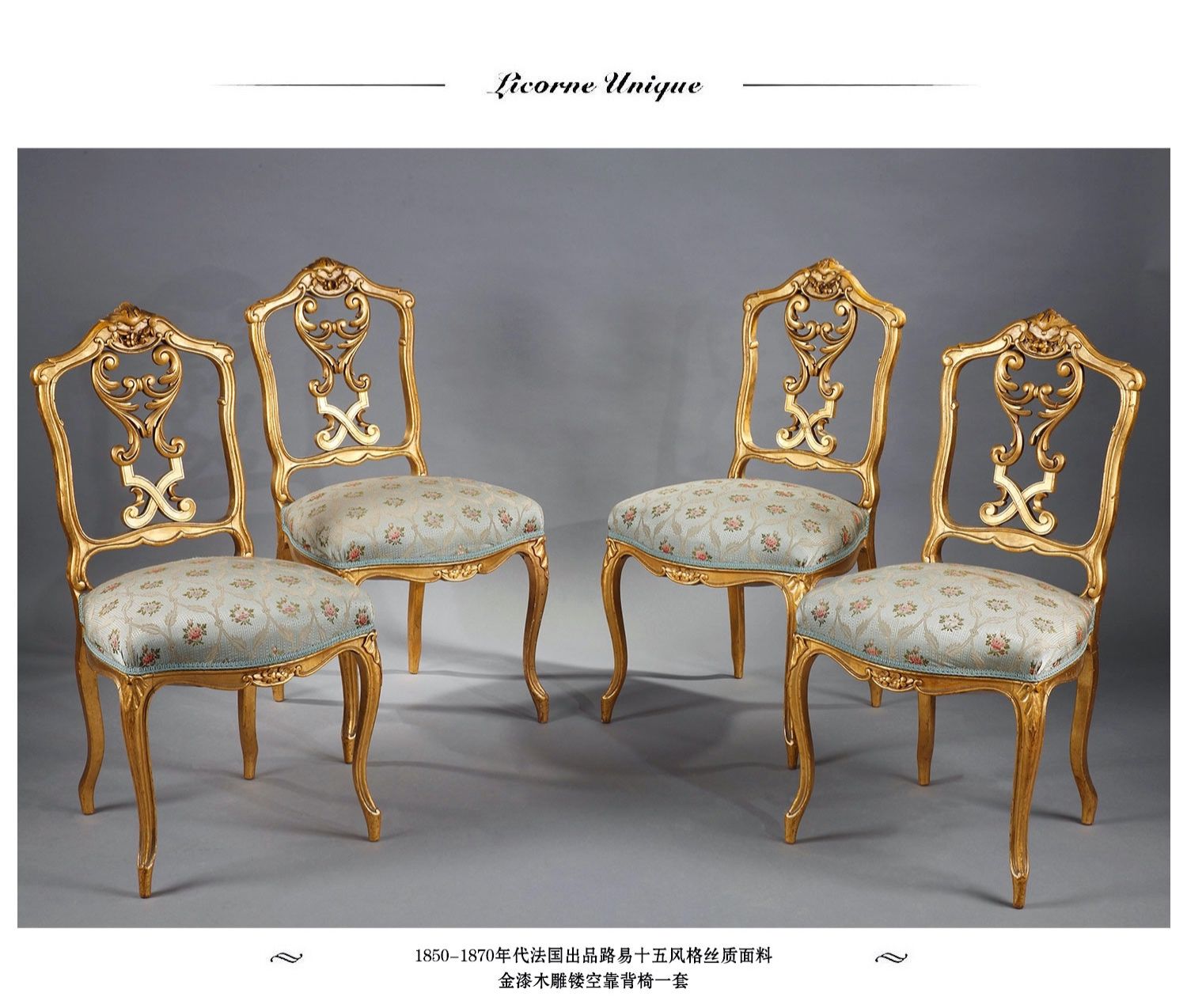 独角鹿西洋古董家具路易十五风格丝质面料金漆木雕镂空靠背椅一套