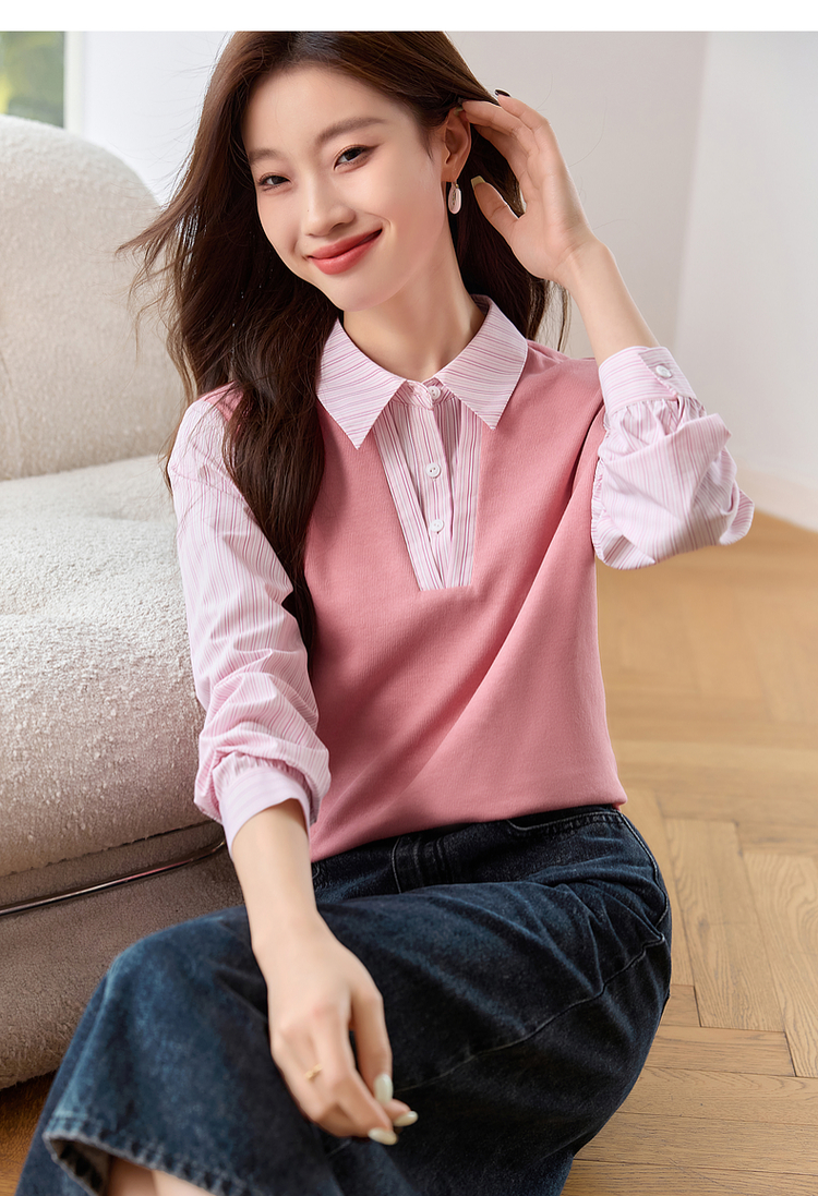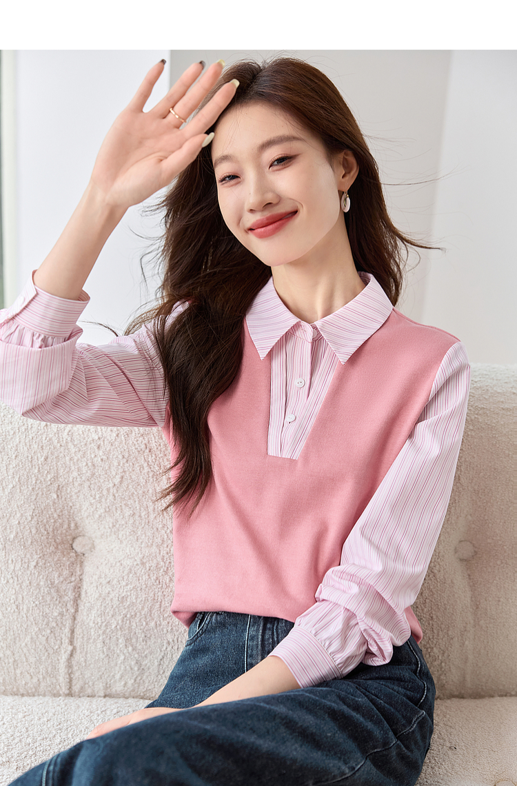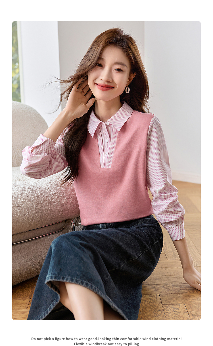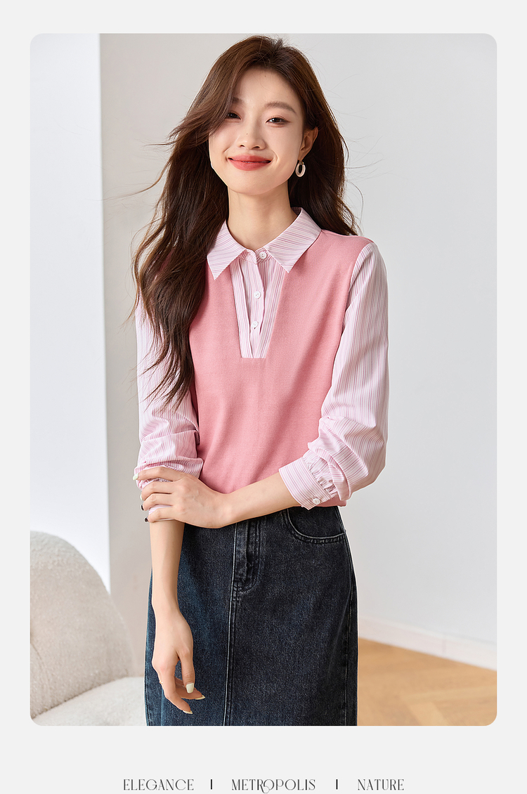 【59元福袋不支持退换】熙世界设计感假两件衬衫秋装新款长袖条纹衬衣拼接针织休闲上衣