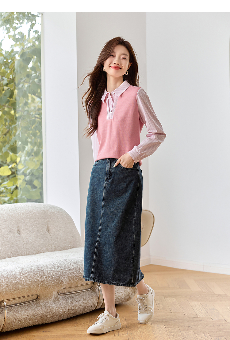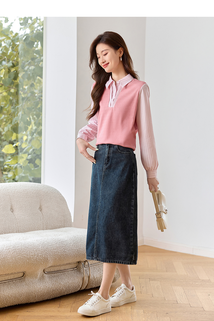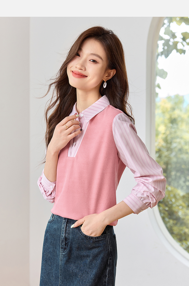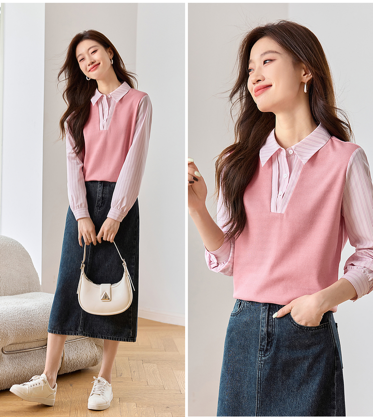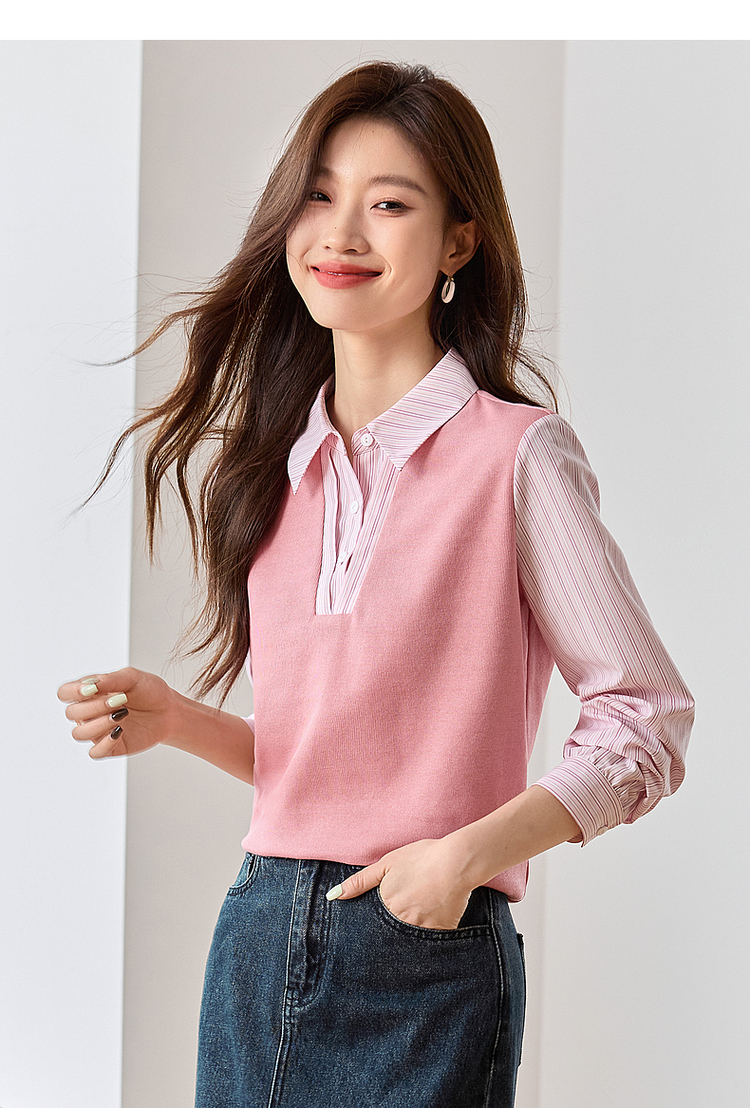 【59元福袋不支持退换】熙世界设计感假两件衬衫秋装新款长袖条纹衬衣拼接针织休闲上衣