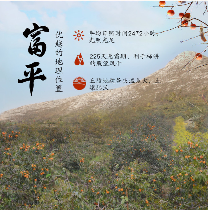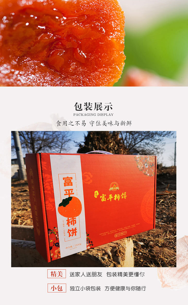 【产品规格】富平溏心柿饼:1斤(500g*1袋),3斤(500g*3袋),5斤(500g*5袋),3斤礼盒装,5斤礼盒装;常规款每斤约13枚左右,特大果每斤约9枚左右。
