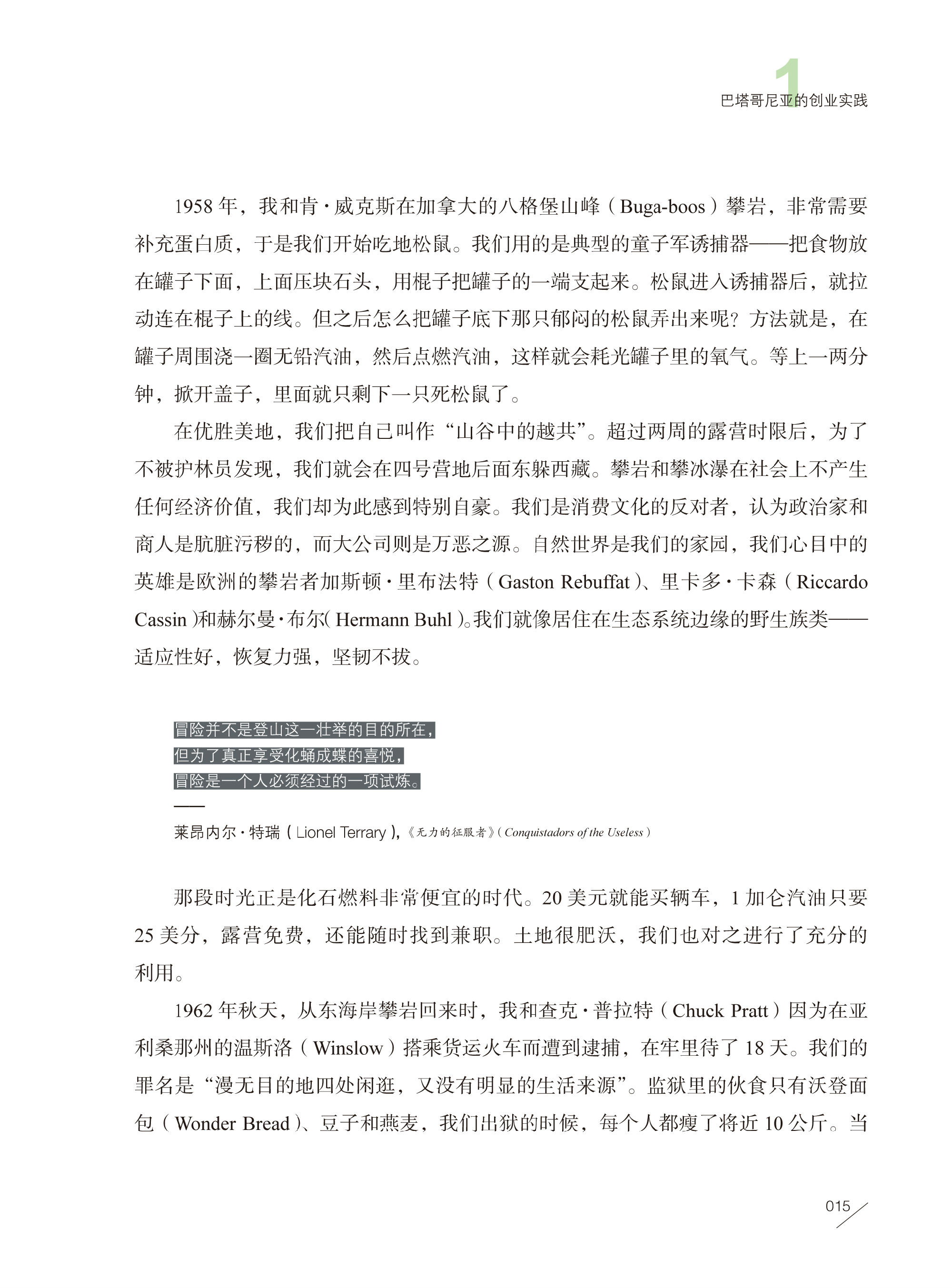 读完整本书,这句话在我脑中挥之不去。在日常生活中,作为消费者,我们本能地觉得企业应该对顾客负责;作为企业的管理者或经营者,这个负责任的对象也许会变为股东或雇员。在这本书中,伊冯·乔伊纳德提出了这个问题,并通过描述他的创业经历、反思他的创业哲学,把这个问题的答案楔进了读者的大脑,仿佛巴塔哥尼亚公司最初生产的超级坚固耐用的岩钉。
