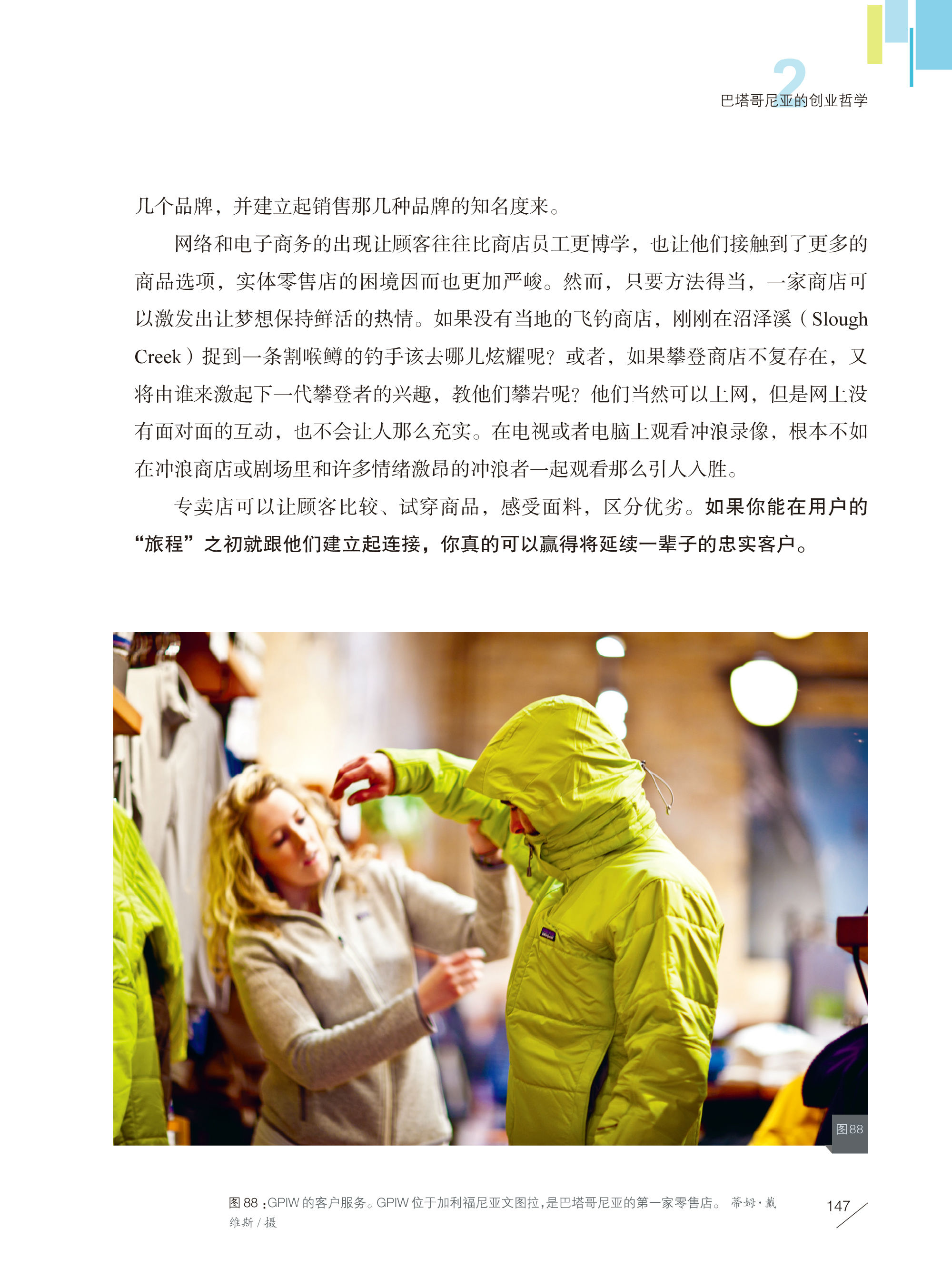 现在,大部分缝制巴塔哥尼亚服装的人都不会穿着这些服装。然而,尽可能地雇用巴塔哥尼亚真正的顾客,这仍然是我们雇人的首要原则。我们希望使用自己设计、制作和销售的服装,这样我们就和自己的产品建立了直接的联系,不用努力“像顾客一样思考”;但作为顾客,当一件产品不能满足我们的期待,我们就会感到不安,当它满足了我们的期待,我们则会感到自豪。我无法想象任何一家想要生产同类最佳产品的公司会雇用对产品毫无热情、毫不在乎的人。