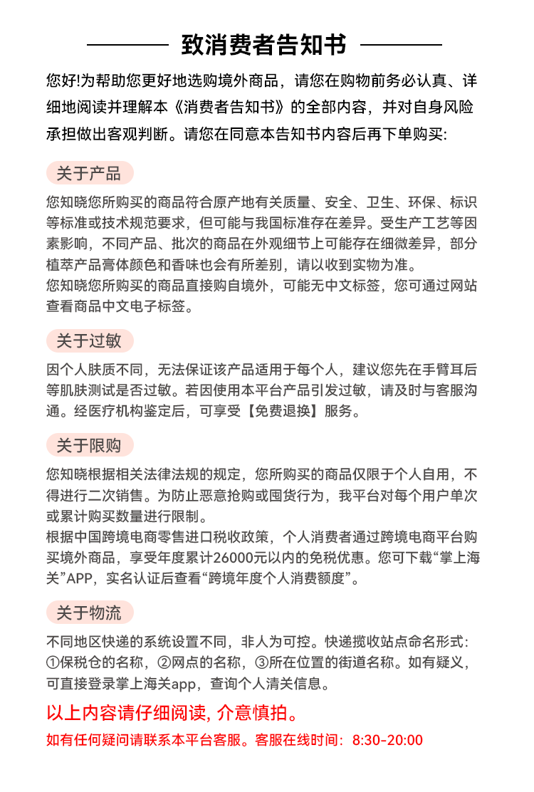 跨境商品不支持七天无理由退货,介意勿拍!!!