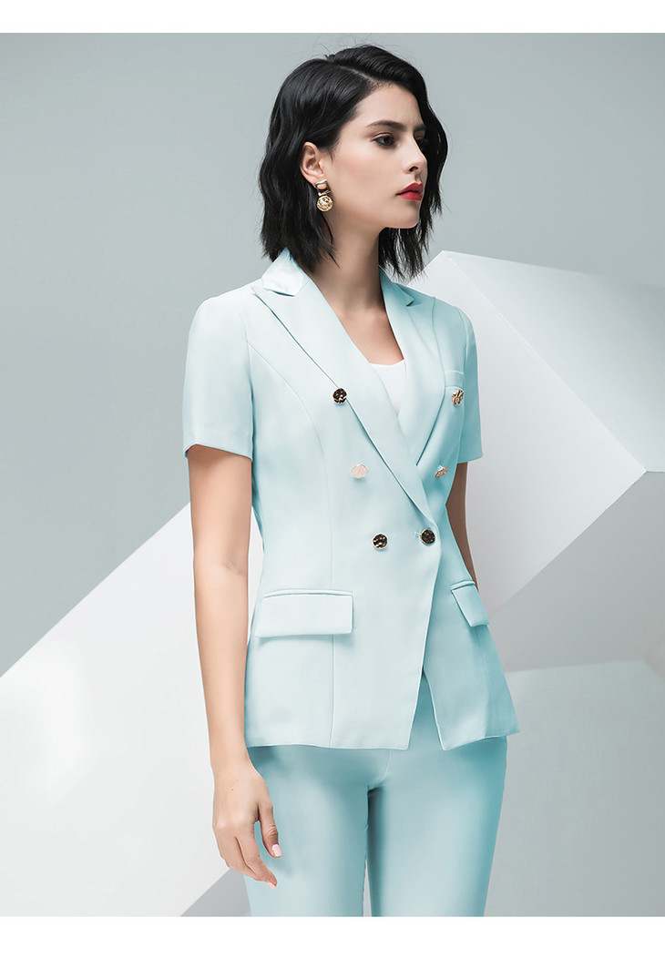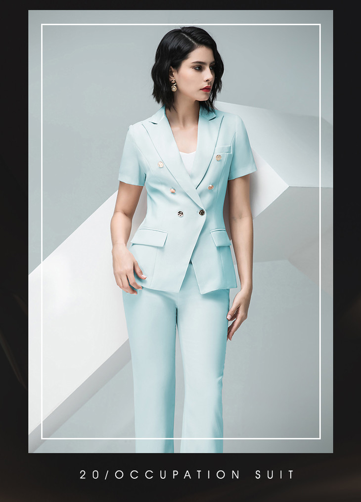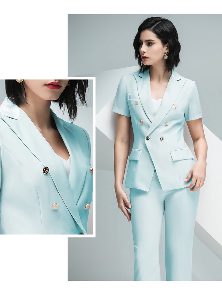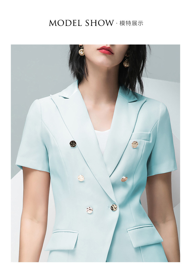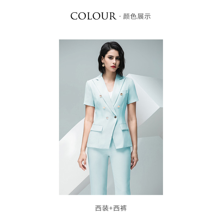 IWY/高端孔雀蓝色西服短袖女西装套装通勤高级通勤设计感ol工作服232020CP1